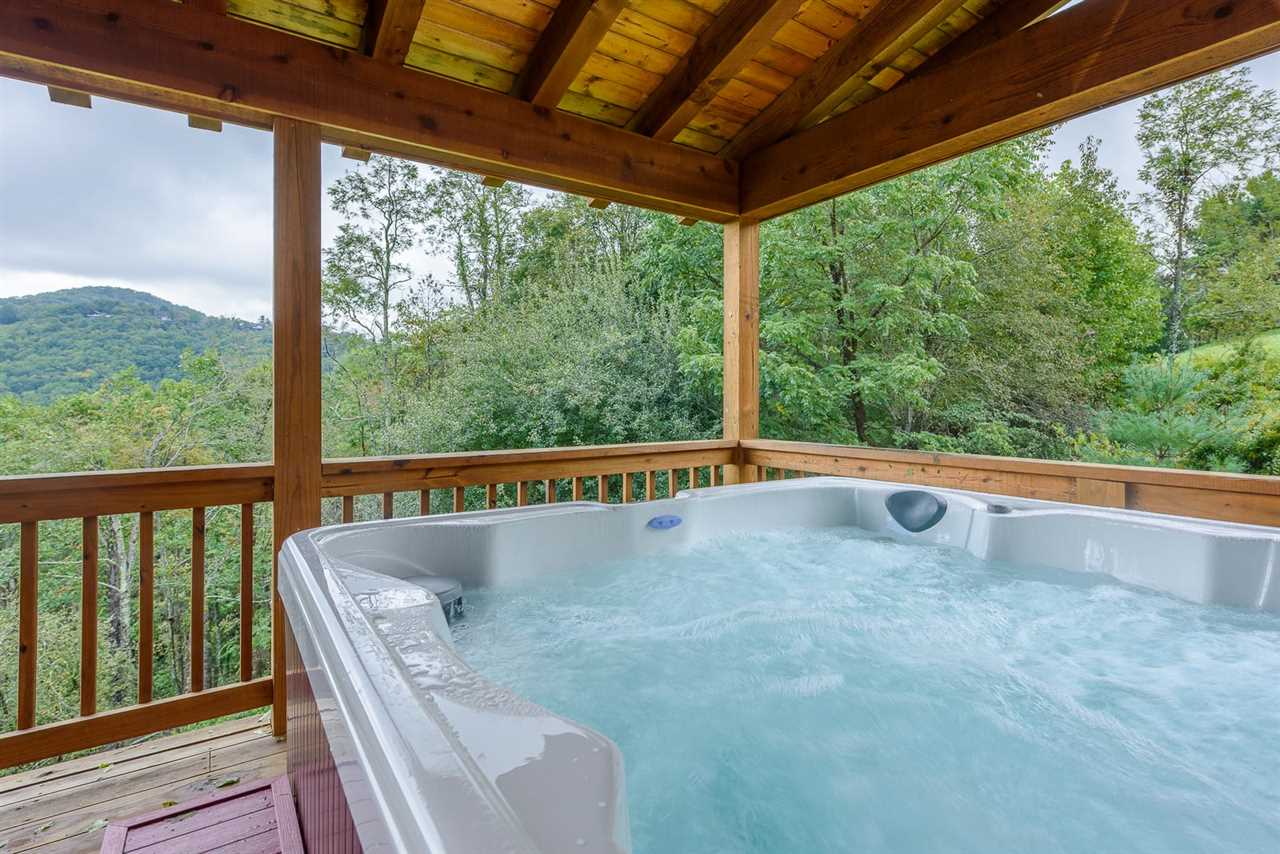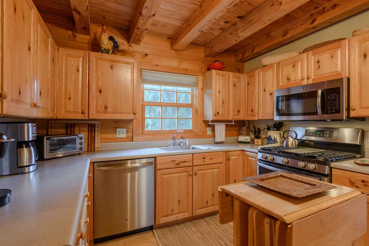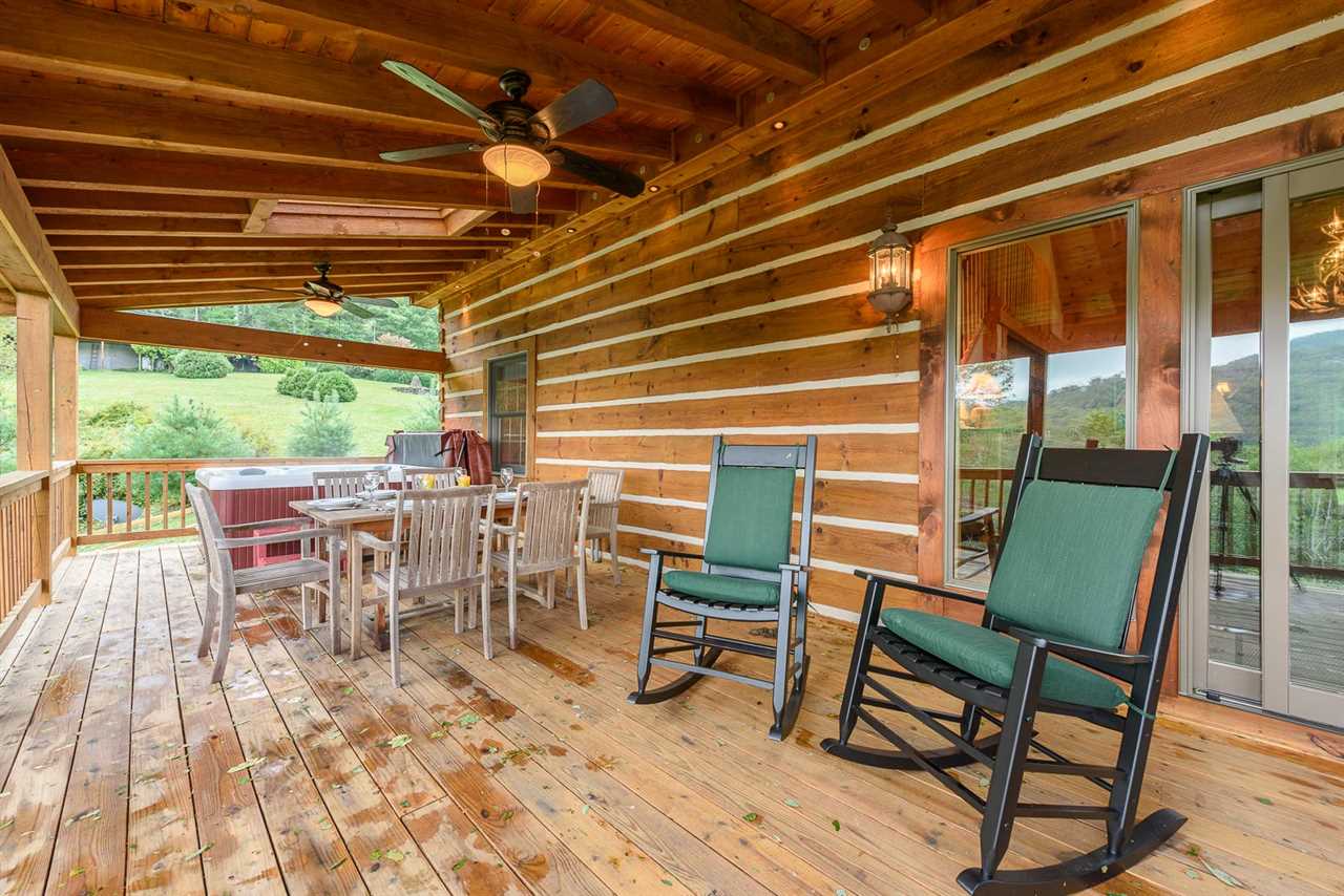 An open-concept great room with vaulted tongue-and-groove ceilings, leather furniture, a stone wood-burning fireplace (not available for use in Summer), and a large HDTV share space with the dining area. The kitchen has stainless appliances and a gas cooktop. The dining area has a banquet-style dining table which can expand to seat up to eight (8) guests. Sliding glass doors open to a large covered porch on the rear with outdoor dining and entertainment furniture, skylights and ceiling fans, a gas grill, and a hot tub, all overlooking miles of unobstructed mountain views.