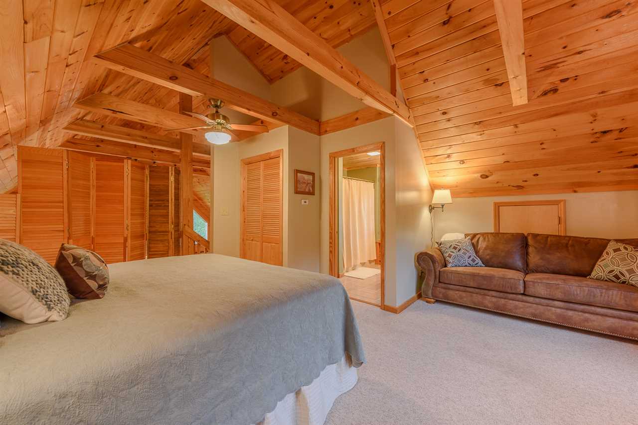 Upstairs is a loft-style bedroom suite with a king bed, an HDTV, and a queen-size sofa. There is a second full bathroom upstairs as well, with a combination tub/shower.