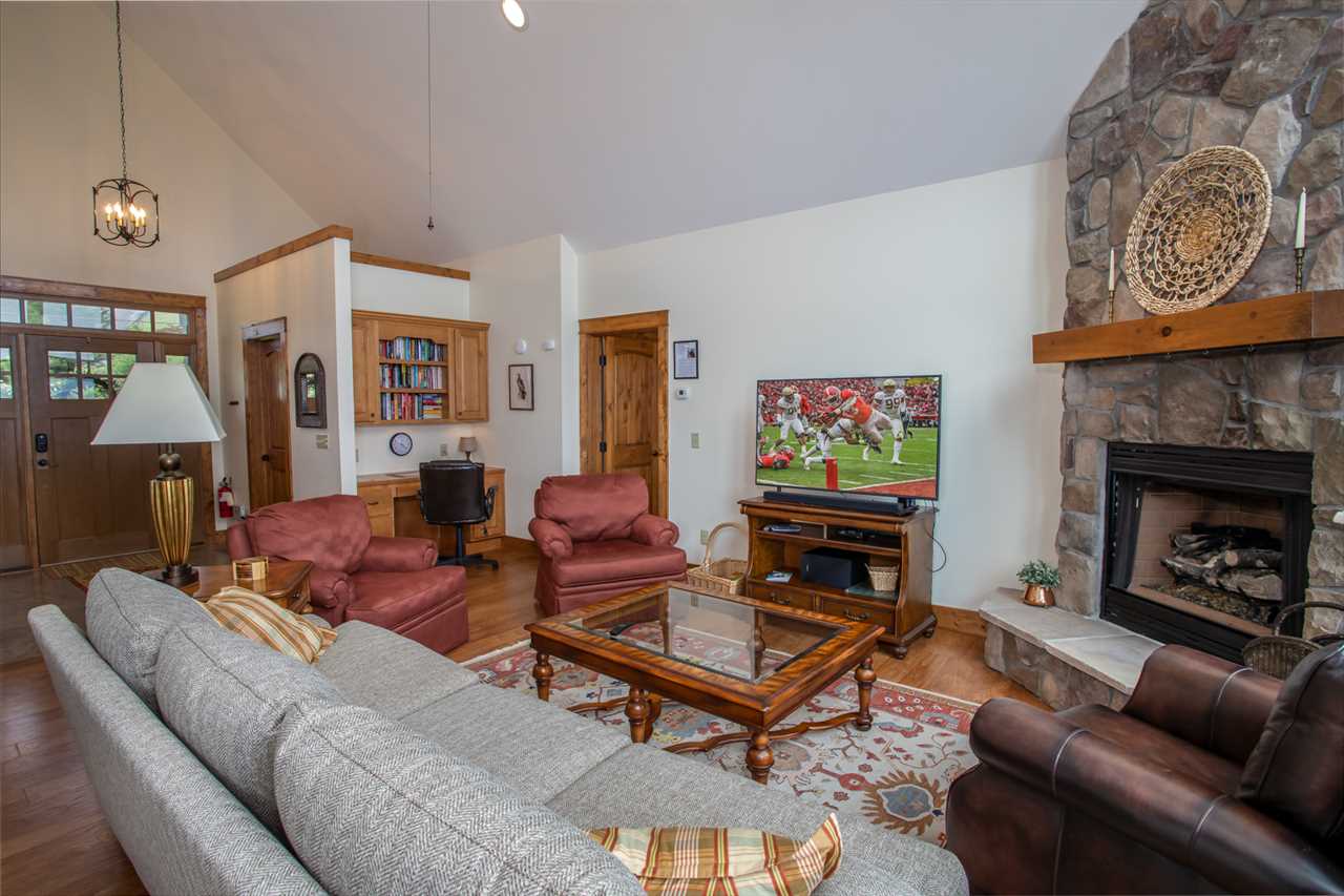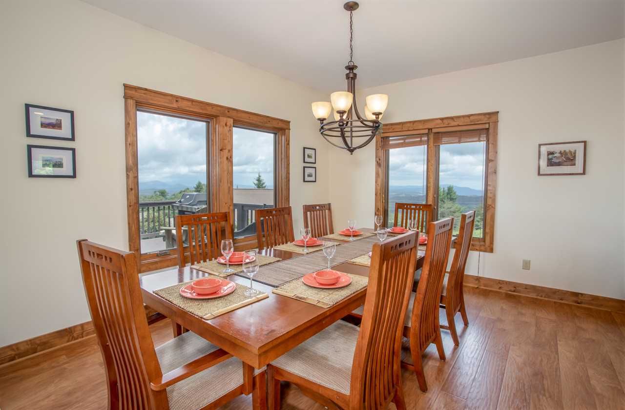 The main level of Bald Eagle Bluff is open and expansive, with wood floors, vaulted ceilings, and huge windows that allow copious sunlight in and frame picturesque, long-range mountain top views. The entry opens into the great room, which features a floor-to-ceiling stone gas-log fireplace, a huge HD Smart TV, and comfortable furniture which can easily accommodate a full house. Glass doors lead out onto the patio, and an upper run of huge windows, look out at panoramic high-elevation mountain views. A built-in desk provides a convenient place to set up a workstation and check in with the "real world," while the overhead bookshelves are filled with books to enjoy during your stay. There is a half bathroom, central and convenient, on the main level off of the foyer.