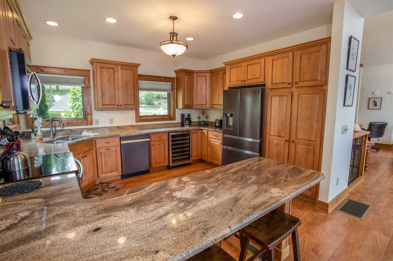 Adjacent to the great room is the open dining area, which features a banquet-style dining table with seating for up to eight. Flanked by oversized windows, the dining area looks out at the lovely yard and has amazing views on both sides. The kitchen is beside the dining area, married in the middle by a generous granite bar top peninsula with bar stool seating. There is ample custom cabinet space, in which you will find a well-stocked assortment of flatware, silverware, and glassware, along with plenty of other tools to both prepare and serve gourmet meals to a full table. All new high-end, brushed nickel kitchen appliances, including a glass cooktop, huge fridge and freezer, and a wine cooler, make this kitchen an incredible amenity for the family who loves to cook.
