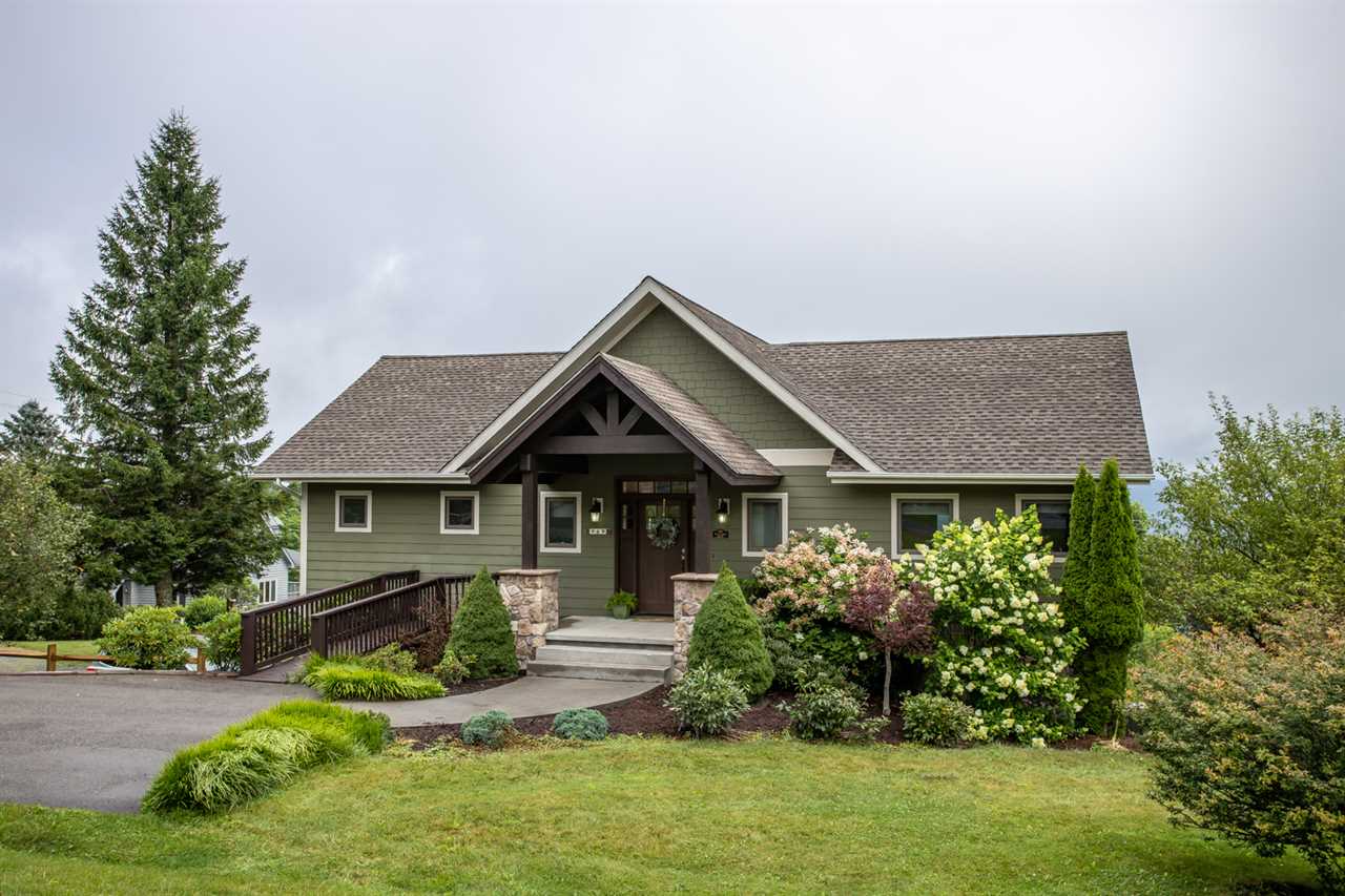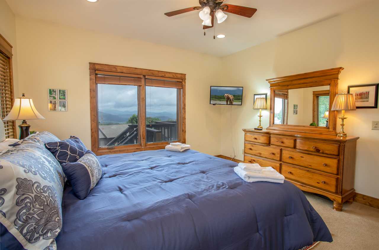 Also on the main level is the primary master suite, which boasts a new designer king bed flanked by bedside tables with lamps. A substantial double window reveals stunning mountain top views. The wall-mounted HDTV and huge lowboy dresser complete the bedroom. The private ensuite master bathroom offers a "his and hers" granite vanity with under-mount sinks. The shower is massive, with custom tile work and built-in seating.