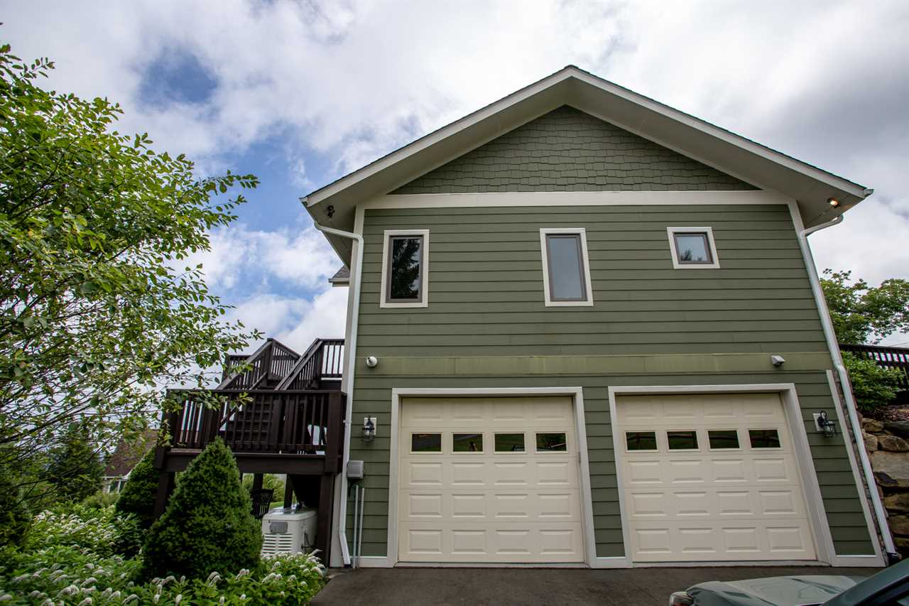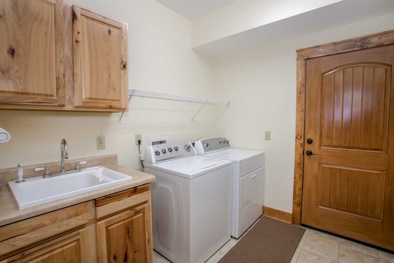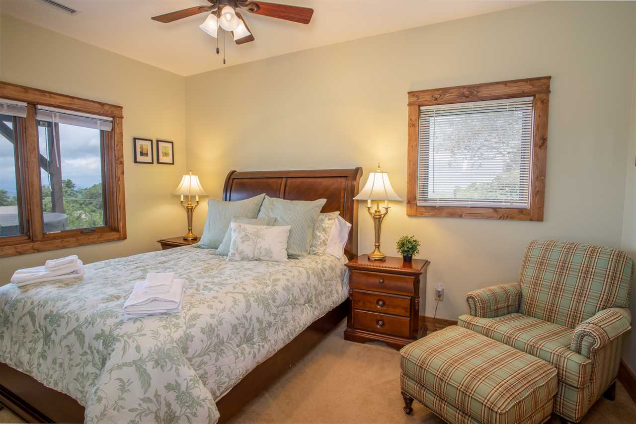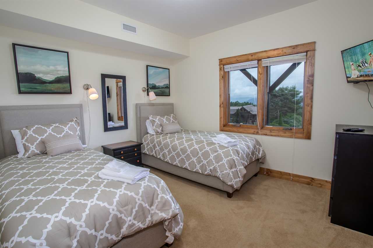 The lower level of Bald Eagle Bluff offers two more bedrooms, each with an HDTV. Both have windows that frame mountain views. One bedroom has a queen bed, a comfy chair, an ottoman, and a private door into the lower-level bathroom with a tub/shower combo. The other lower-level bedroom features two twin-XL beds and is just down the hall from the lower-level bathroom. There is a laundry room with a washer and dryer downstairs and an inner door that leads into the large two-car attached garage.