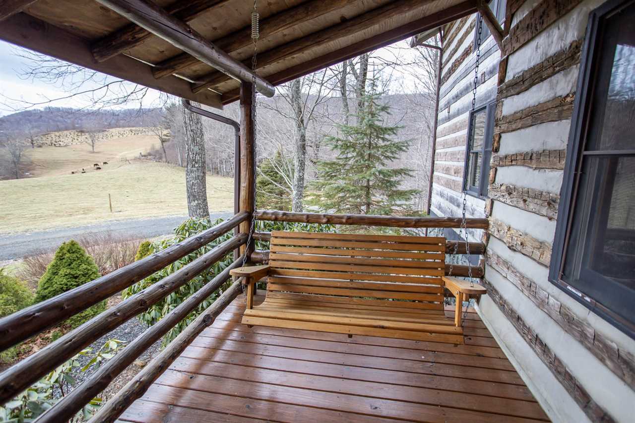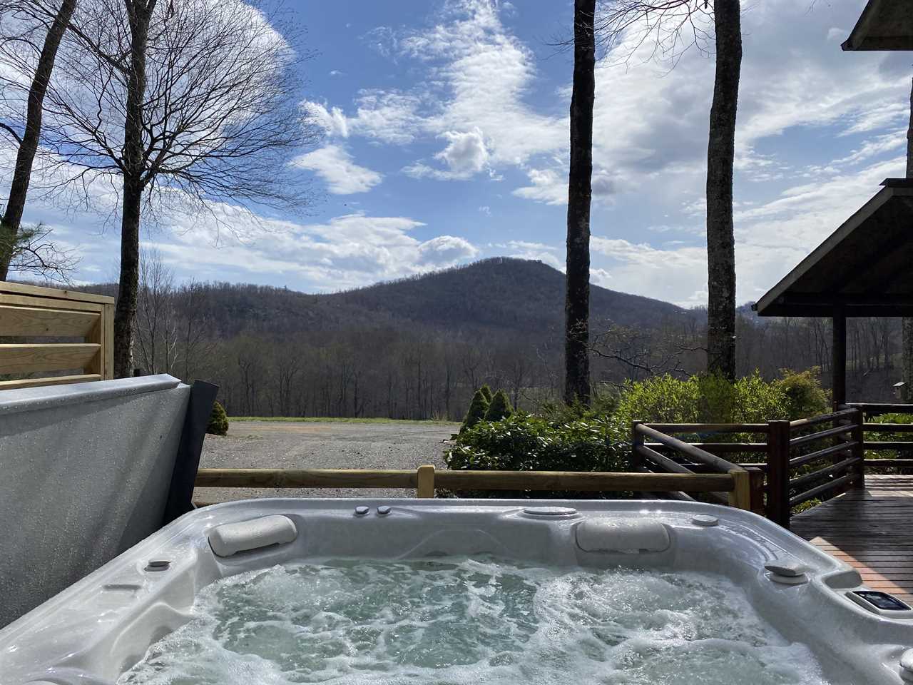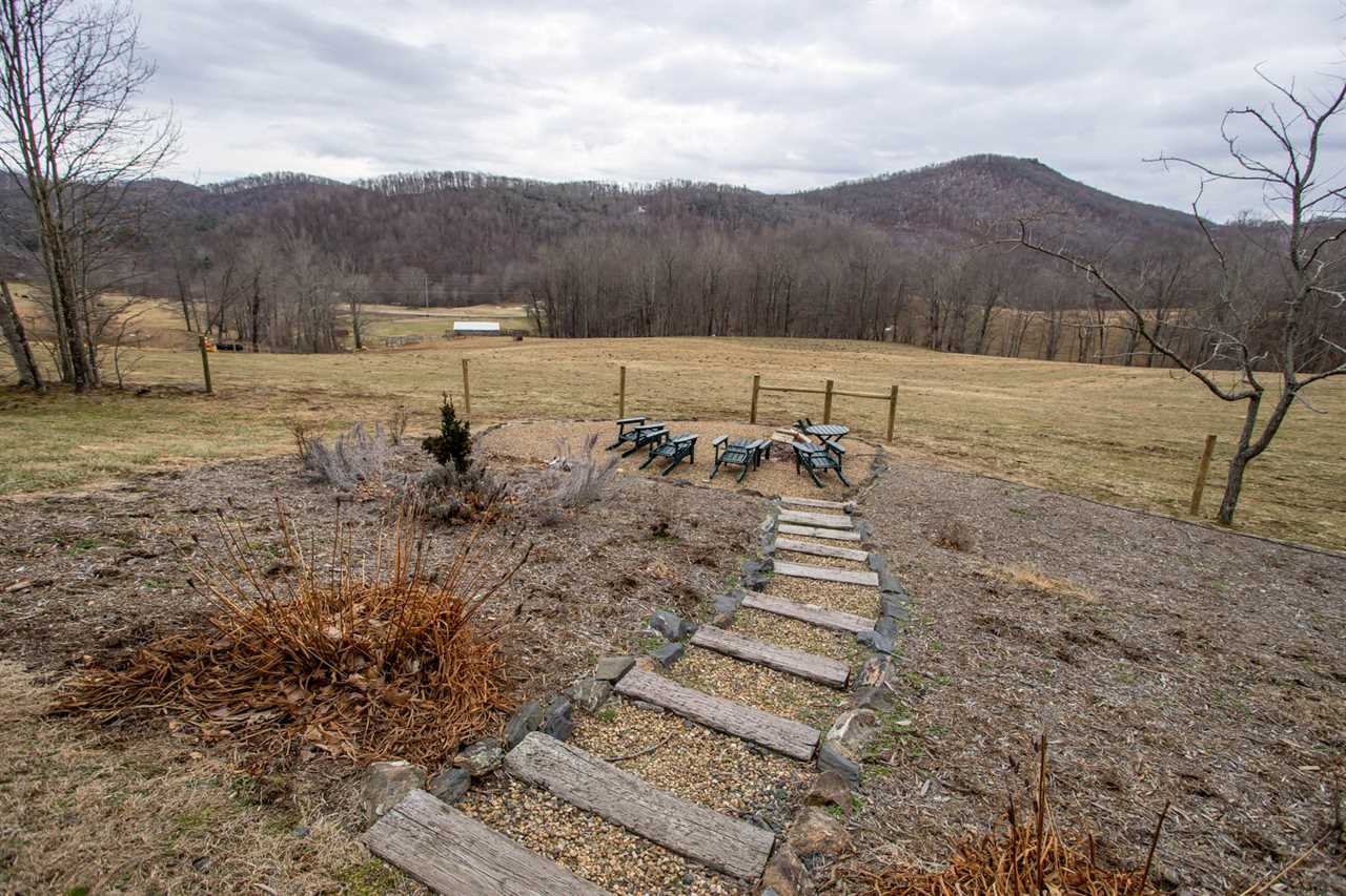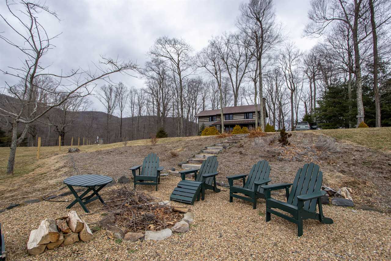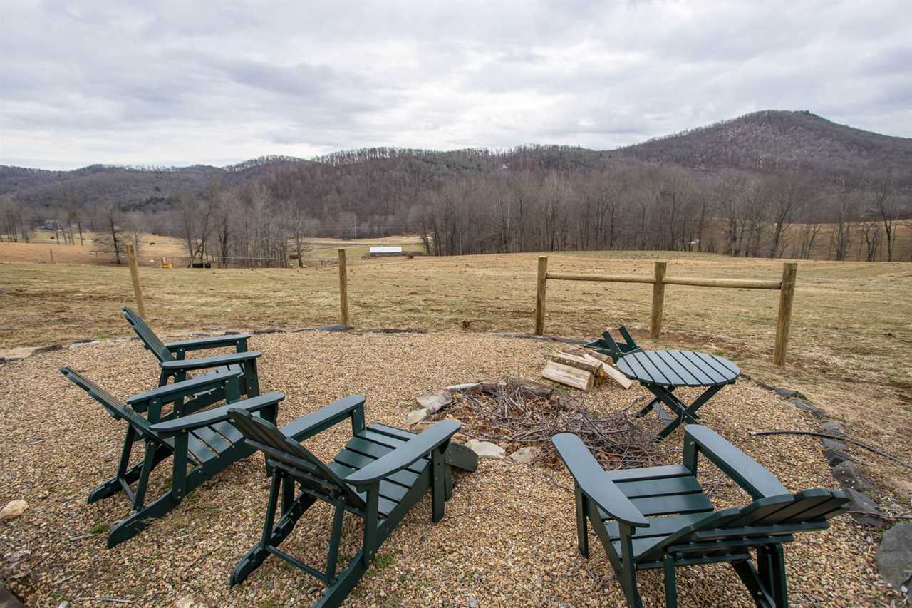 You will find a gas grill, plenty of outdoor seating, and a new hot tub on the expansive open patio. The screened porch beside the patio features an outdoor dining table, more comfy outdoor seating, and two fun hammock-style suspended chairs. At the front of the cabin is the covered front porch with a porch swing and level entry into the main floor. There is level entry into the lower floor. The wood-burning fire pit, an easy walk from the front porch, features pastoral mountain views, natural mountain surroundings, and Adirondack-style armchair seating. The gravel driveway with parking at the front and a one-car attached garage six steps down from the front door to the side provides ample parking for numerous vehicles.