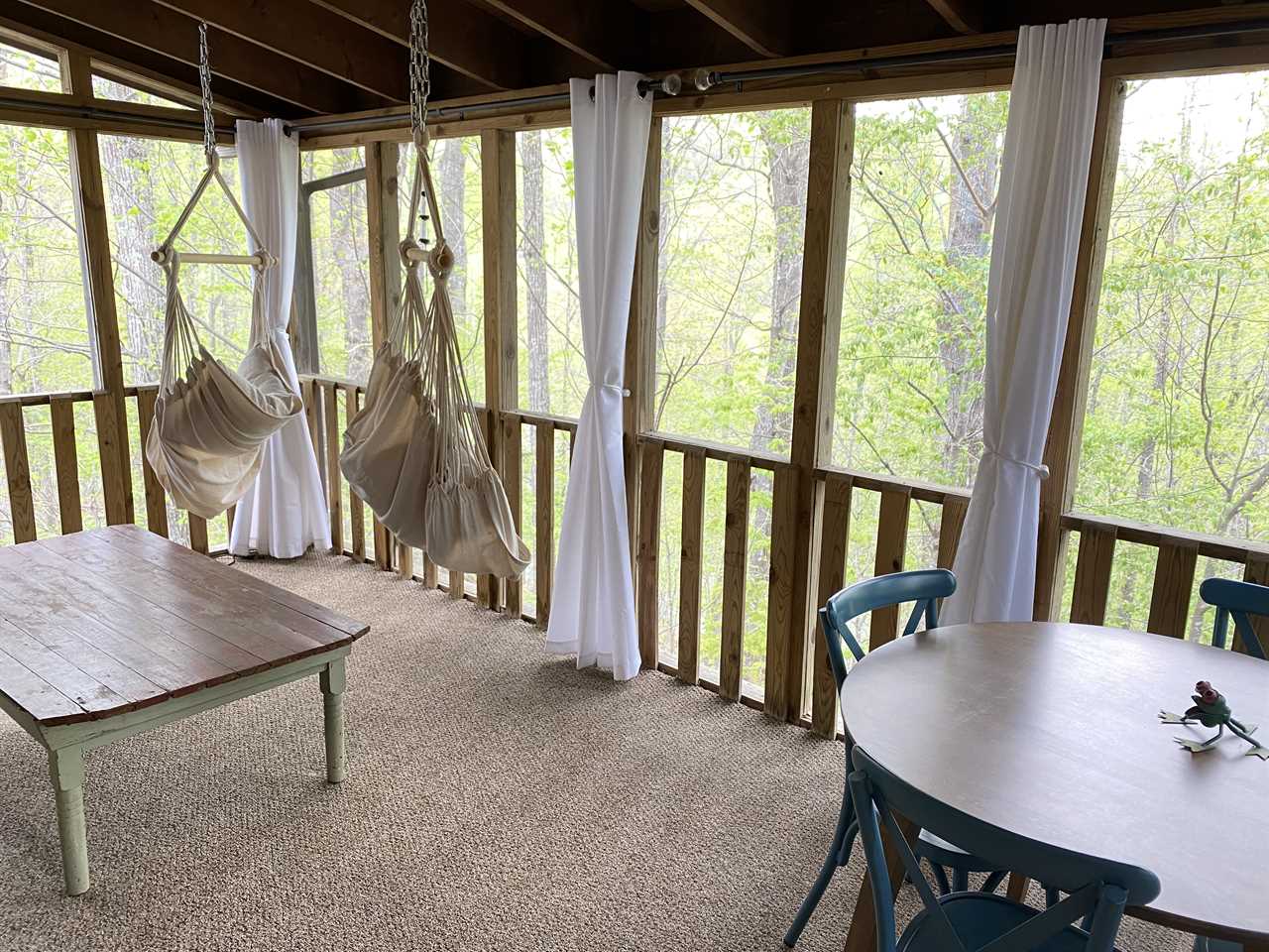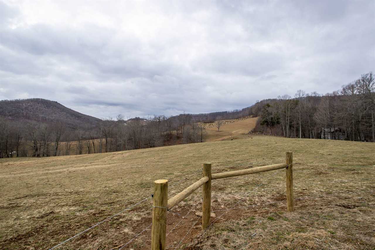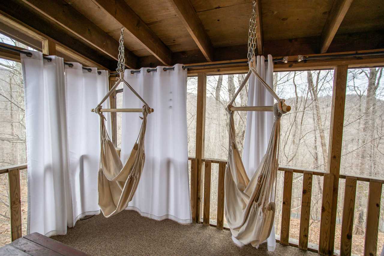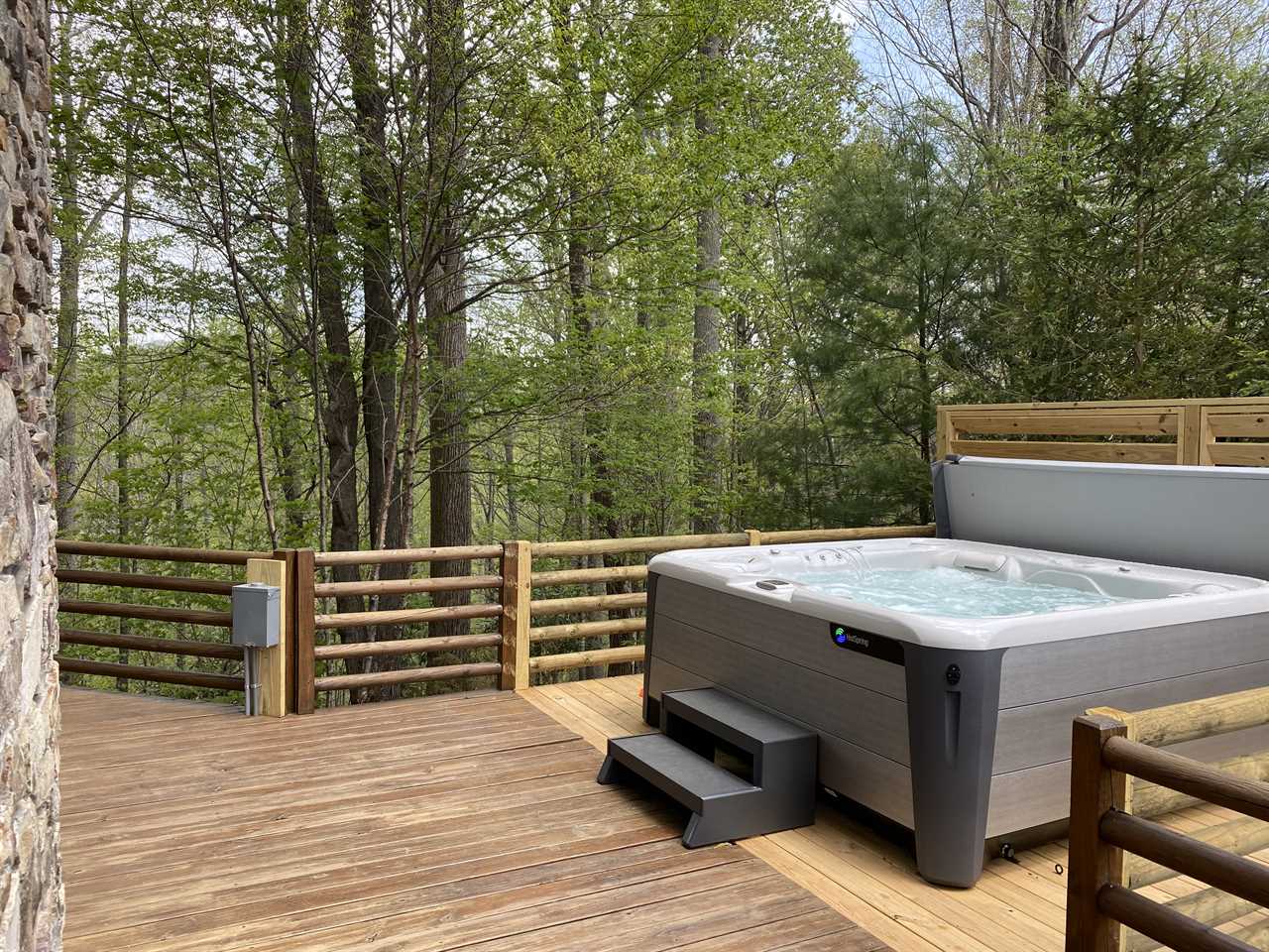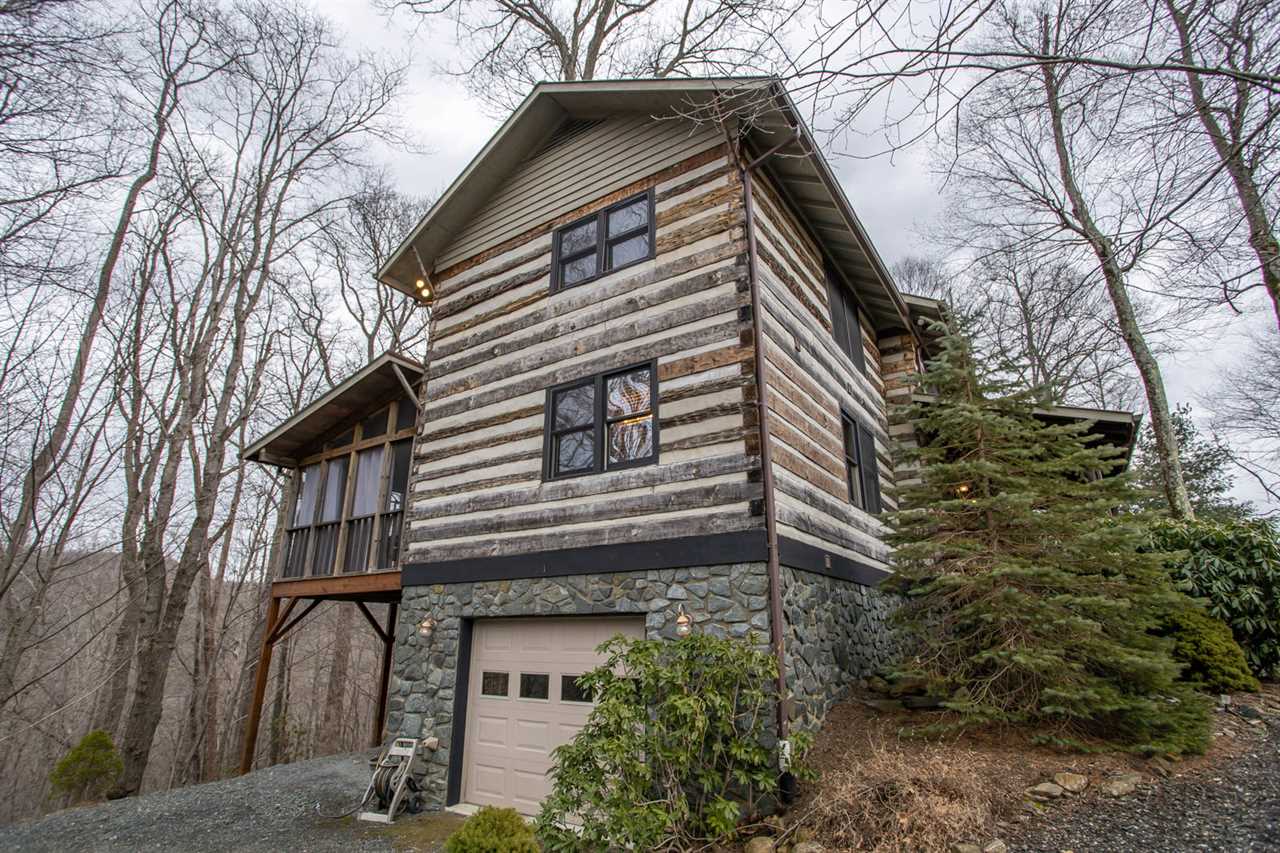 You will find a gas grill, plenty of outdoor seating, and a new hot tub on the expansive open patio. The screened porch beside the patio features an outdoor dining table, more comfy outdoor seating, and two fun hammock-style suspended chairs. At the front of the cabin is the covered front porch with a porch swing and level entry into the main floor. There is level entry into the lower floor. The wood-burning fire pit, an easy walk from the front porch, features pastoral mountain views, natural mountain surroundings, and Adirondack-style armchair seating. The gravel driveway with parking at the front and a one-car attached garage six steps down from the front door to the side provides ample parking for numerous vehicles.