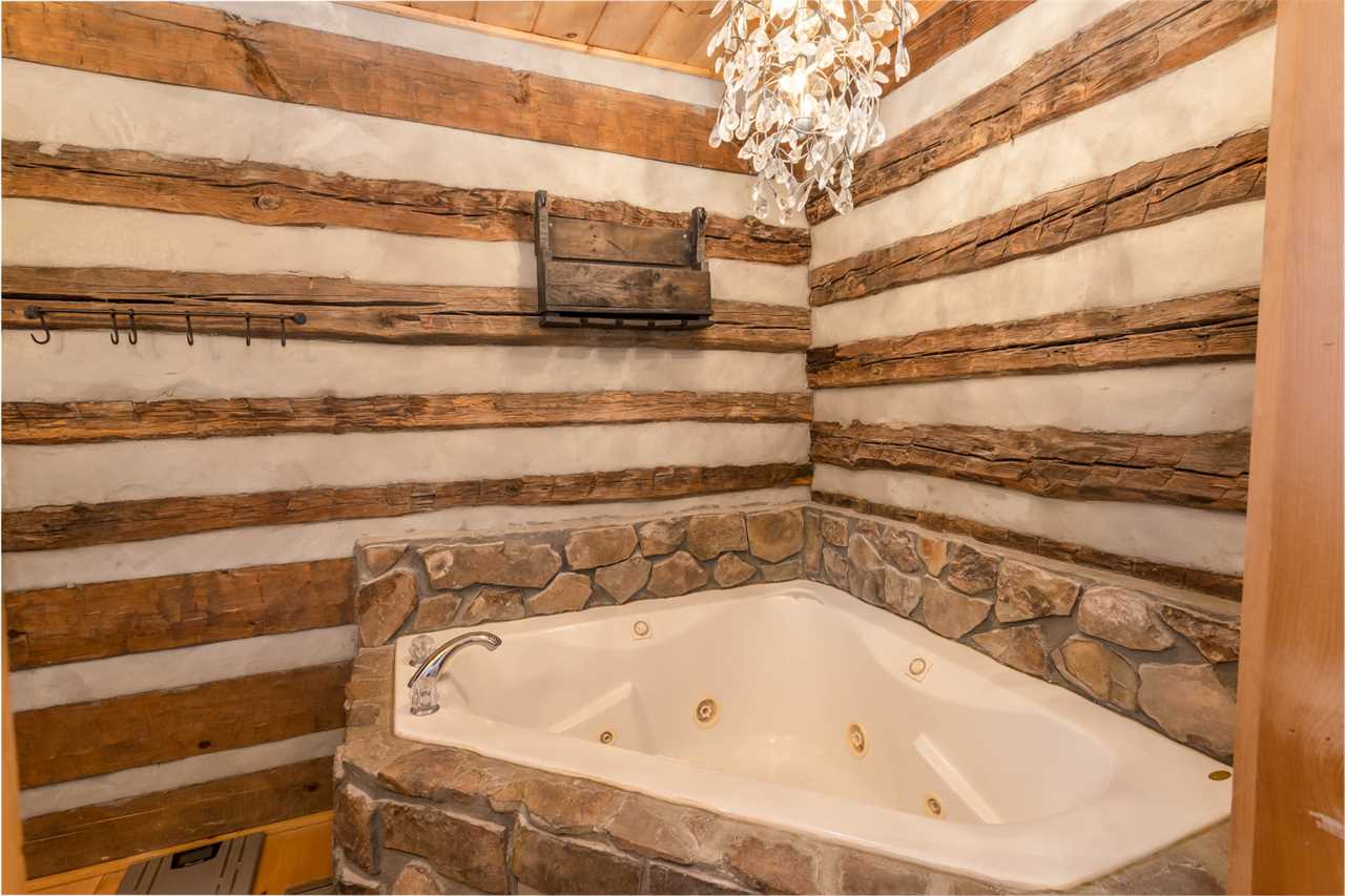 The primary king bedroom is on the main floor, with mountain views and an HD Smart TV. Adjacent to the king bedroom is the main level full bathroom. It has a granite vanity counter, his-and-hers vessel sinks, a jetted soaking tub, a separate level-entry shower, and a private water closet.