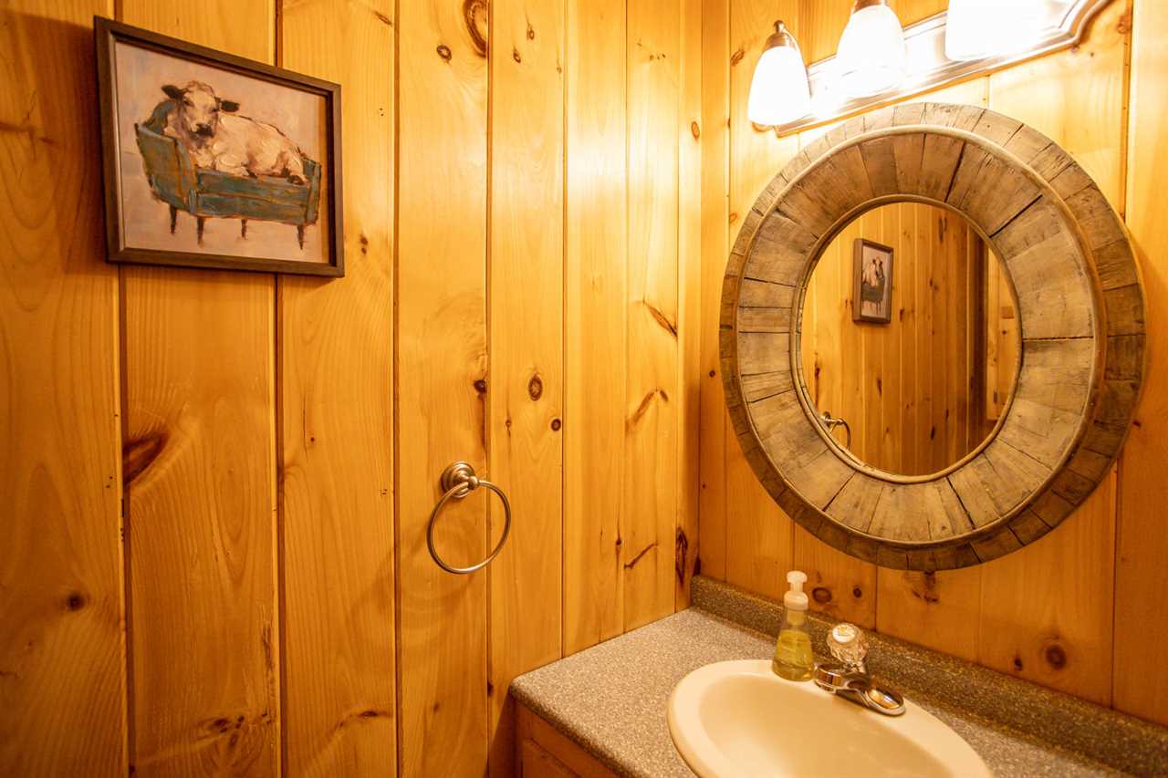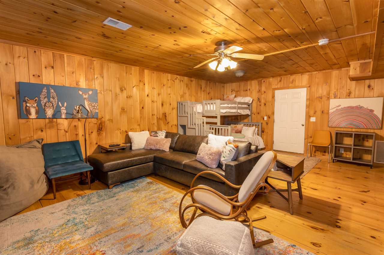 The lower level features a large family room with a stone gas log fireplace, a huge HD Smart TV, and comfy furniture. There is a card table and chairs, board games, working on jigsaw puzzles, and more. Also, to provide even more sleeping options and flexibility, there is a bunk bed nook with a twin-over-full bunk bed, and the sofa is a full-sized sleeper. The attached one-car garage, a half bathroom, and a laundry closet with a washer and dryer are accessible from the lower-level family room.