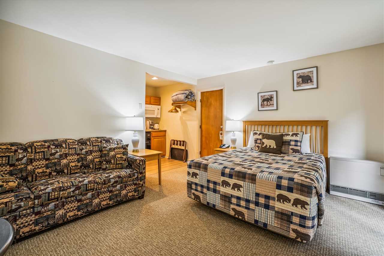 The studio offers a Queen bed, a queen sleeper sofa, and a flat-screen TV