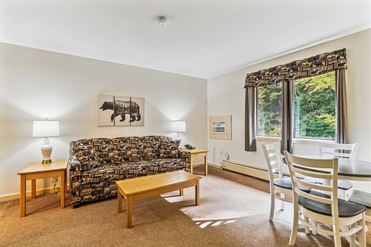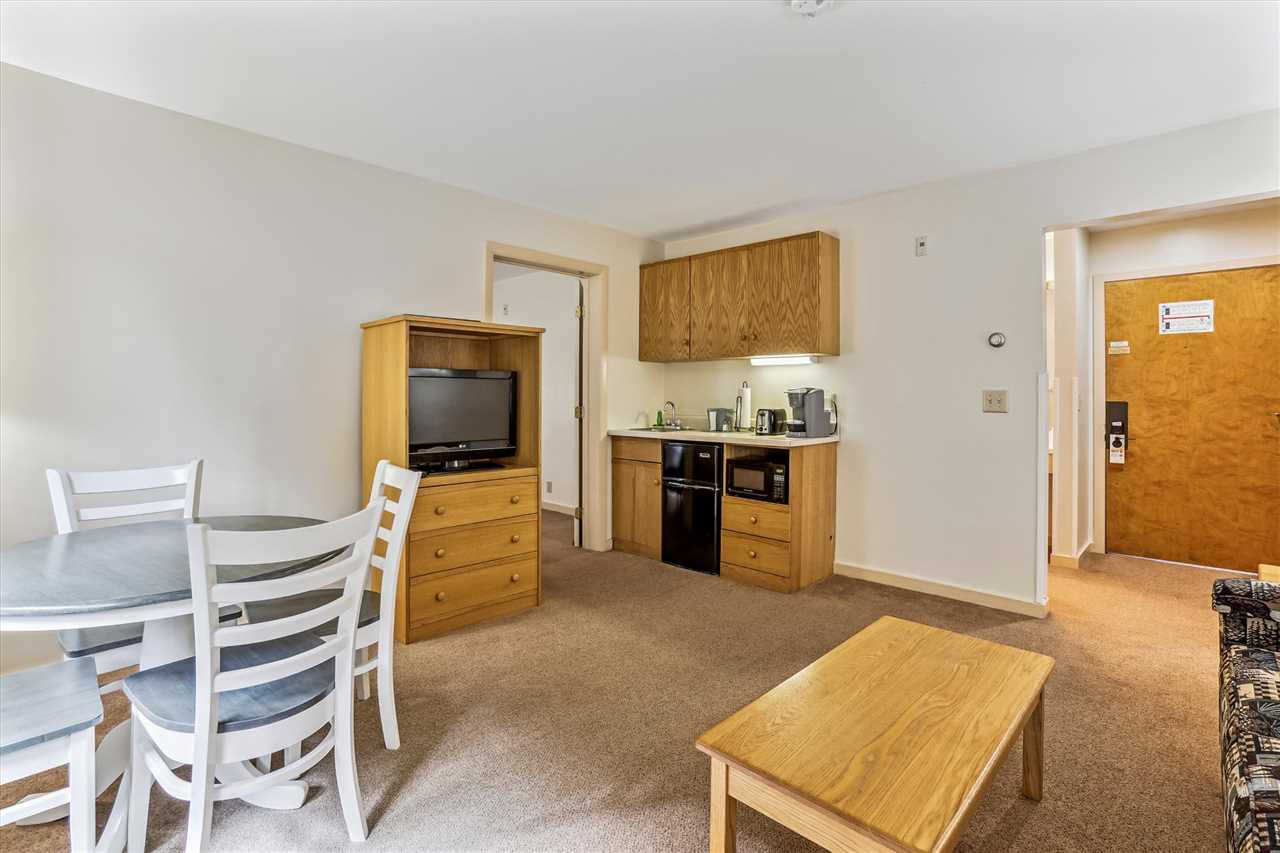 Common space includes a Queen sleeper sofa, a TV, a small dining area that seats 2, a Kitchenette with Microwave, Mini- fridge, Toaster, and Keurig