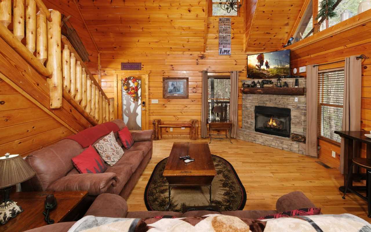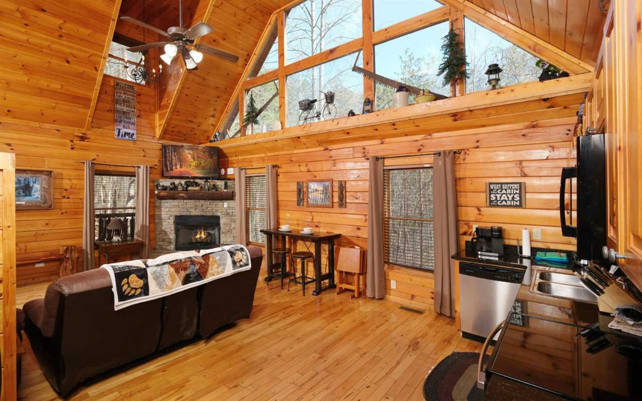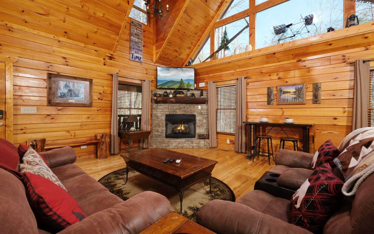 Kick back in this inviting mountain retreat, where big windows let in sunlight and the crackling fireplace warms cool nights. Whether you're playing games or watching a movie, this space brings everyone together.