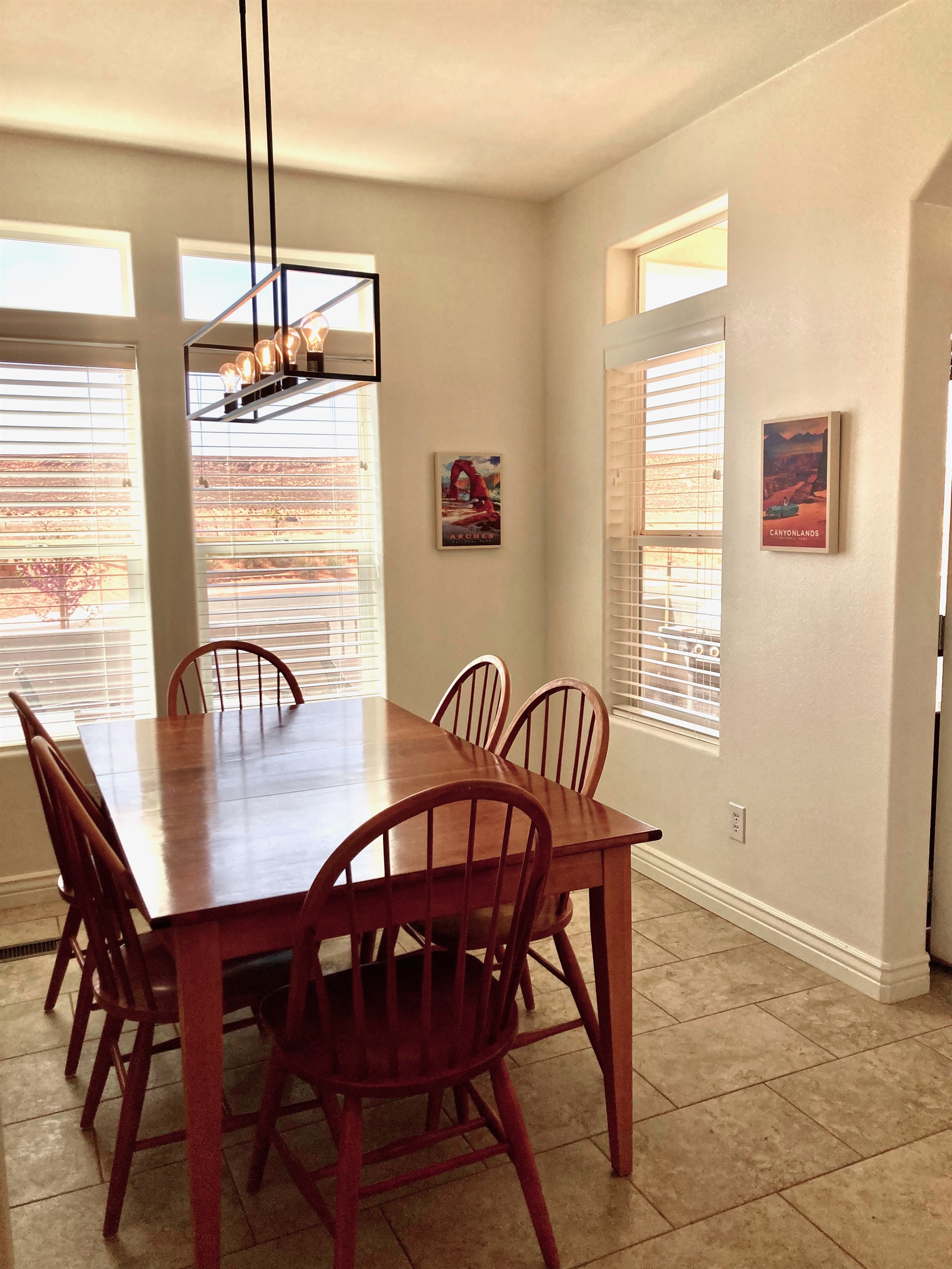 Cute clean recently built 3BD 2BA, (King, queen, plus two twin over twin bunks) sleeps up to 6-8 in a good, quiet neighborhood on the edge of Page; view of the Vermillion Cliffs from the FRONT courtyard which has a patio table and BBQ plus elevated front porch, just minutes from downtown.