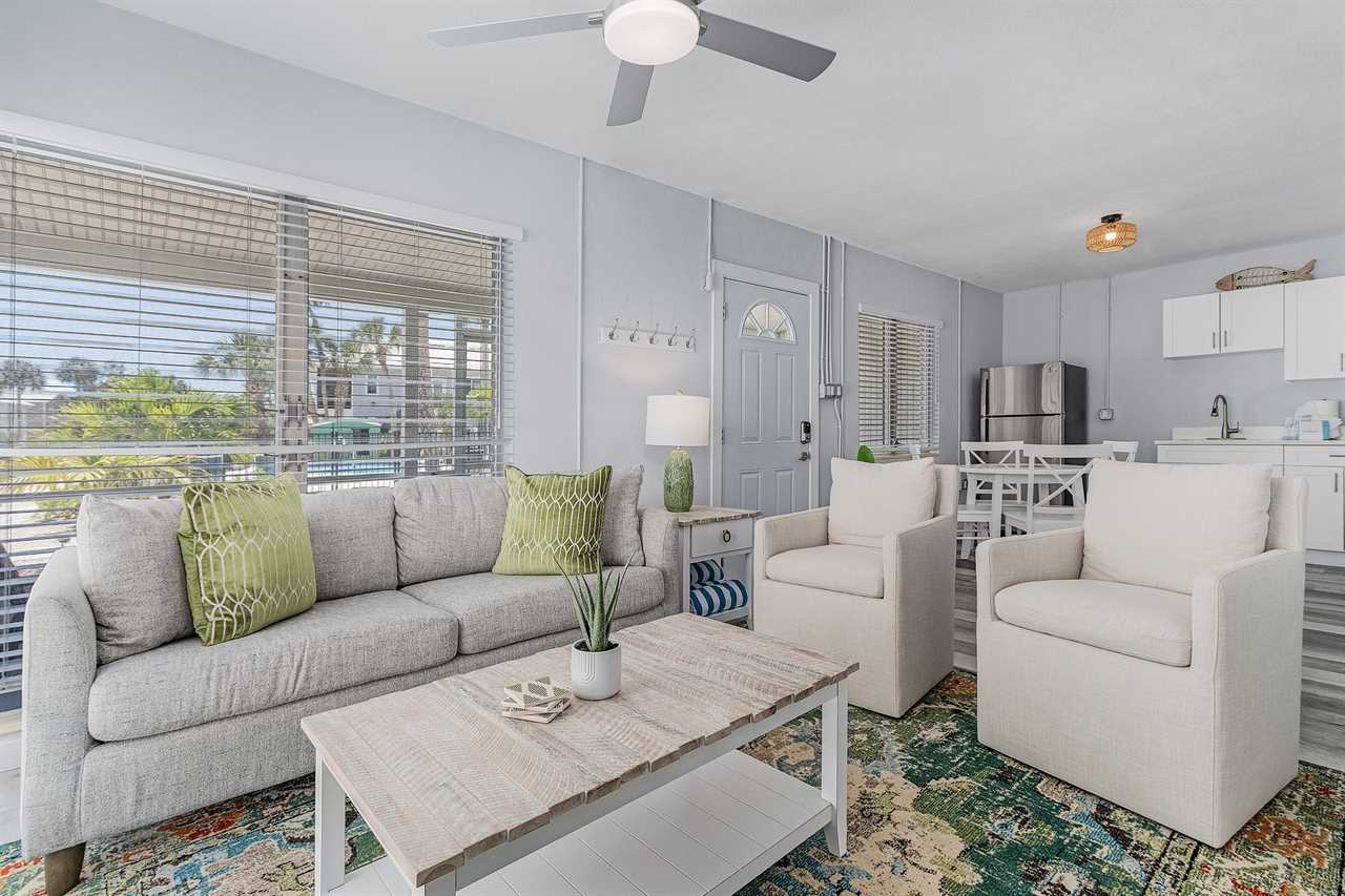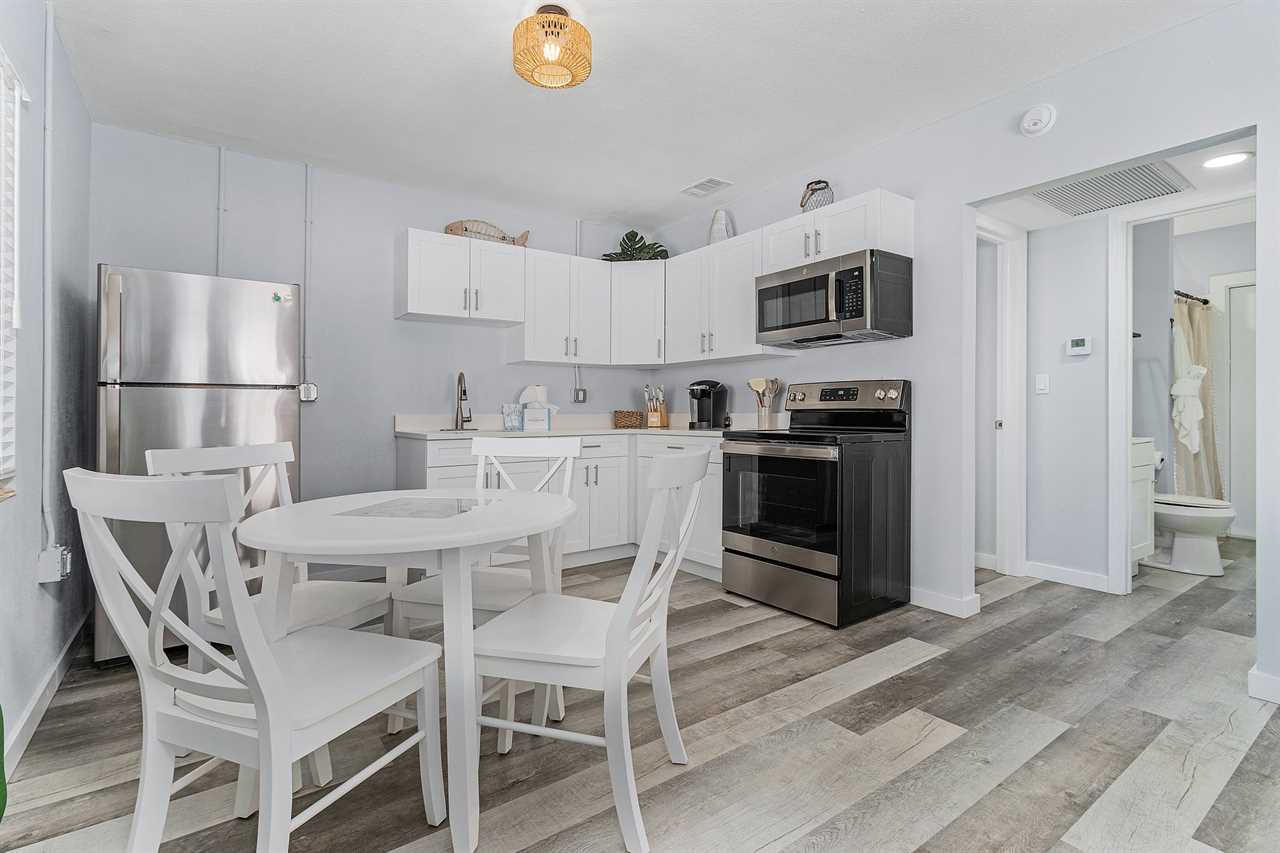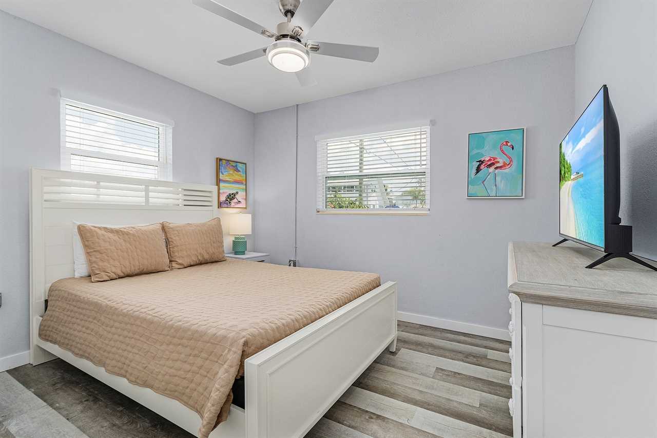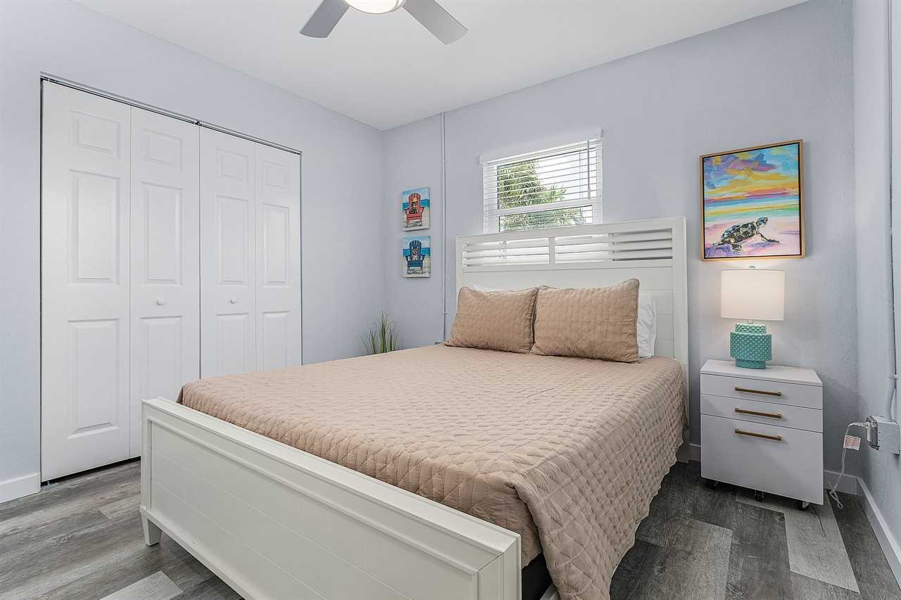 License # 22-0052 Washington Avenue "Dune Our Thing" Unit D Welcome to Washington Avenue Villas Unit D. This recently renovated and redecorated two-bedroom, one-bath vacation destination is nestled in with three other villas, all surrounding a large heated swimming pool with sun deck and located mid-way down the beautiful Estero Island, your tropical paradise that still maintains its Olde Florida charm. Beach access is just a short hop across Estero Boulevard to a 7-mile stretch of white, sugar sand beach providing a place for daytime beach activities and to view the endless variety of sunsets. Trolley service along the boulevard is available to transport you to Times Square with all of its restaurants, clubs, and night life. One of the island's largest supermarkets and the upscale Bayfront Bistro are just a short car ride away. Amenities include central air conditioning, complimentary WiFi, remote-controlled ceiling fans, all linens and towels provided, and shared on-site laundry facilities. Upon arrival, there is ample off-street parking. Enter through the furnished screened-in front porch and into the open-plan kitchen, dining, and living areas. There is beautiful wood flooring throughout, and décor is a beachy motif. The kitchen has a quartz counter space, a stainless-steel sink, and well-stocked cabinets with everything necessary to cook full-course meals if desired. Appliances include a refrigerator/freezer, a 5-burner glass top range with a self-cleaning oven, a microwave oven, and a Keurig coffee maker. The dining area adjacent to the kitchen has a table seating four. This flows into the living area furnished with a queen-size sleeper sofa and area rug, as well as a corner accent table and lamp. Opposite the sofa are two matching side chairs and a wall-mounted large flat-screen TV. The first bedroom has a queen-size bed with nightstands and lamps, ample closet space, and a double dresser with a flat screen TV. The second bedroom has a queen-size bed, nightstands and lamps, ample closet space, and a double dresser with a flat-screen TV. The hallway bath between the two bedrooms has a lavatory, commode, and a walk-in shower with a mini-tub. For those with a group of friends or extended family, the other three units can be reserved at the same time. If Washington Avenue Villas Unit D sounds like something you would like to experience, then give us a call or book online today! This property accommodates parking for a maximum of 2 vehicles. Our homes are not inventoried or stocked with beach gear or baby items; however, previous guests sometimes leave these behind. If you're considering renting such items, we recommend checking the property upon arrival for any available gear. Additionally, while all bed configurations and room details are accurate, furniture and décor may vary slightly from what is shown in photos. This property allows one dog 35lbs and under with a $150 non refundable pet fee. Following Hurricane Ian some services and amenities are currently limited, please refer to https://www.visitfortmyers.com/beach-conditions & https://www.fortmyersbeach.org/whos-open-for-business/ for more information.