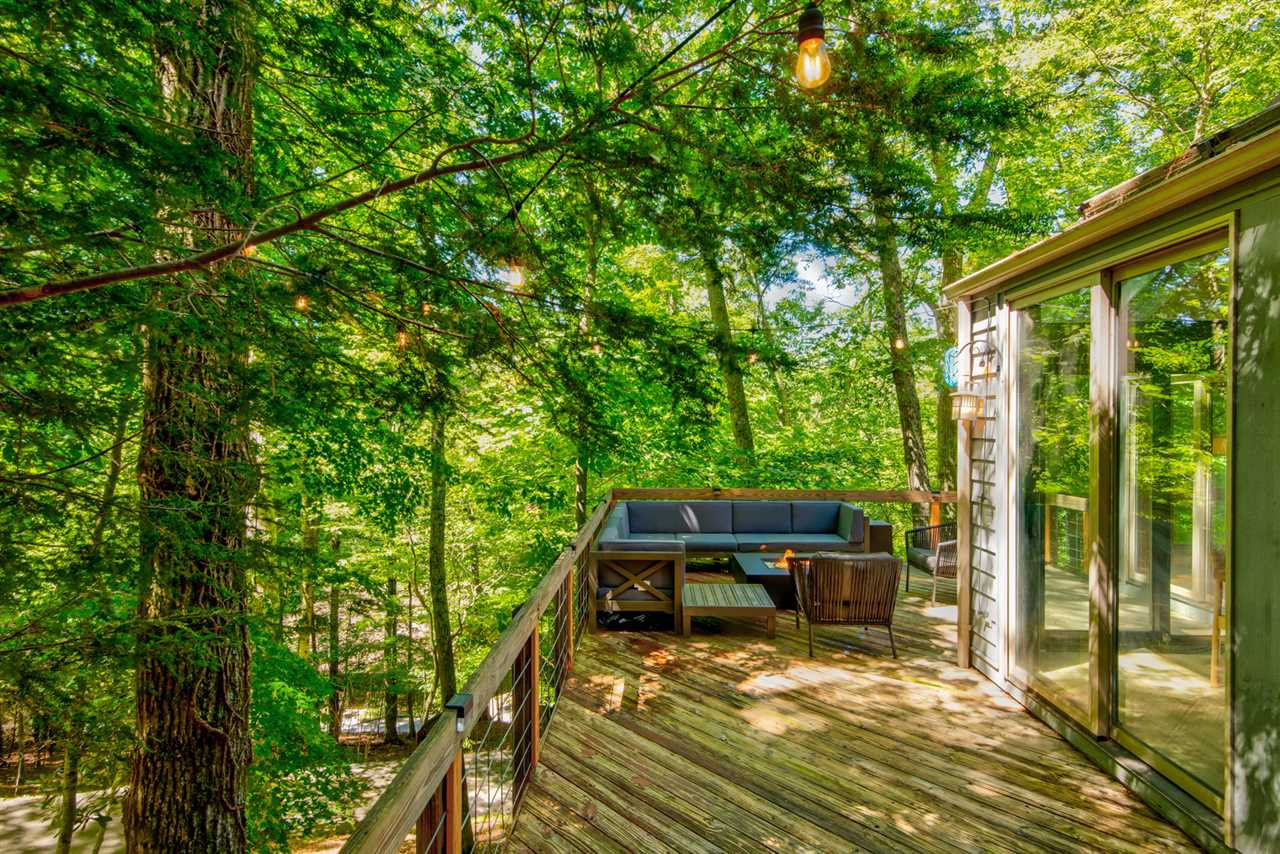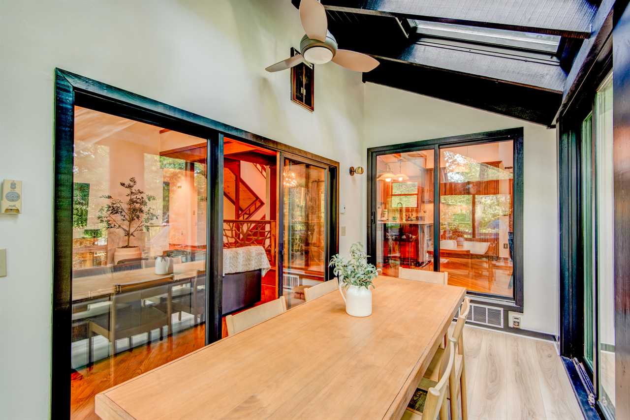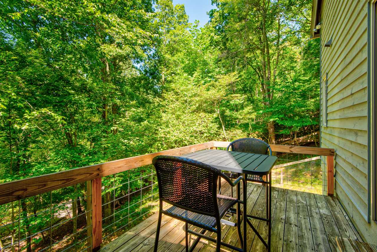 Tucked in the mountainside of Valle Crucis, this newly renovated mountain home is considerately outfitted with five bedrooms and four full bathrooms. The spacious living room has a woodburning fireplace, large TV, and comfortable, large sectional for everyone to gather. Off the living and kitchen area, step out to the dining room. With glass walls, you'll feel at one with nature as you gaze out to the trees. The well-stocked kitchen has granite counters and a large island with built in cooktop. The breakfast nook by the windows is perfect for a cup of tea in the morning.