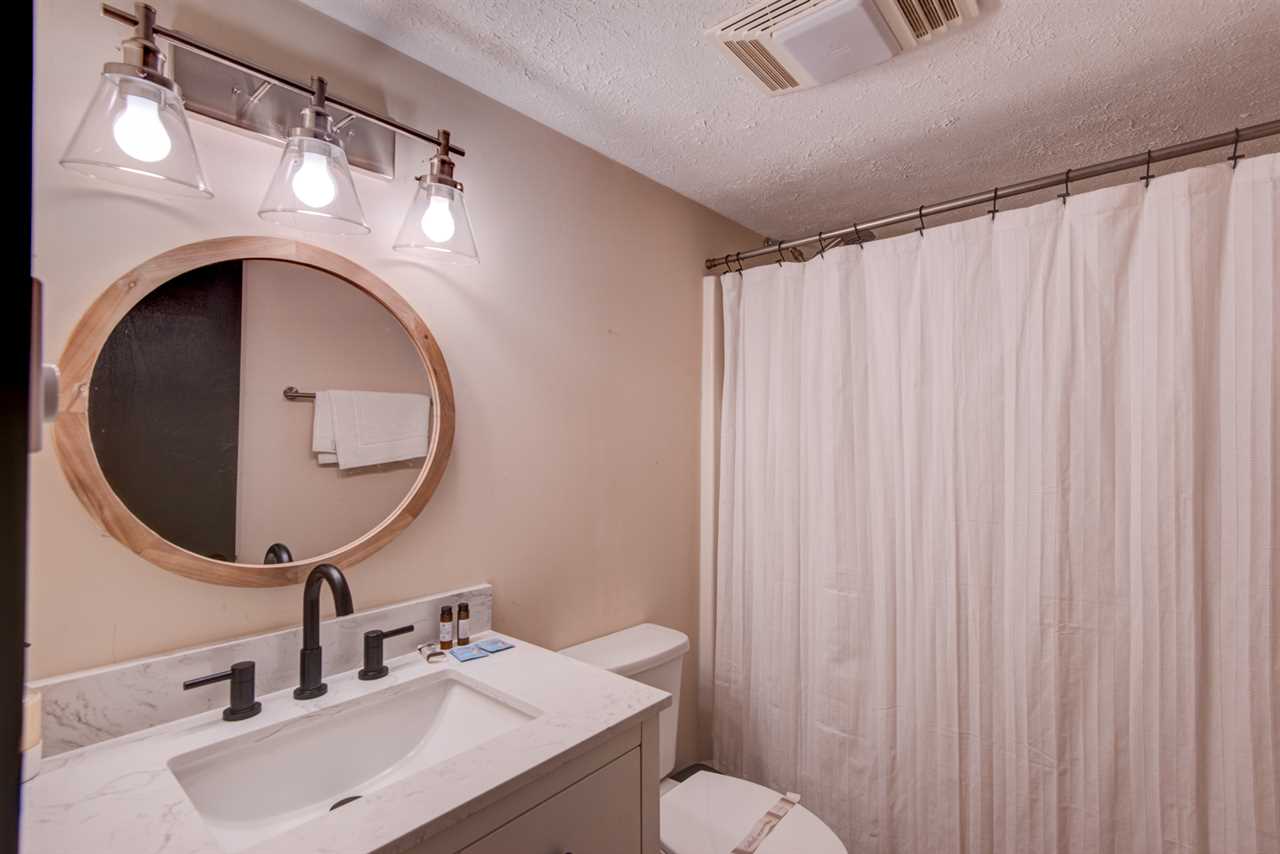 There are bedrooms on each level of this three story home. On the main level is a king suite with a custom tiled shower and double vanity with one-of-a-kind concrete and river rock counters. A large, walk-in closet is available for guest use. Across the hall is a queen bedroom that has hallway access to the second full bathroom on the main level. This bath has a tiled shower and granite counters, and opens to the hallway for shared use from the living area.
