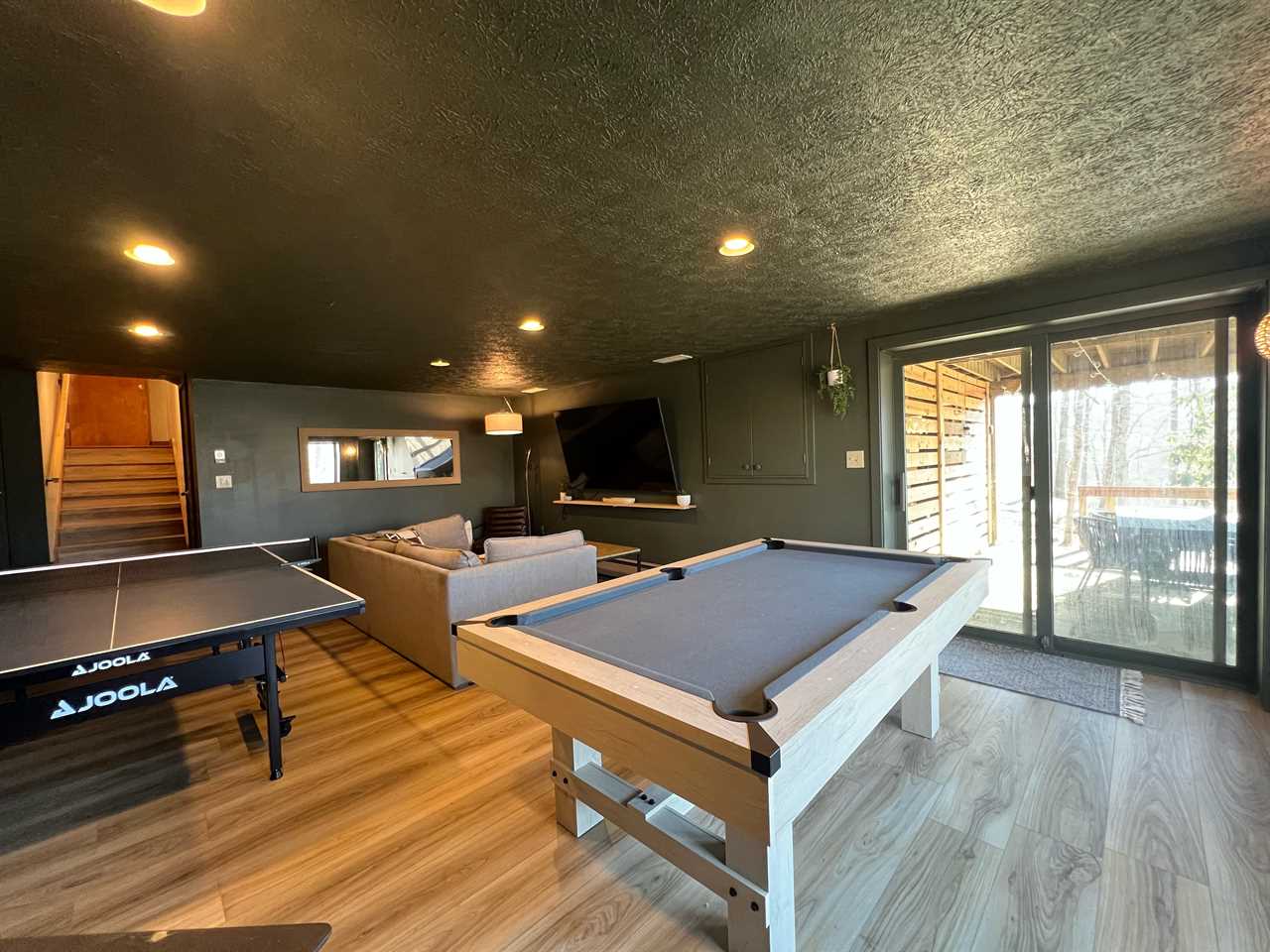 On the lower level is the fifth and final bedroom. This queen bedroom accesses the bathroom in the hallway, where you'll find another tub/shower combination. Also on the lower level is the game room, complete with pool table, ping-pong table, sectional, and large screen TV. Fire up the wood stove to create an even cozier ambiance. Off of the lower level game room is a smaller deck with dining space for six.