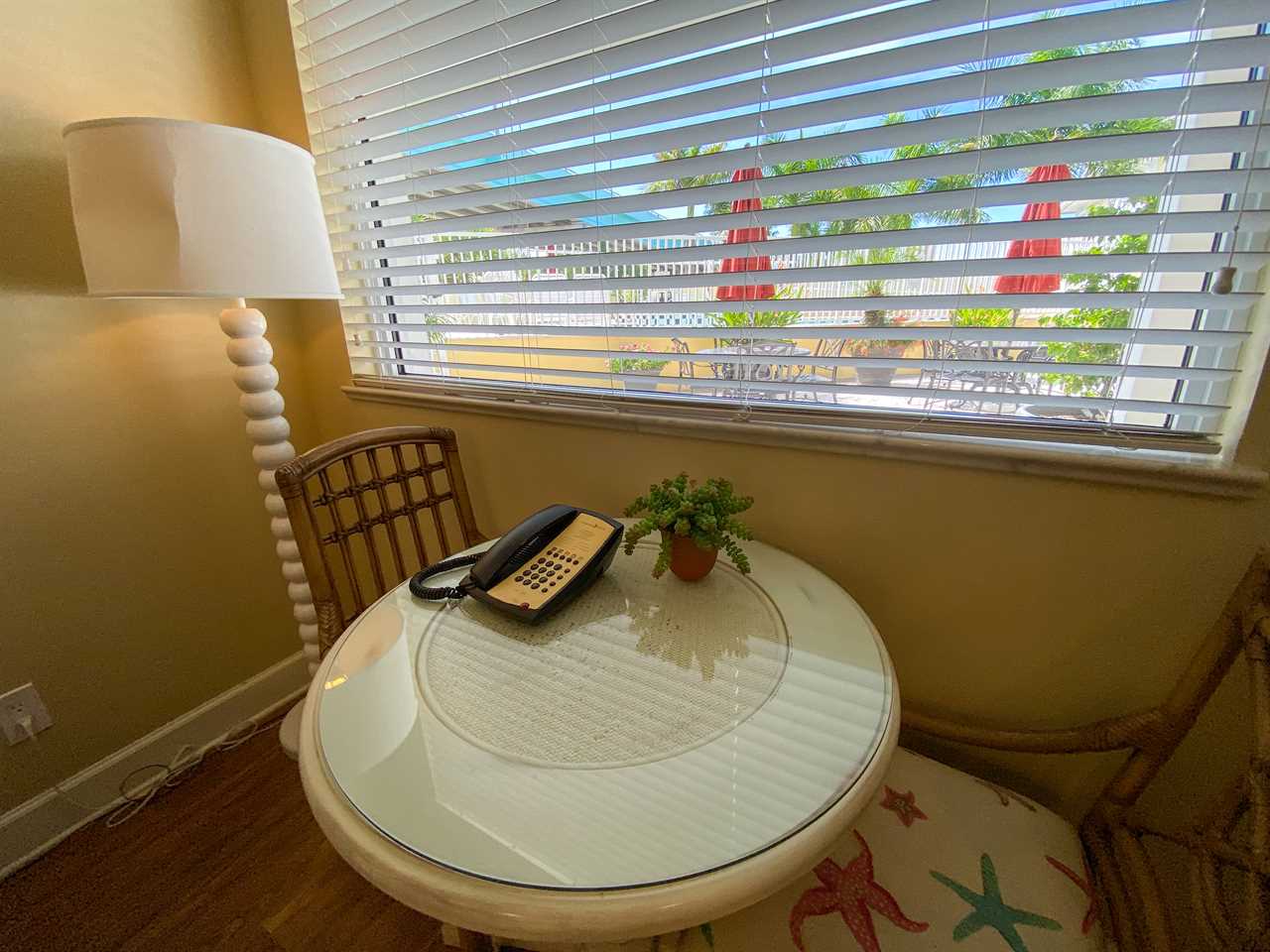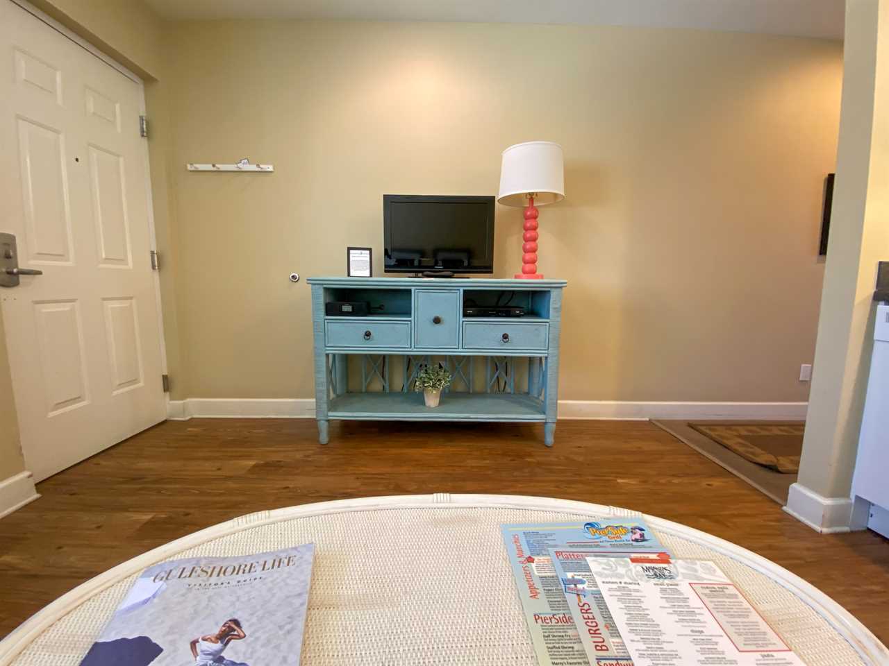 Enter into the open-plan kitchen, living, and dining areas with its beachy decor. There is wood flooring throughout but with tile flooring in the bathroom. The kitchen has hard surface countertops and cabinets with all the necessary items for full meal preparation if so desired. Just bring the food! There is a recessed ceiling and under-counter lighting. Appliances include a glass top two-burner range, a built-in above-range microwave oven, a mini dishwasher, and a refrigerator/freezer. Adjacent to this is a sleeper sofa with a coffee table, opposite which there is a credenza with a flat-screen TV. There is also a table seating two in front of a window overlooking the beautiful garden area, pool, spa, and sun deck.