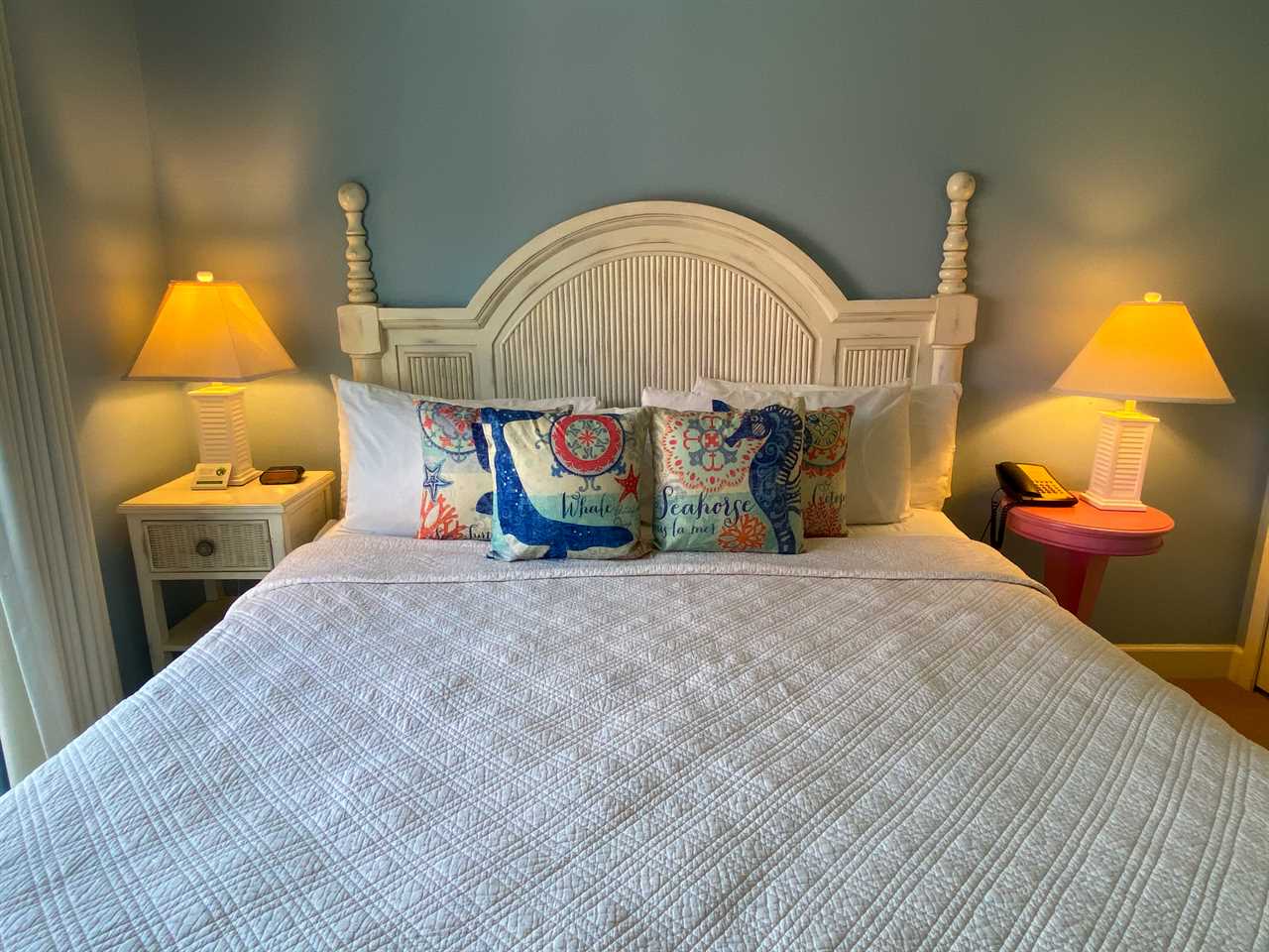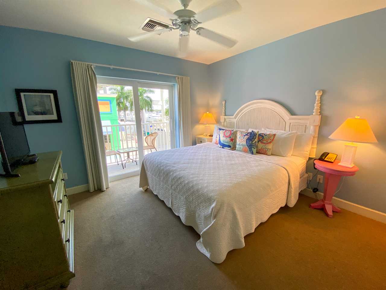 The bedroom has a king-size bed, nightstands and lamps, ample closet space, and a chest of drawers with a flat-screen TV. Sliding glass doors open onto the covered and furnished balcony overlooking the street below with its quaint shops, restaurants, and view of the back bay with all its marine activity. The bathroom has a vanity with a lavatory and storage space beneath, a commode, and a combination tub/shower.
