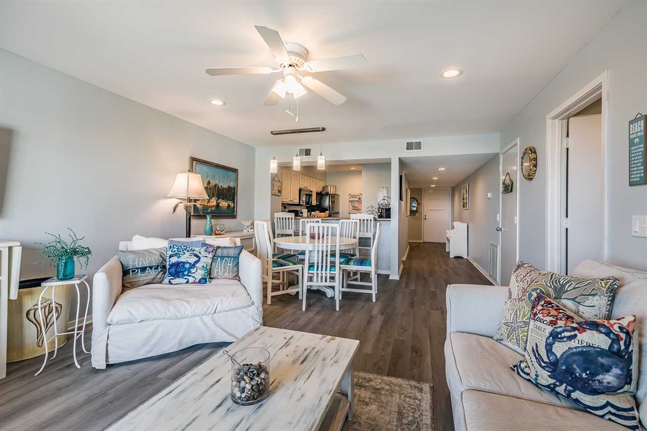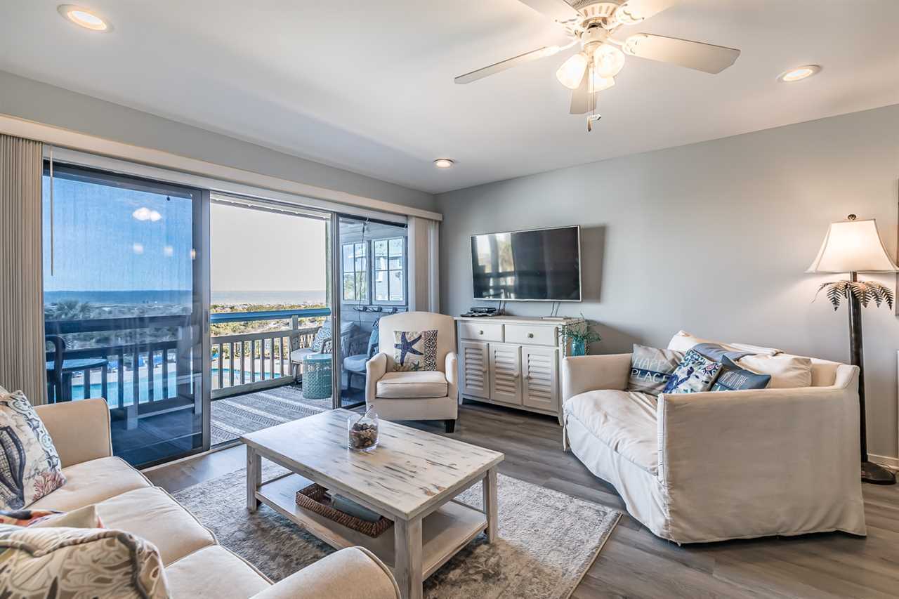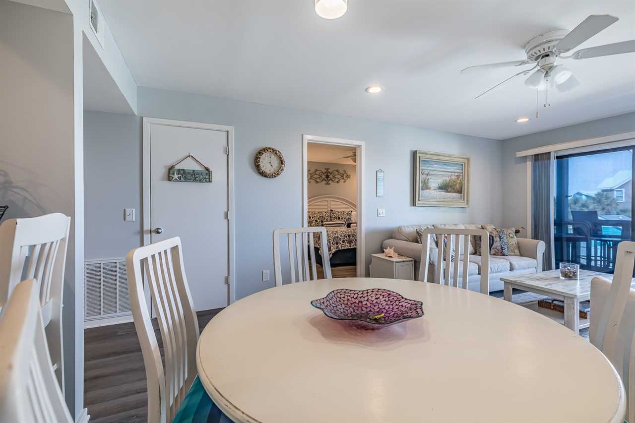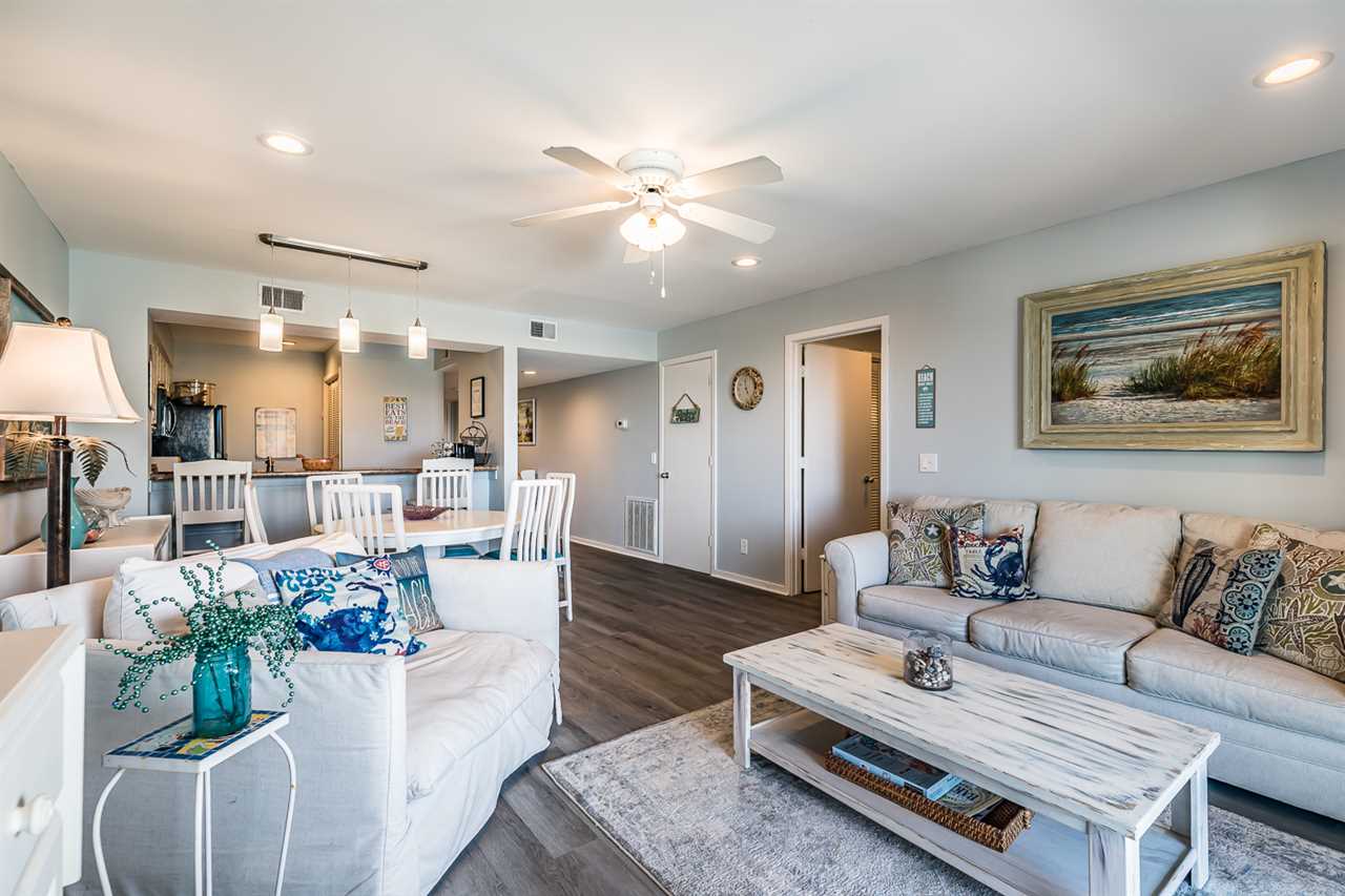 This second story, 2 bedroom/2bathroom condo on Harbor Island provides perfect views of the beach. Relax in the living room or have your coffee on the porch while enjoying views of the dunes and ocean.