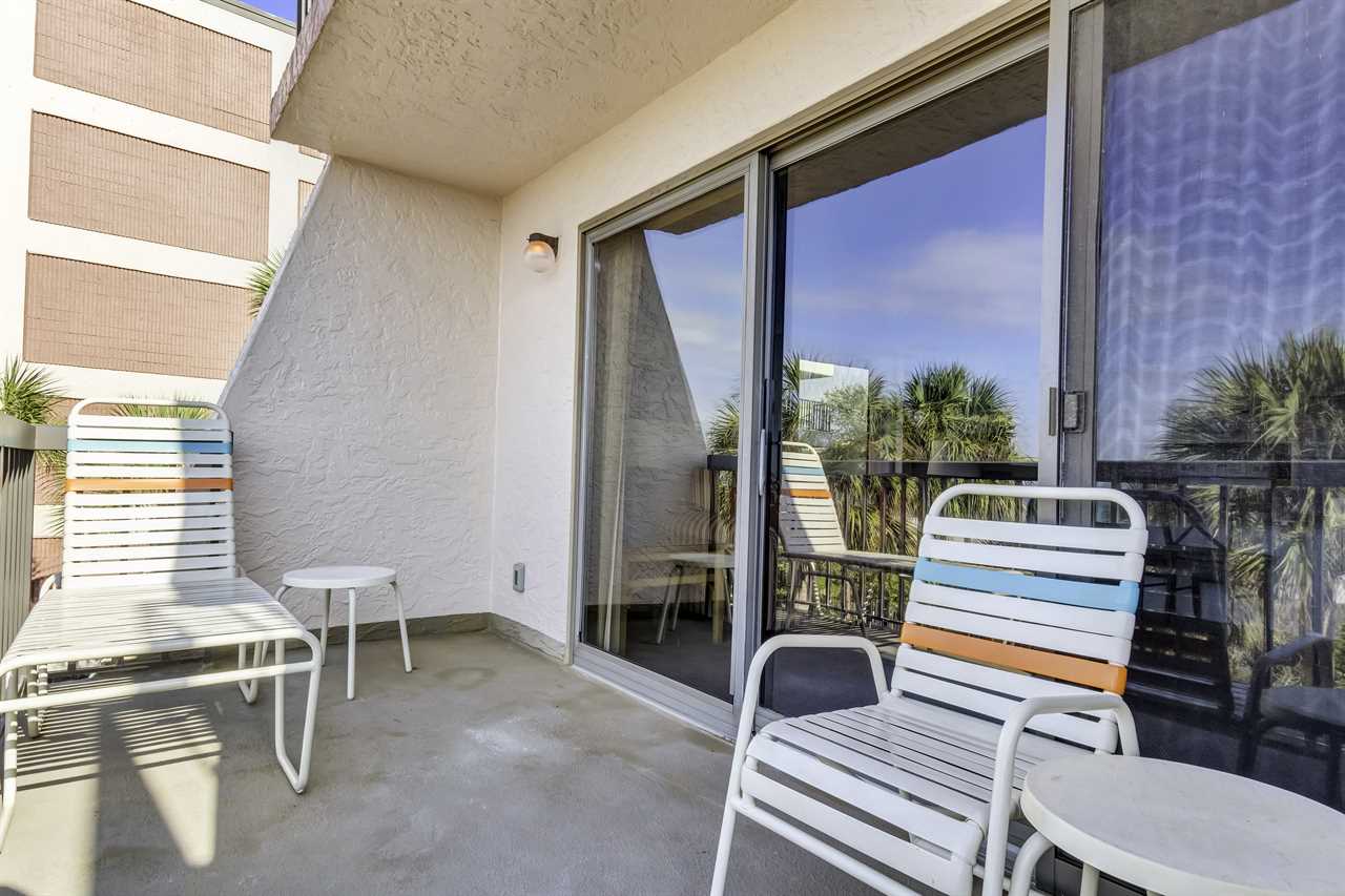 • 32” flat screen TV, ceiling fan, and balcony access