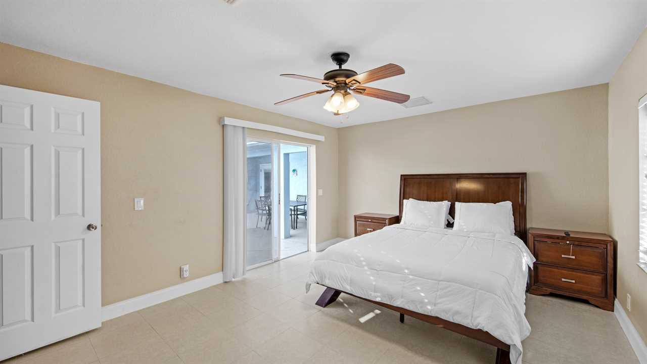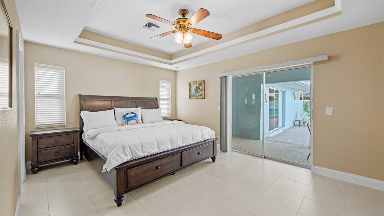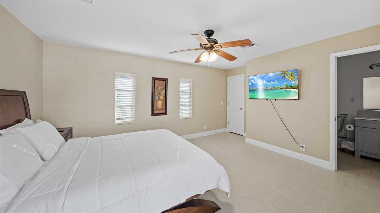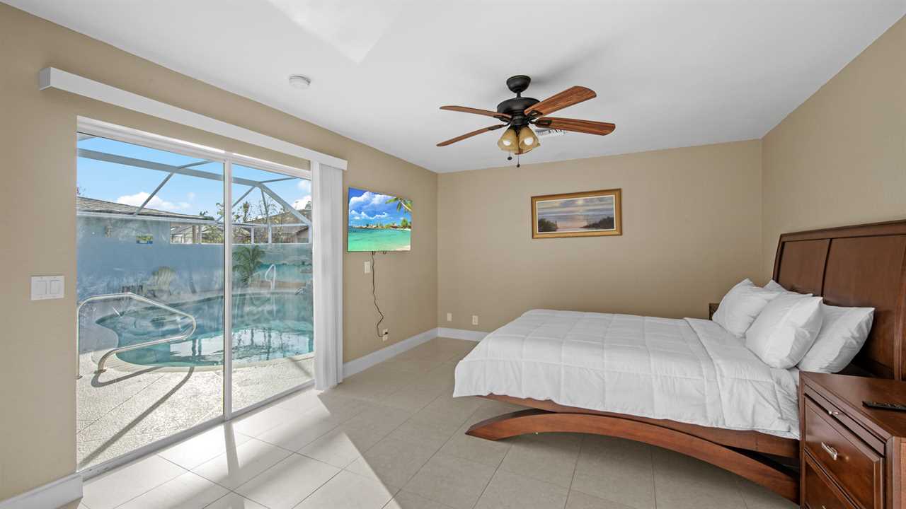 Master Suite: Features a king-size bed, Smart TV, private access to the pool lanai, and a spacious en suite bathroom with dual vanities, walk-in shower, and large closet.