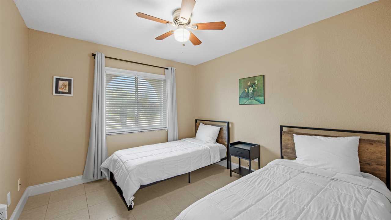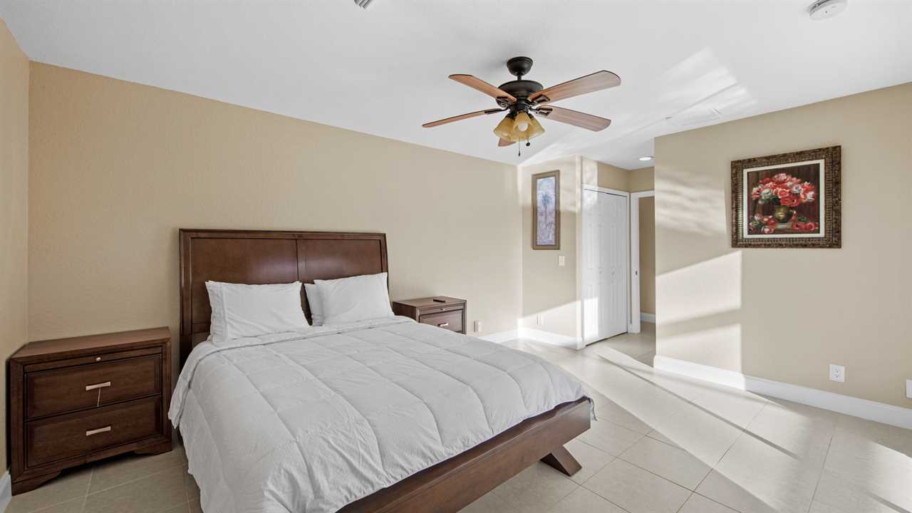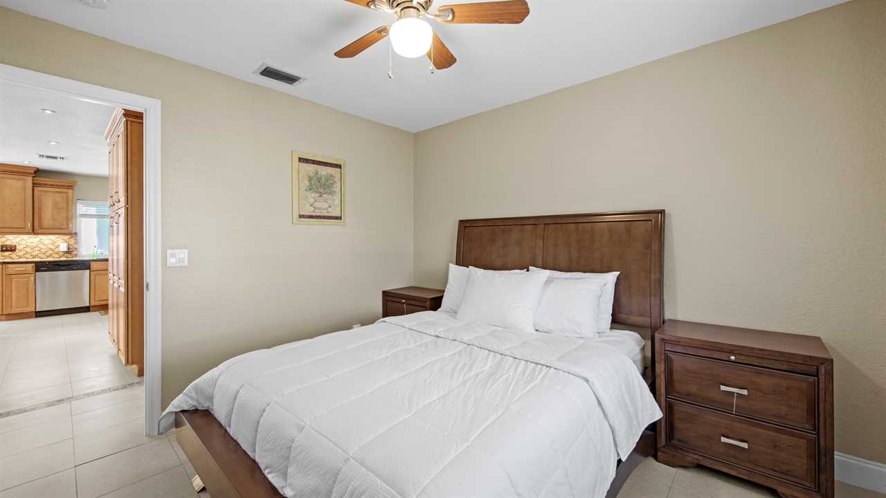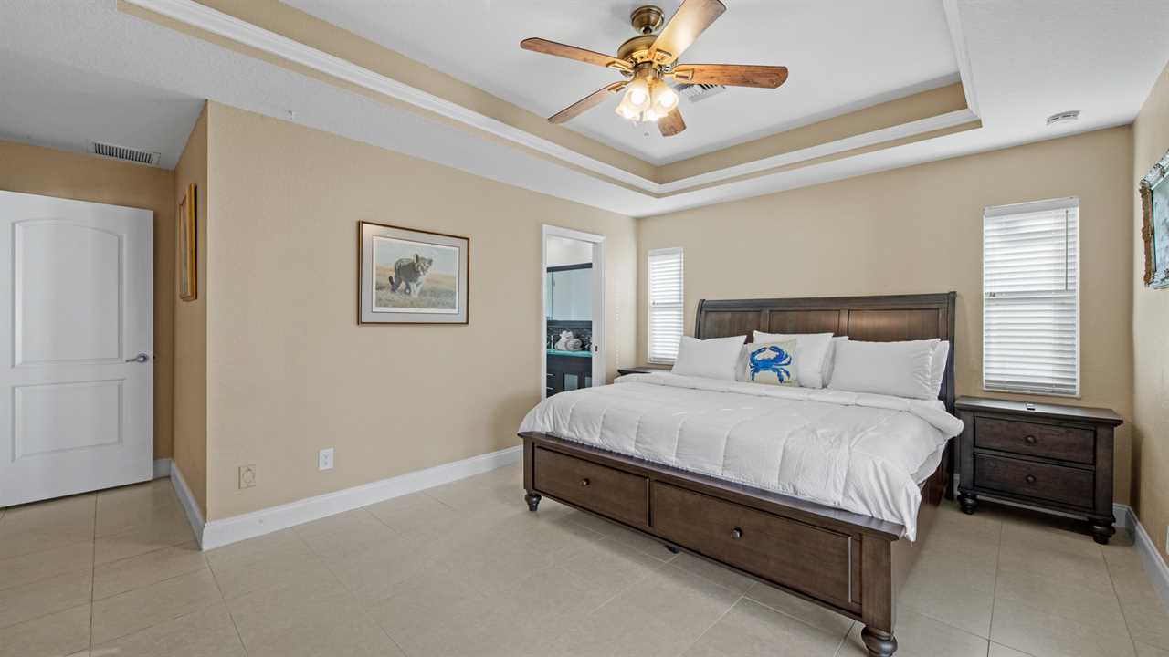 Master Suite: Features a king-size bed, Smart TV, private access to the pool lanai, and a spacious en suite bathroom with dual vanities, walk-in shower, and large closet.