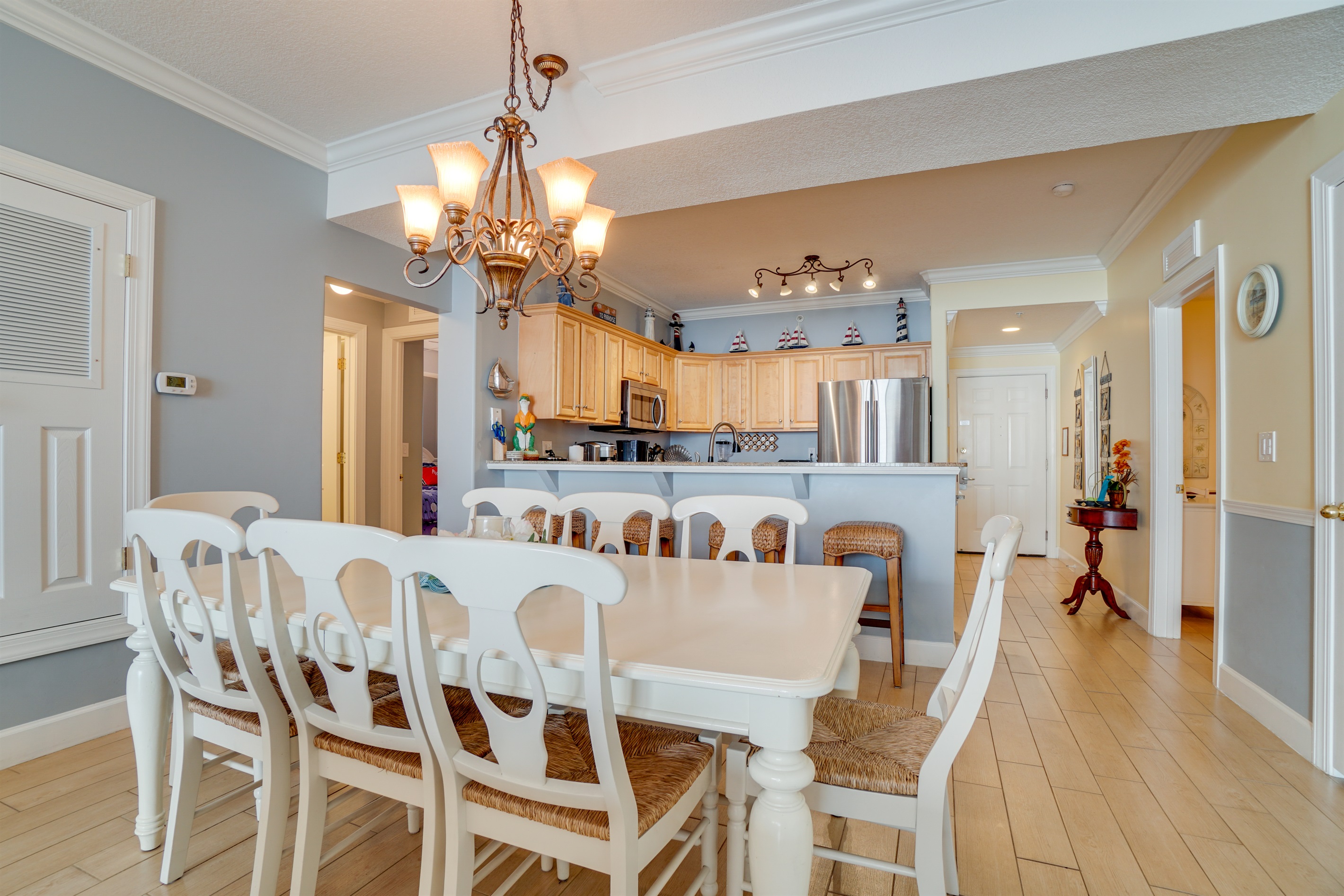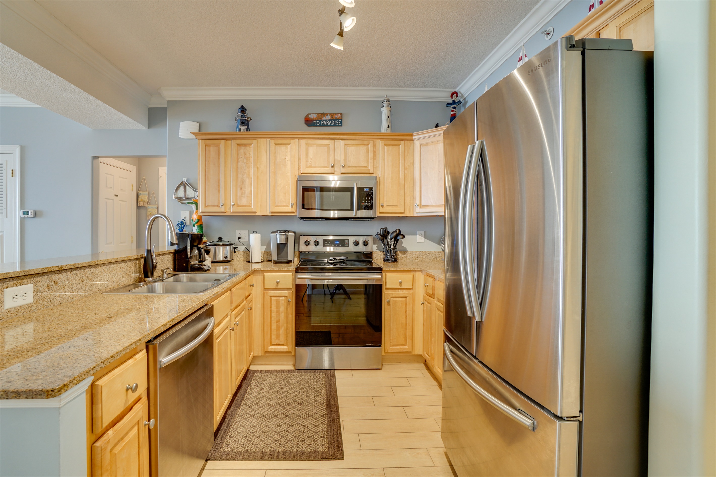The kitchen is completely ready and waiting for you with everything you will need. Stainless steel appliances with extra large Refrigerator & Freezer and Microwave and Dishwasher.
