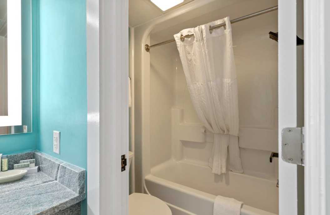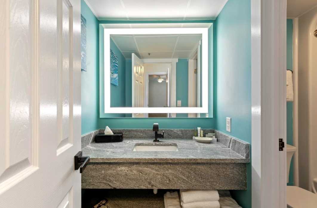 The bathroom is spacious and thoughtfully designed with a granite vanity, ample storage, an oversized LED mirror, and a tub and shower combination. A separate vanity area allows multiple guests to get ready comfortably and efficiently.