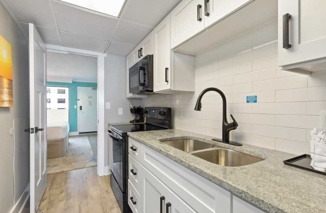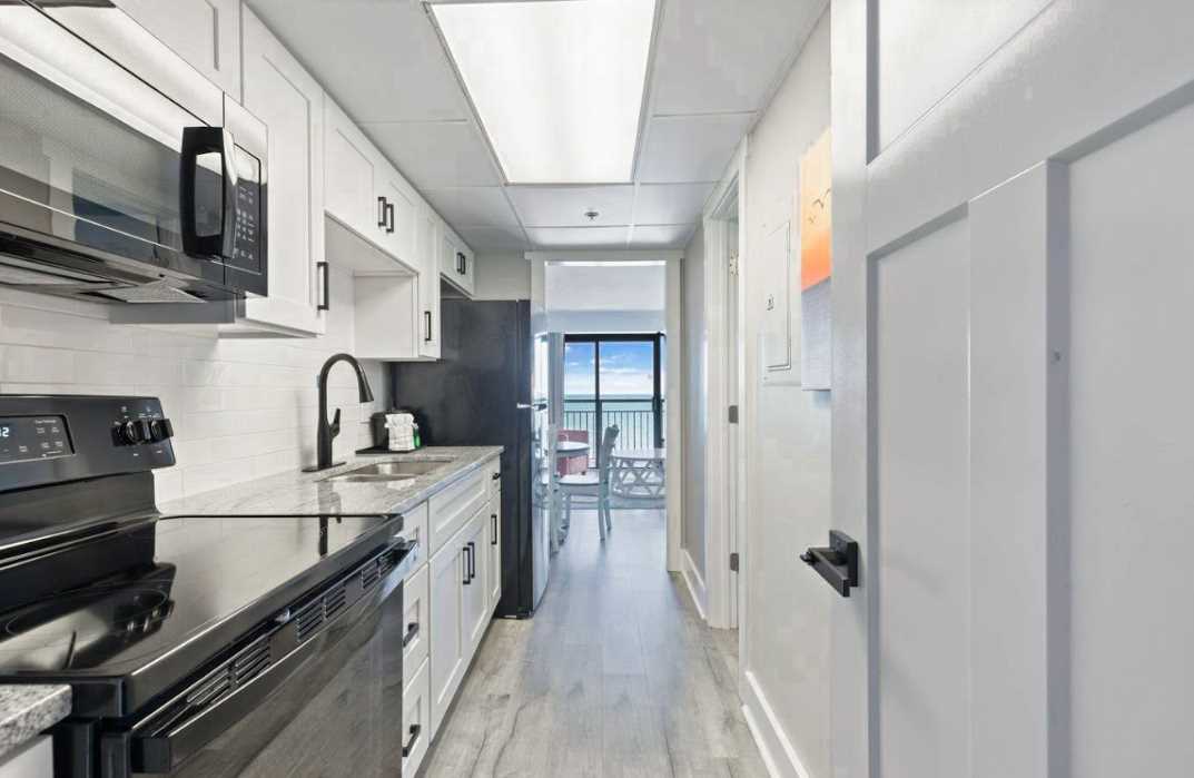 The kitchen sits at the center of the condo, seamlessly connecting the sleeping spaces. It features new cabinetry, full-size appliances, granite countertops, and a stylish tile backsplash. Fully stocked with cookware, utensils, plates, cups, and everyday essentials, it is perfect for preparing meals at home or enjoying a relaxed breakfast before heading to the beach. If dining out is more your style, you are minutes from countless restaurants and have easy access to delivery options like Uber Eats, DoorDash, and Postmates.