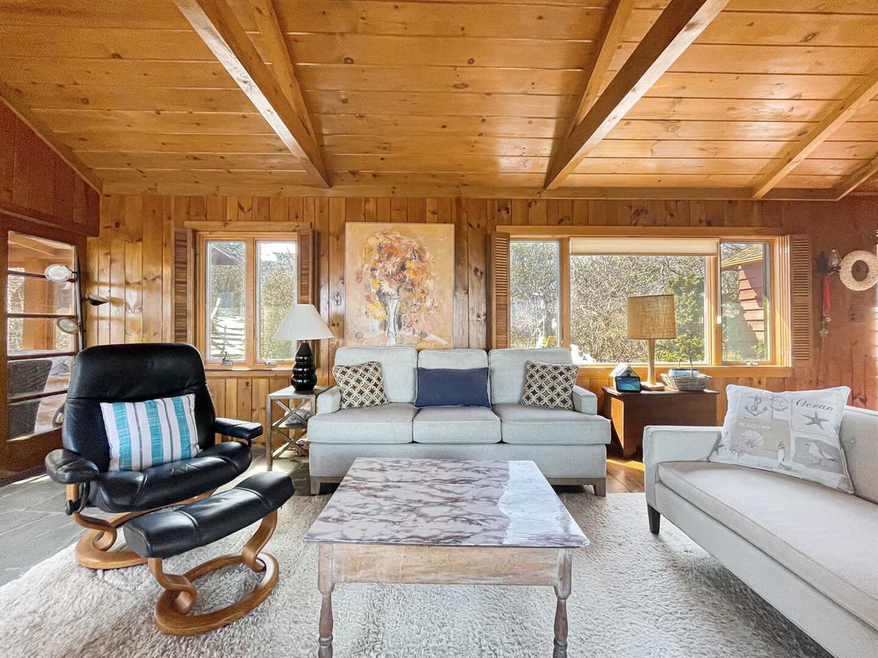 Inside, a cozy living room welcomes you after a day of exploring nearby beaches, hiking Mount Agamenticus, or wandering the rocky shoreline right outside your door. Three comfortable bedrooms offer peaceful rest with the soothing sound of waves.