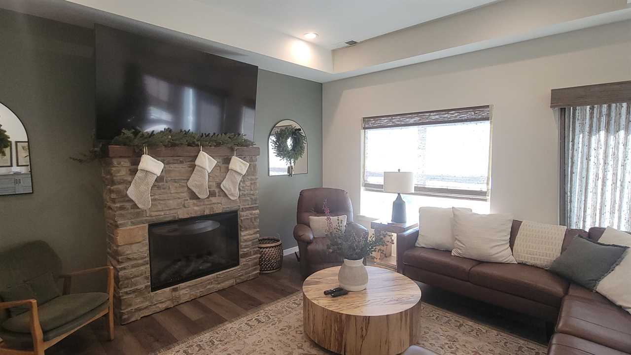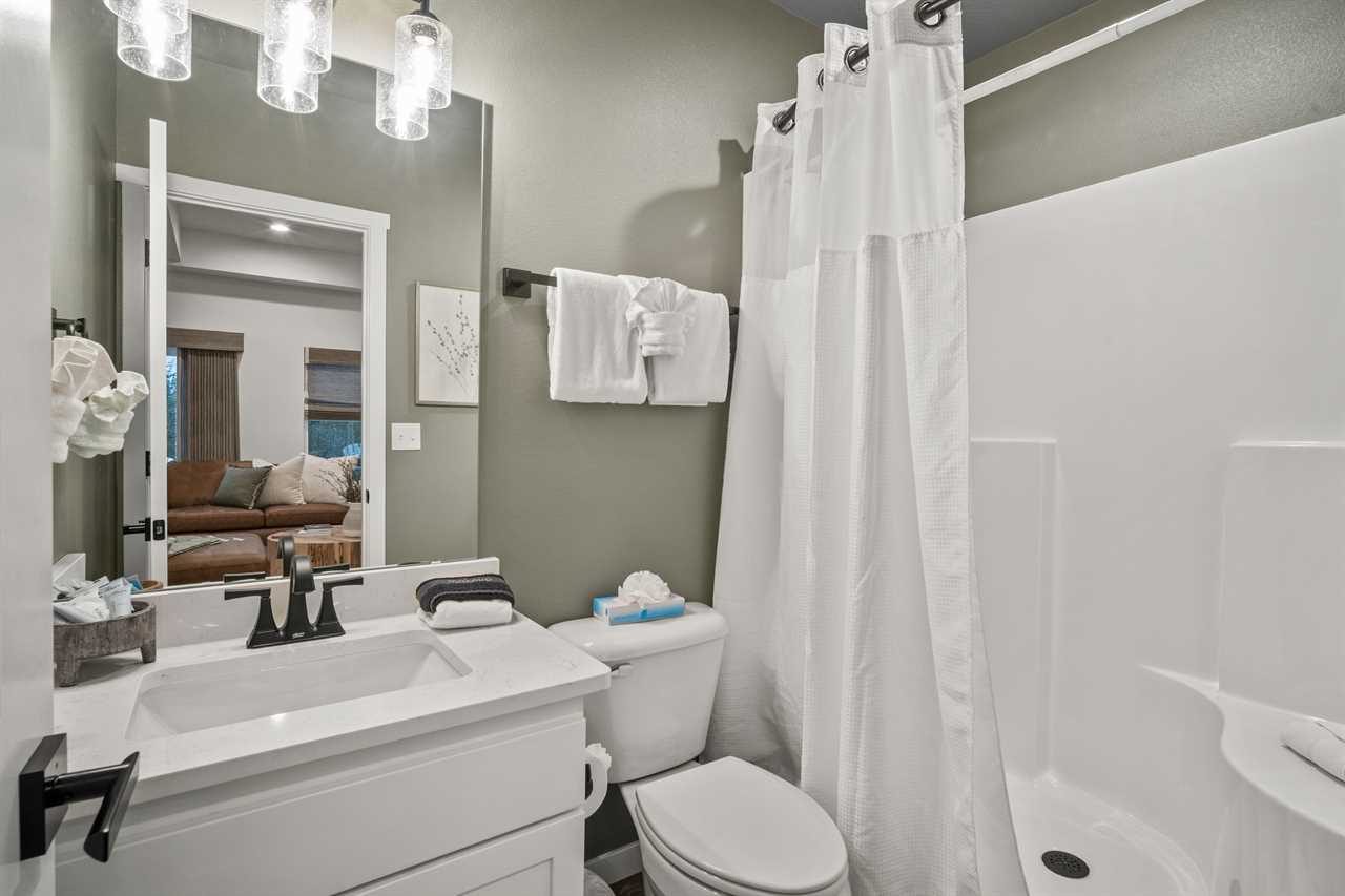 Step inside to an open-concept main level filled with natural light and refined finishes. The fully equipped kitchen features stainless-steel appliances and generous counter space for group meal prep, while the adjoining dining area invites long meals and shared moments. The living room offers plush seating, a cozy fireplace, and a Murphy bed that provides flexible additional sleeping space without sacrificing comfort or style.
