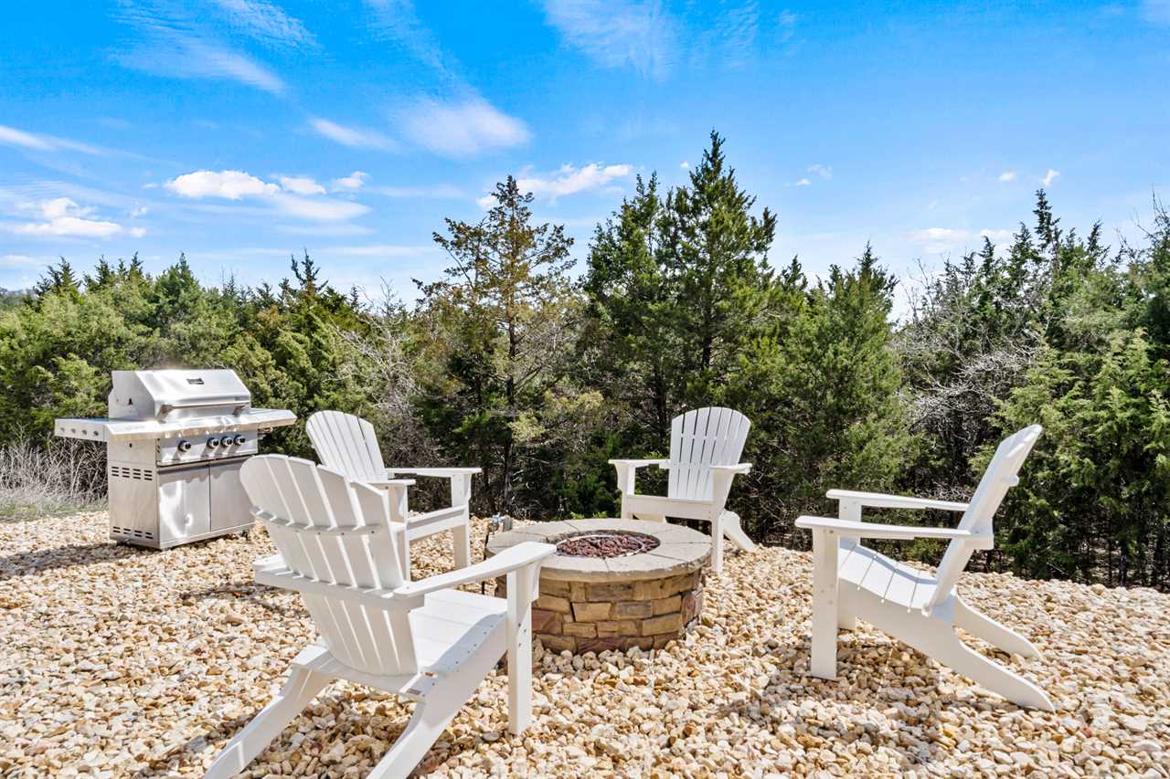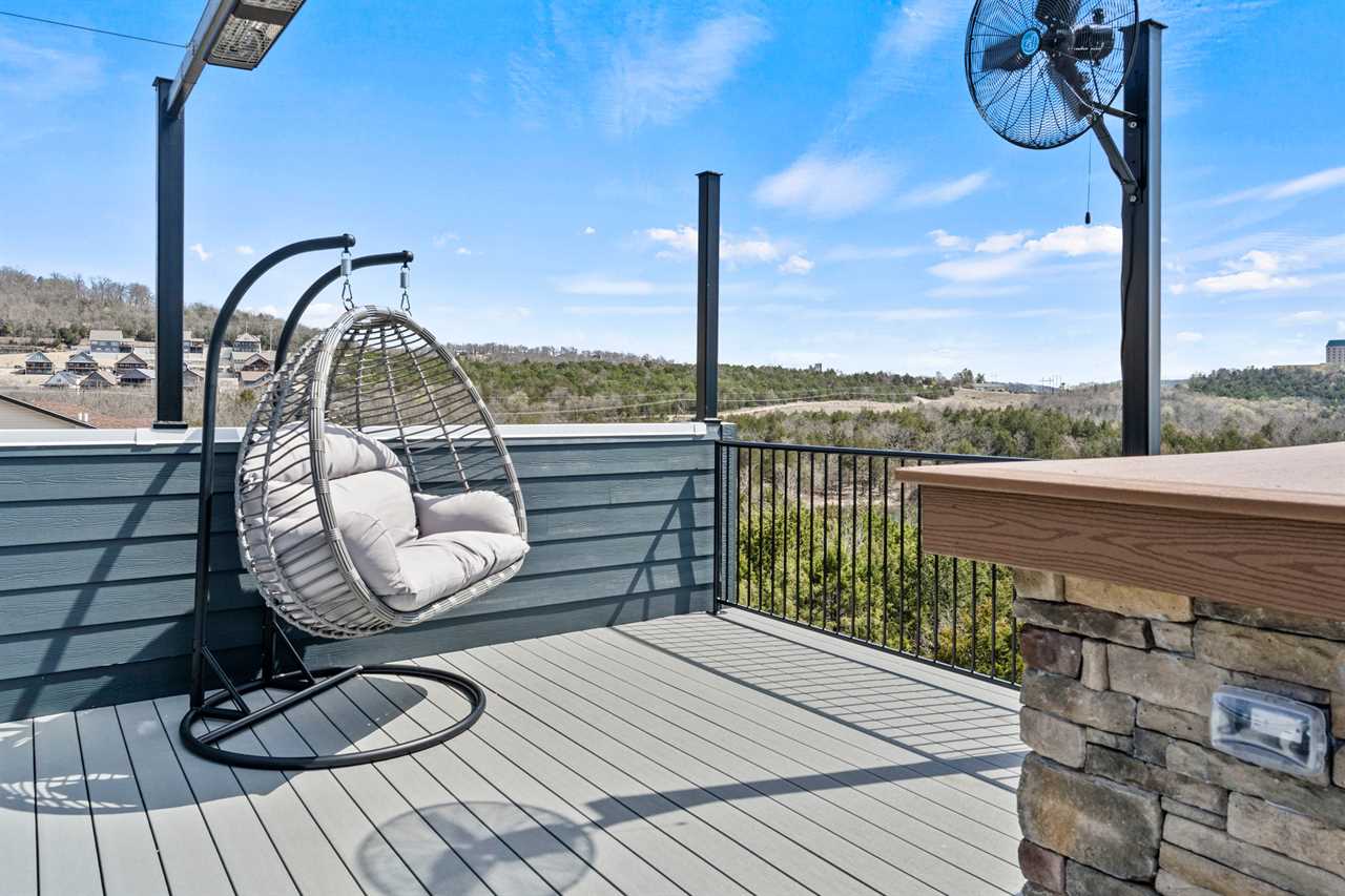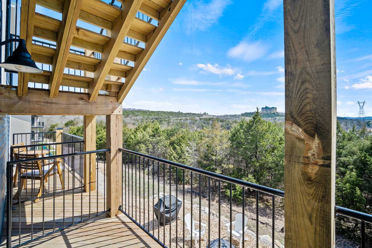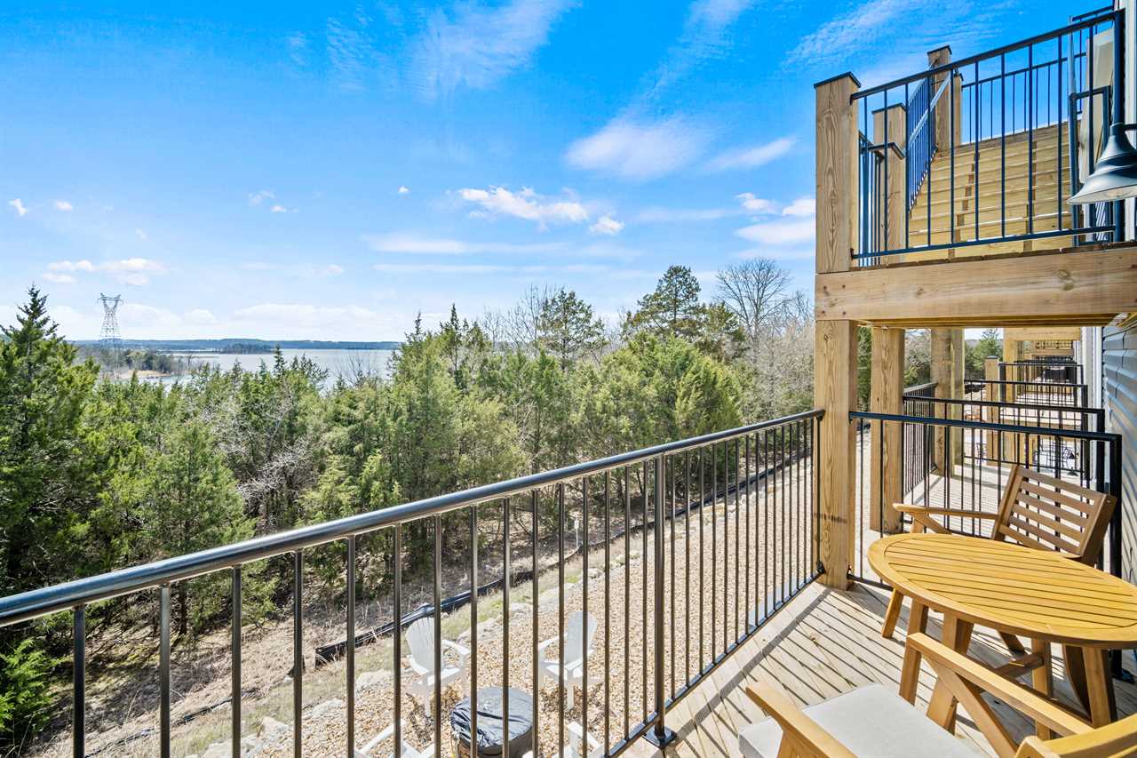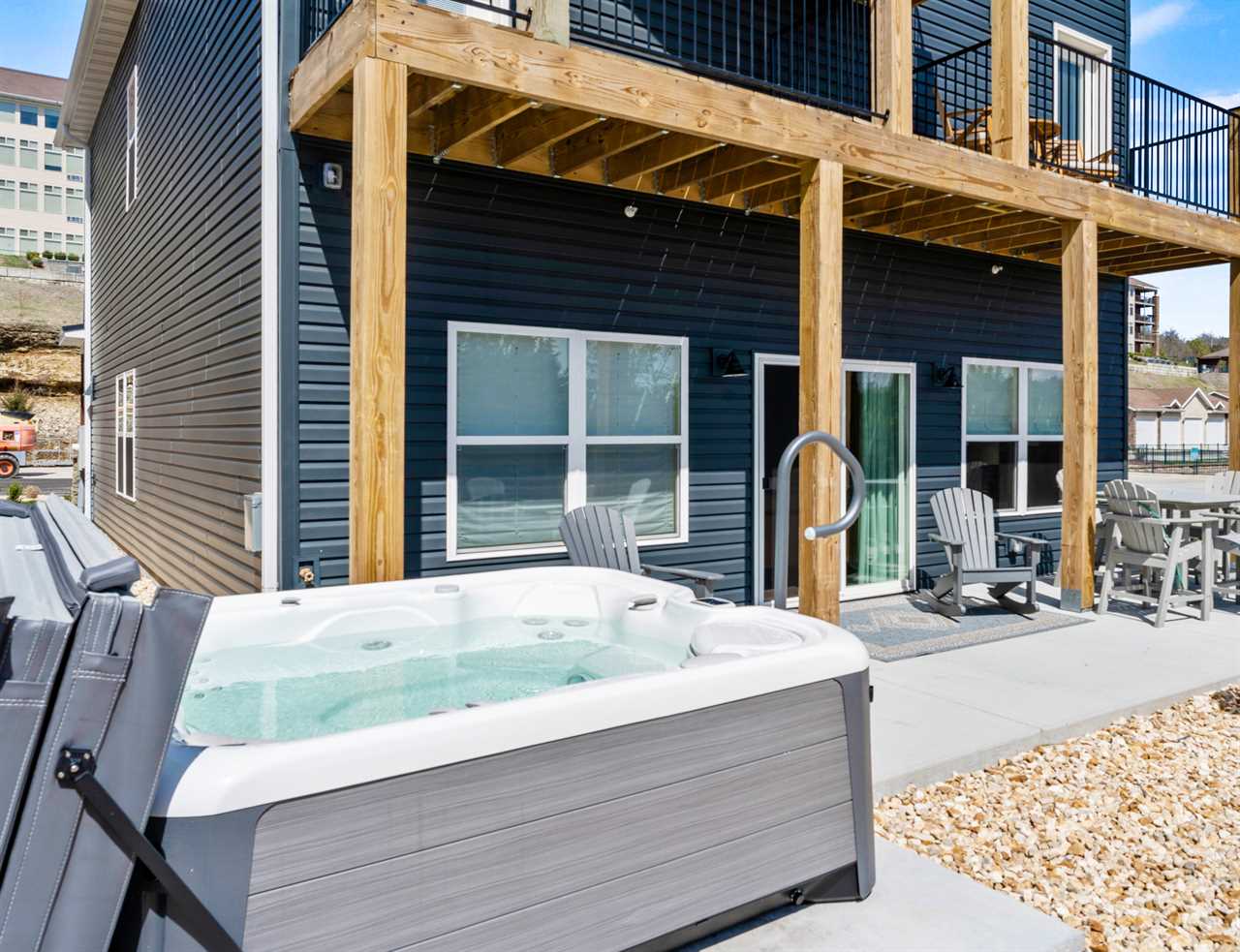 Outdoor living truly sets this lodge apart. The private rooftop deck is the highlight, featuring panoramic lake views, a full outdoor kitchen, dining space, and TV — ideal for sunset dinners and evening gatherings. Below, a separate patio area with a private hot tub and fire pit creates a cozy setting to unwind after days spent boating, beachgoing, or exploring Branson attractions.