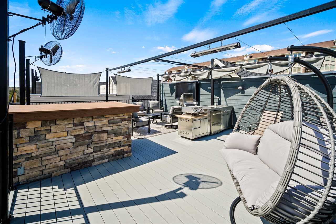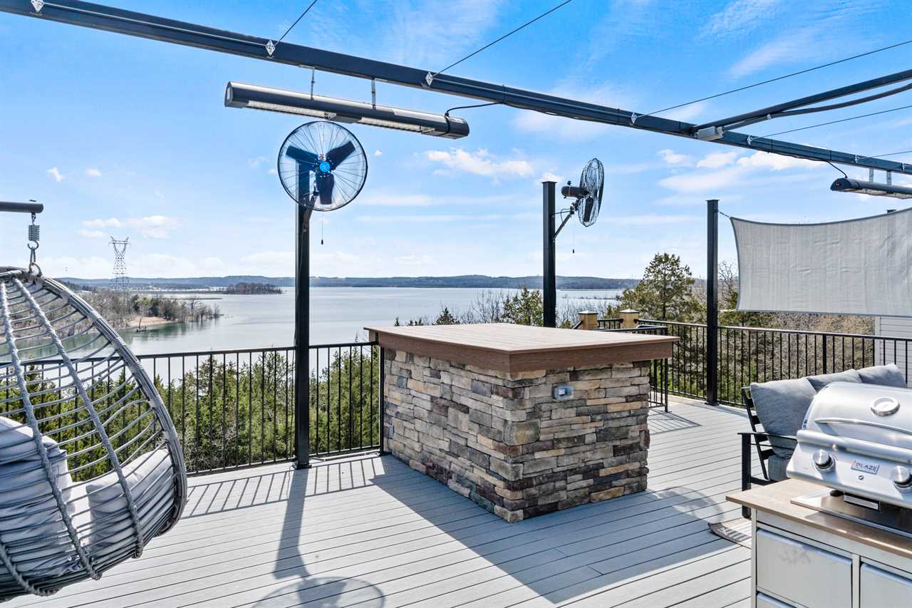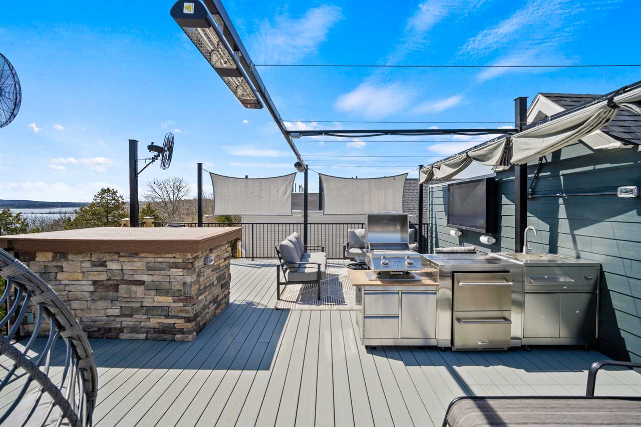✦ ✦ Private rooftop deck with outdoor kitchen, dining area, TV, and lake views 🌇