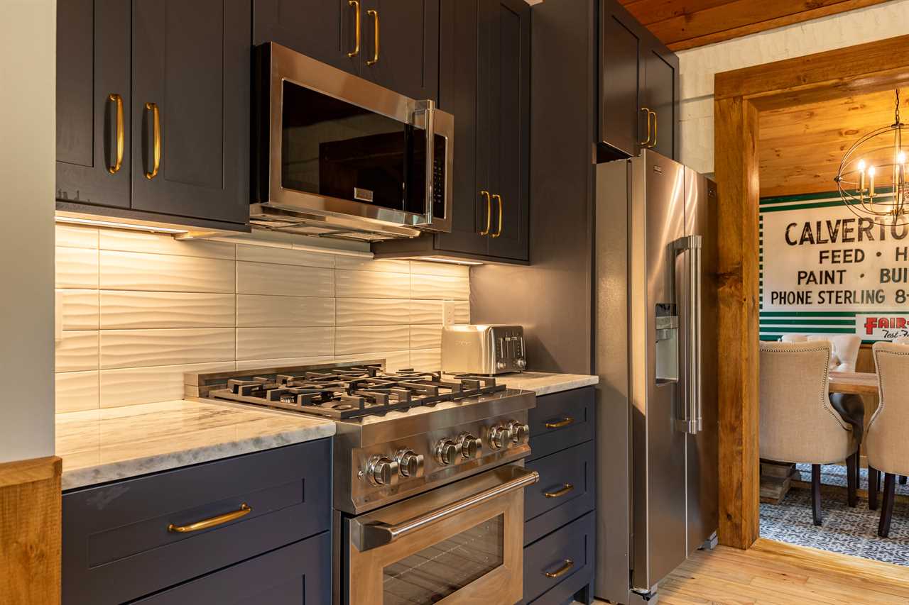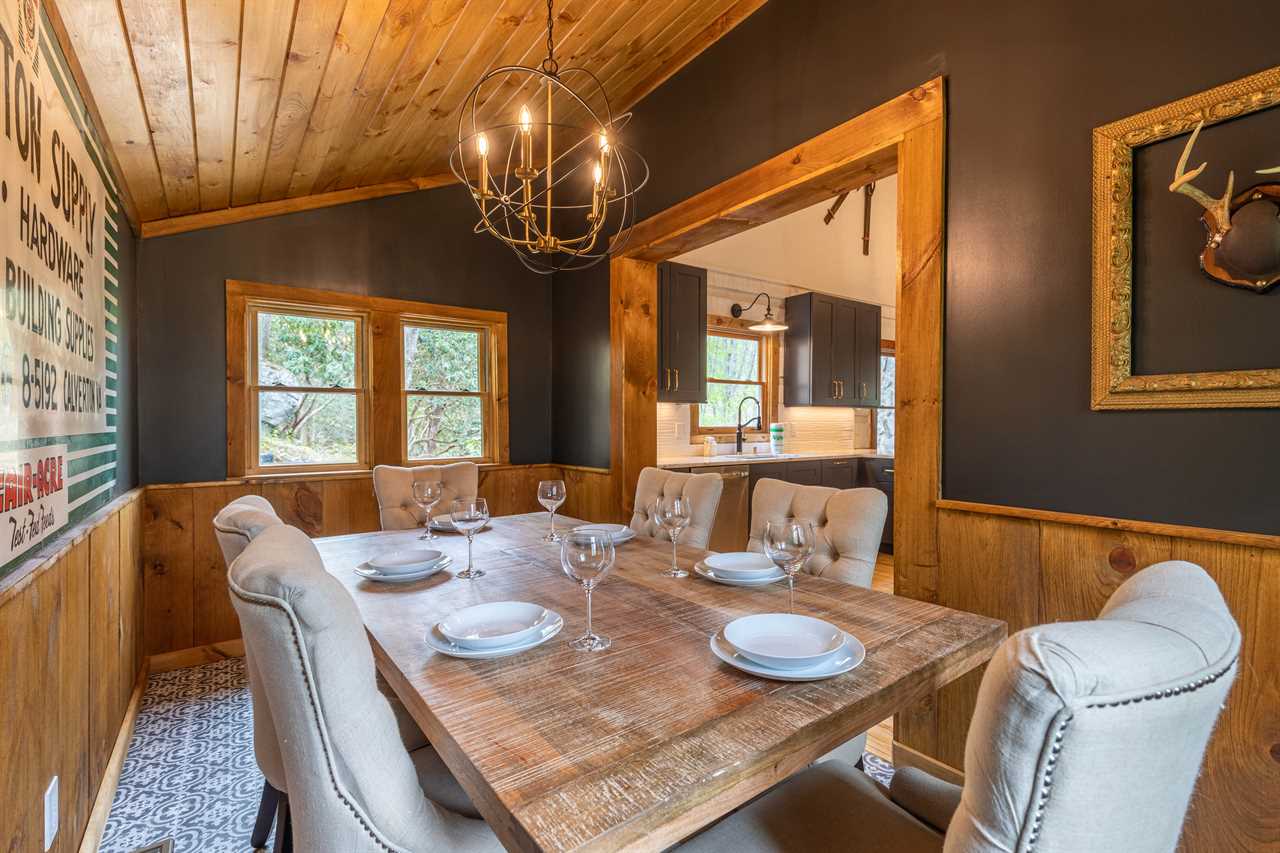Enjoy the main level with spacious great room featuring tongue & groove ceilings, stacked stone gas log fireplace, leather furnishings, and a bigscreen TV. Enjoy preparing meals and snacks in the kitchen with its waterfall granite counters and stainless appliances including a gas stove. There's room for two to eat at the kitchen bar counter and 6 to gather together at the table in cozy padded seats.