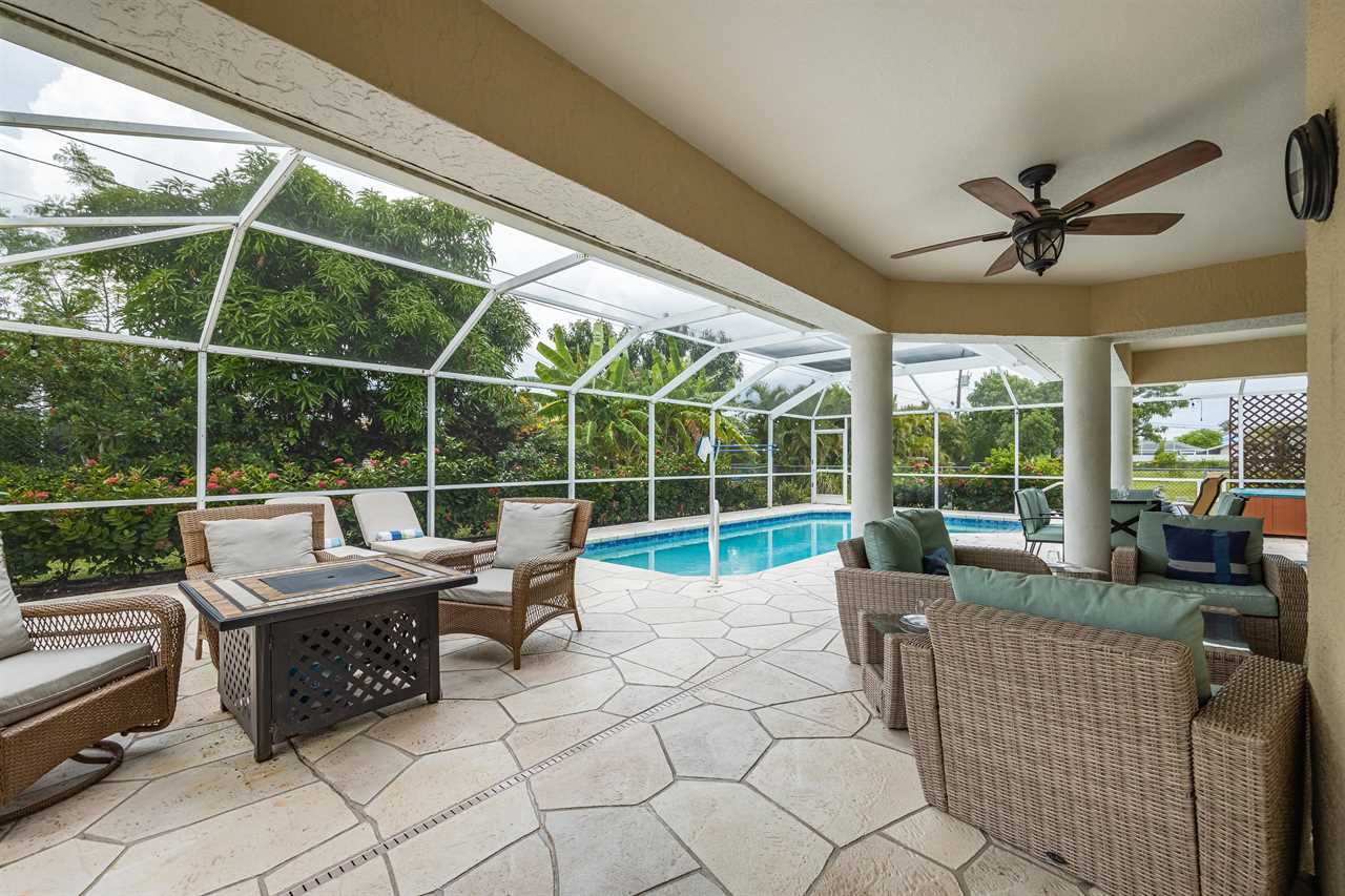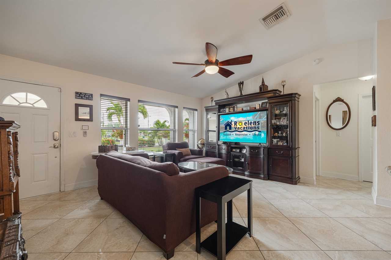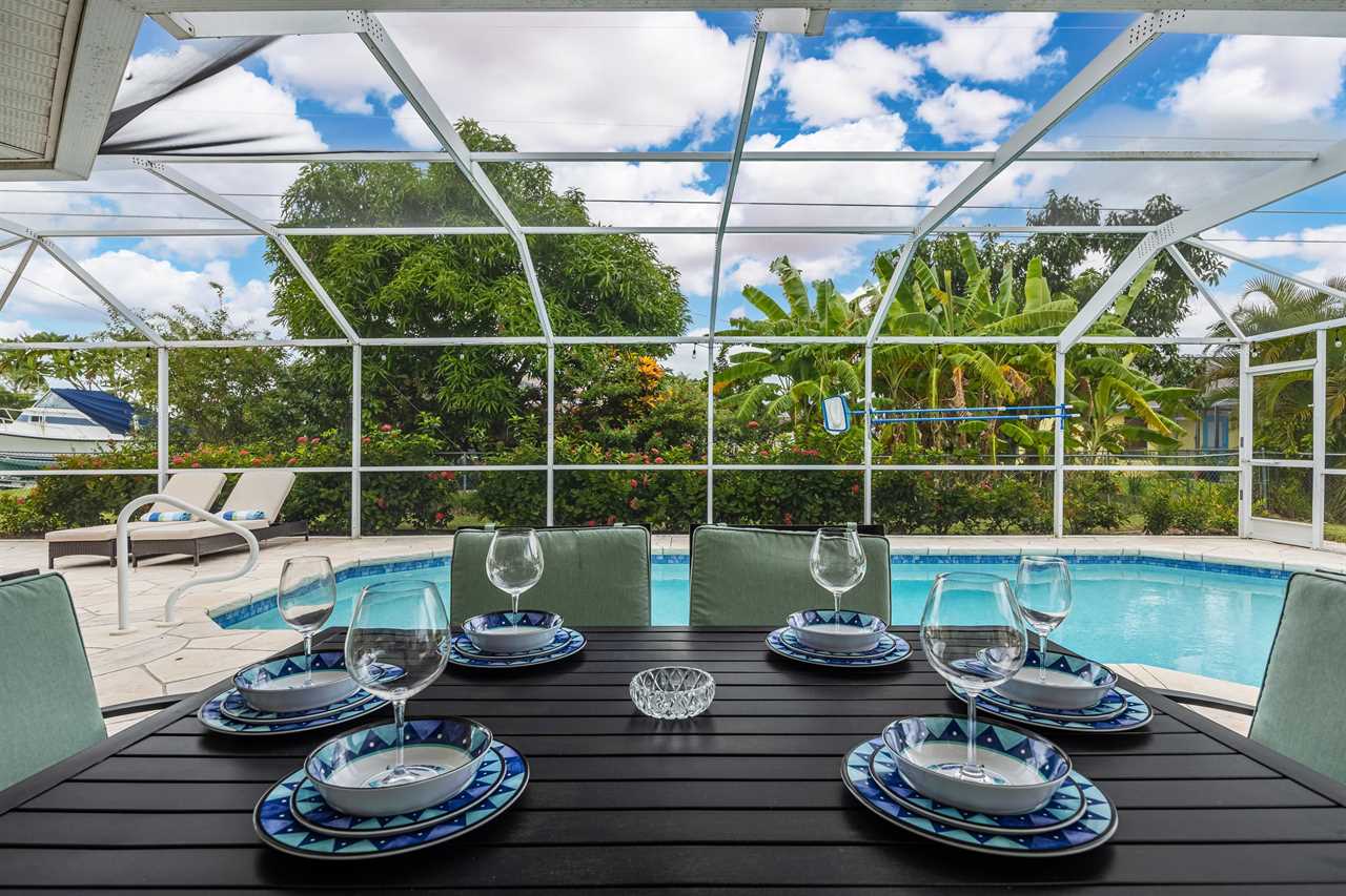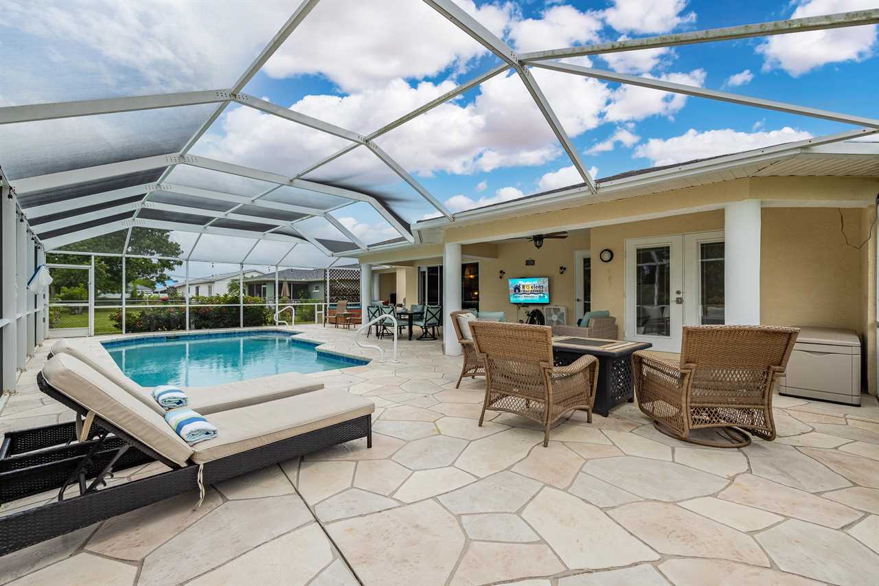 If you have not completely fallen for this villa yet, there is more. The outdoor entertainment area is amazing! With large flat screen TV, 3 separate outdoor seating areas, and features dog doors to the fenced backyard. This Villa is perfect for you and your pets! Looking for more? Serenity NOW is located in a prime SE Cape Coral neighborhood. So, whether you want to wander along a sandy hiking trail on the many local beaches, take a relaxing boating excursion, go on a sightseeing adventure or just enjoy a fine dining experience – Villa Serenity NOW is the perfect villa for you! This Villa does NOT offer garage access.
