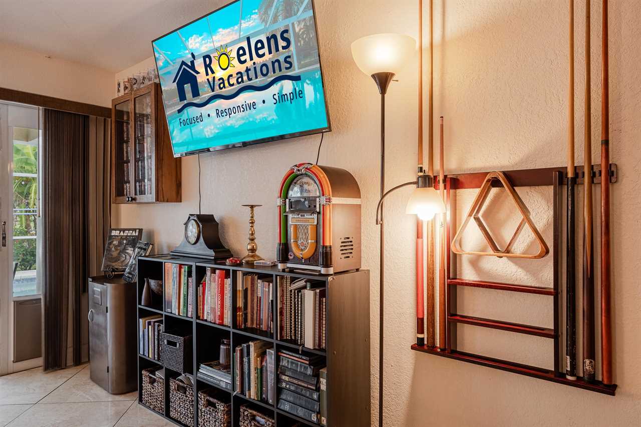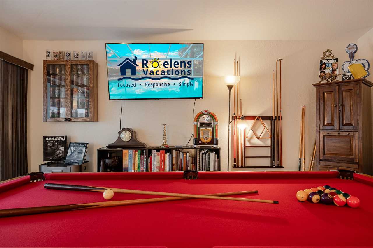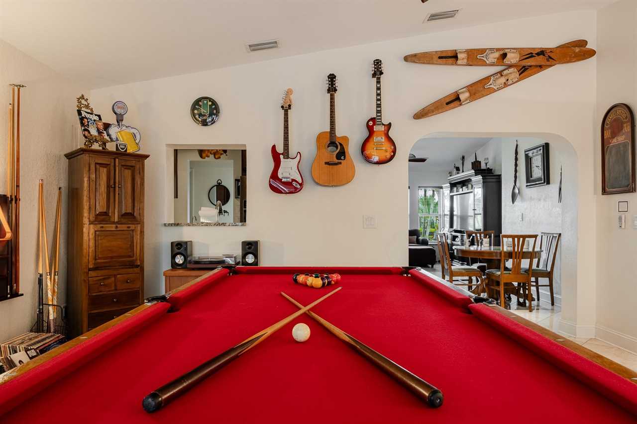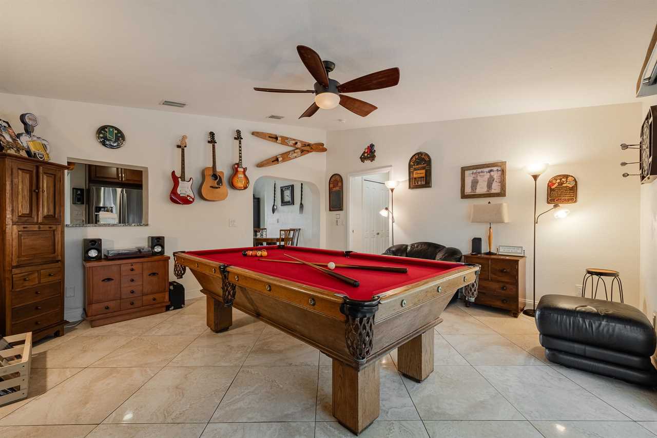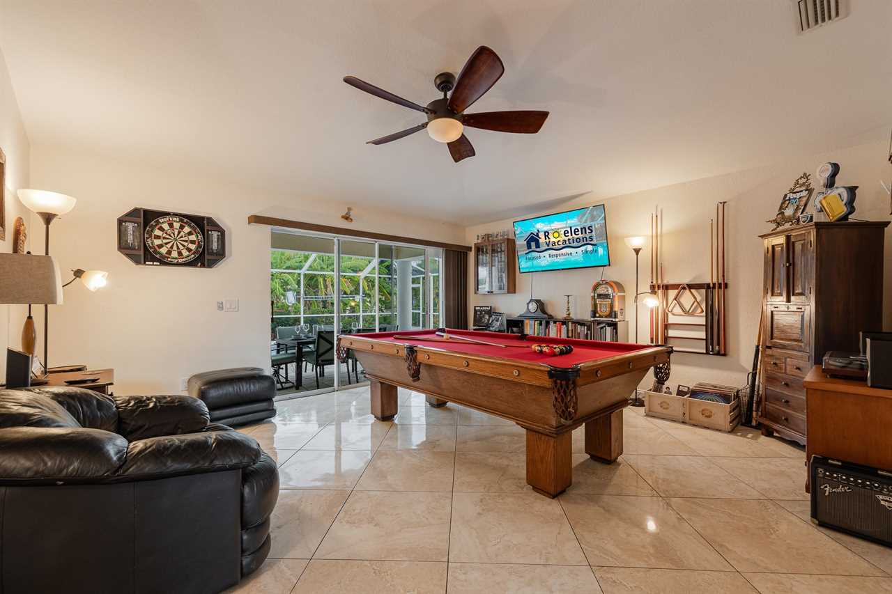 The family room decorated with large flat screen TV, dartboard, pool table, and guitars, has direct access to the lanai with lovely large sliding glass doors that let in tons of natural light. Relish a hot morning coffee watching the sun rise, breathing new life into our fabulous sunshine state. Sunbathe by the pool and enjoy soaking up some of the Florida rays with beautiful Northern Exposure! Cozy up on the sun loungers and enjoy the beautiful Florida sunsets. Looking to love the outdoor living space even more? Fire up the offered BBQ grill and serve dinner poolside at your outdoor dining table with the gorgeous Florida breeze!