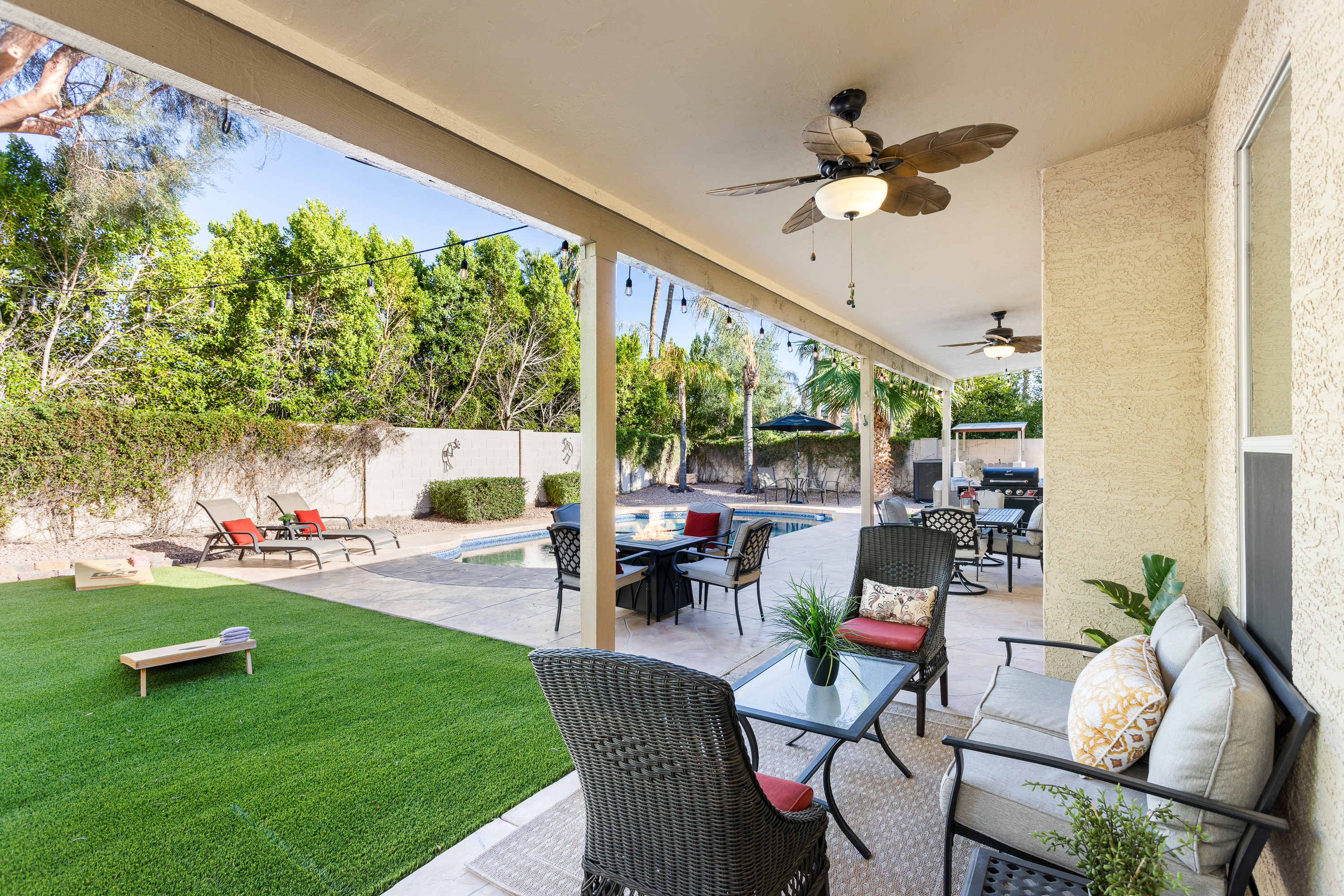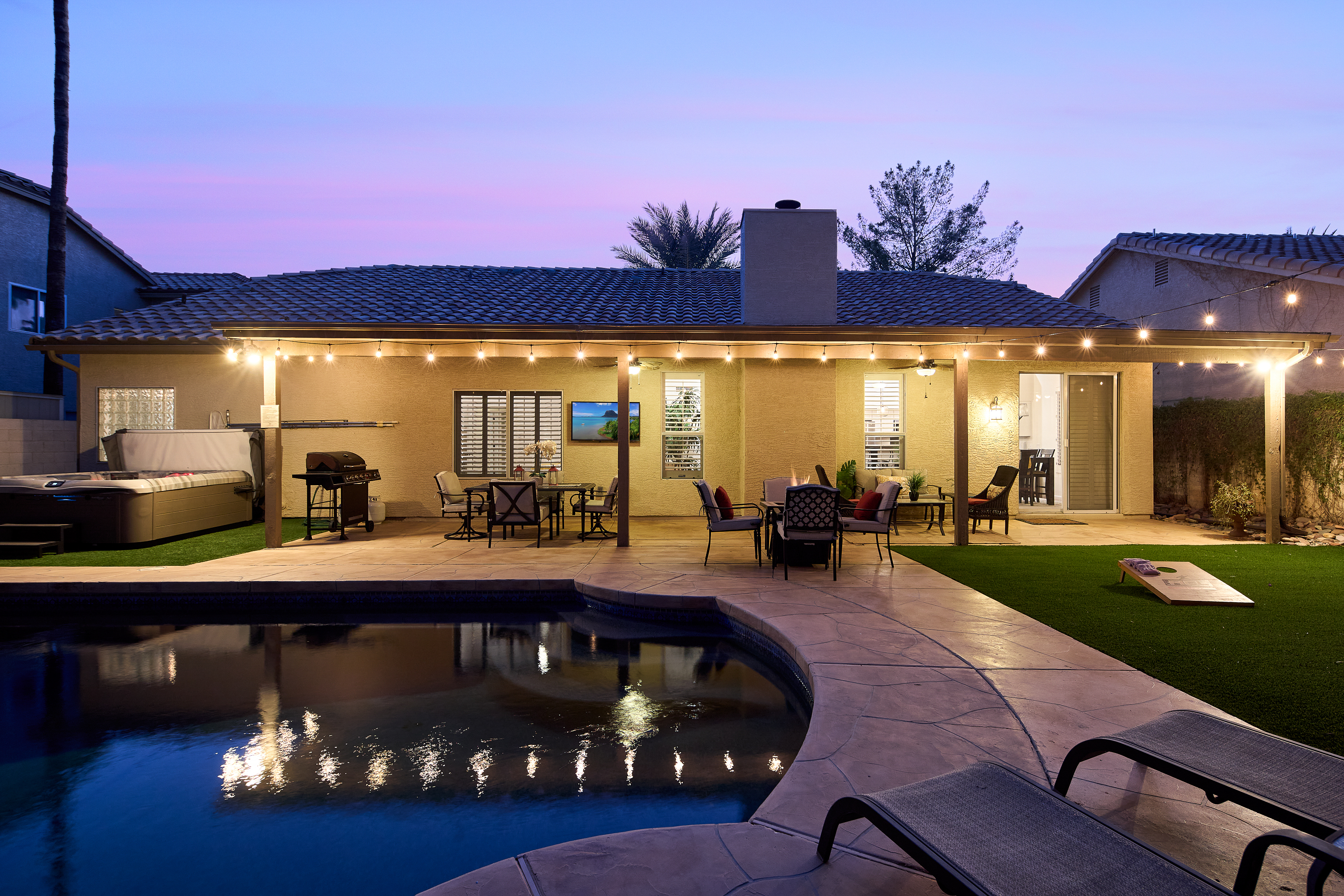 -Outdoor Gas BBQ, turfed lawns, covered patio with plenty of seating, dining table, lounge chairs, Pool Floats + electric air pump