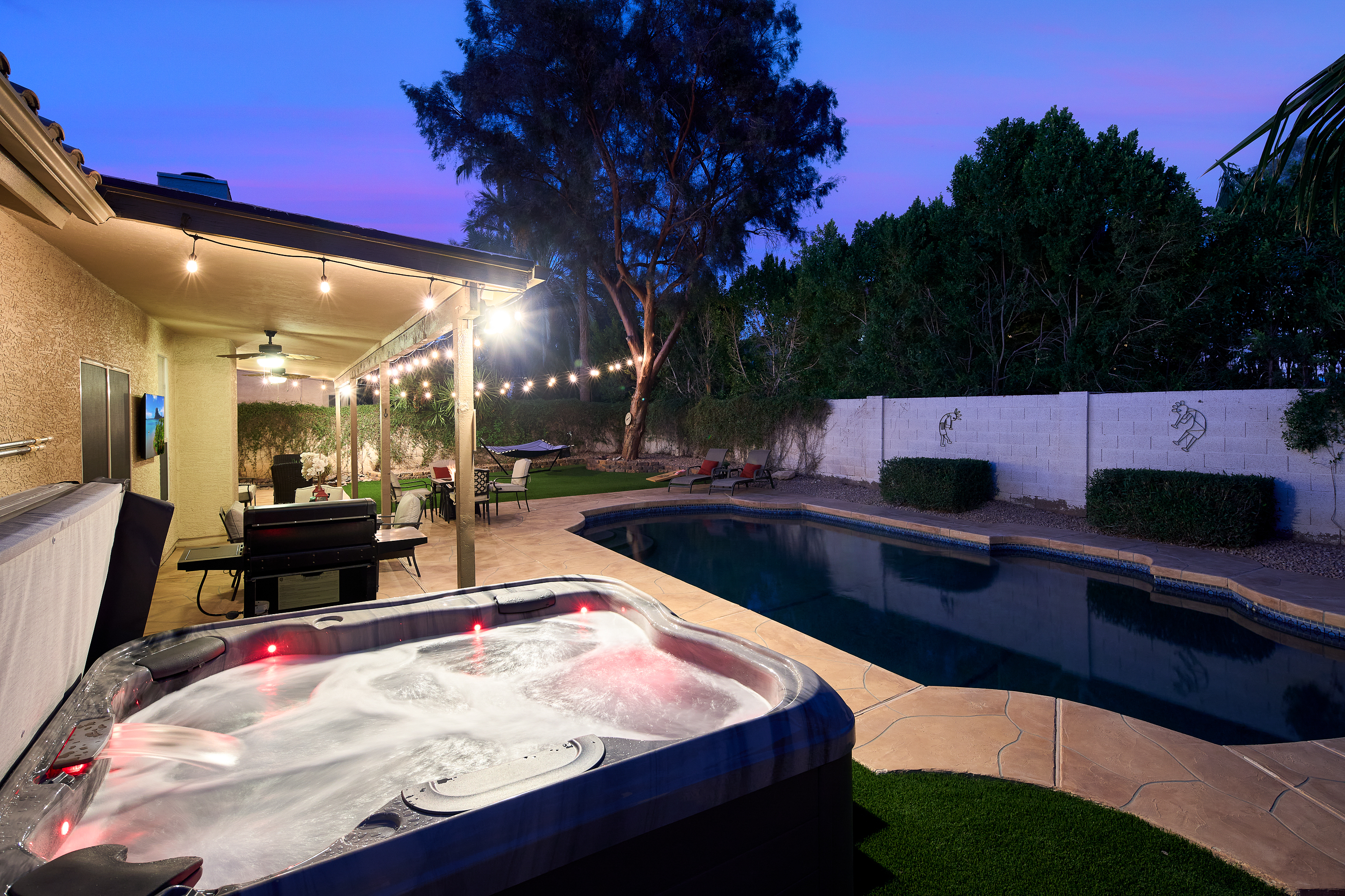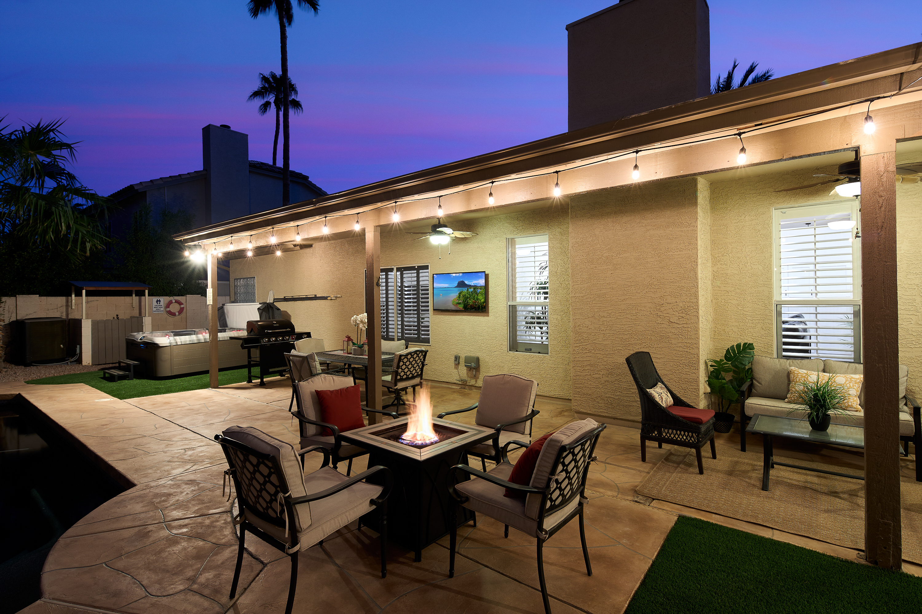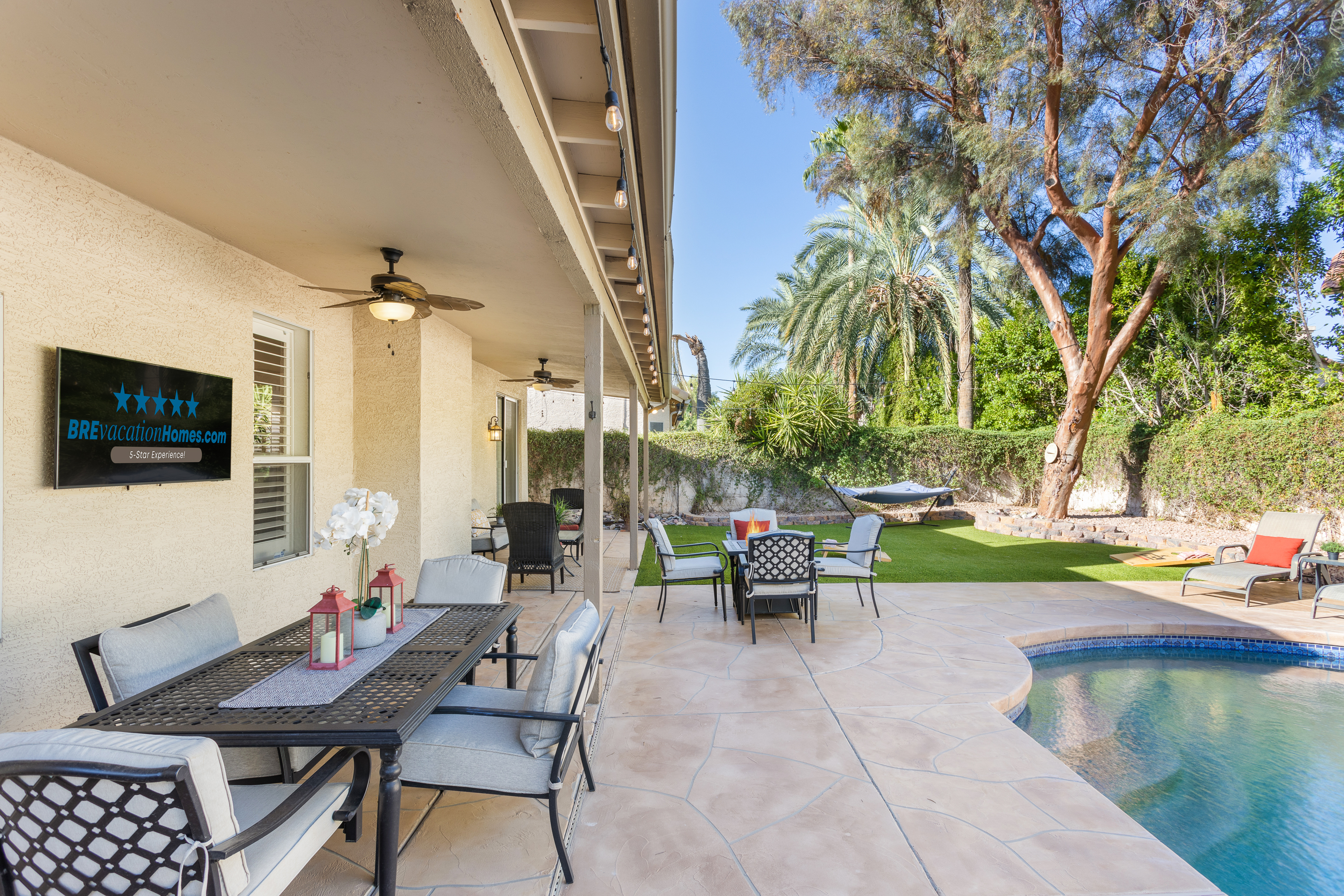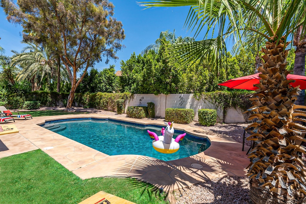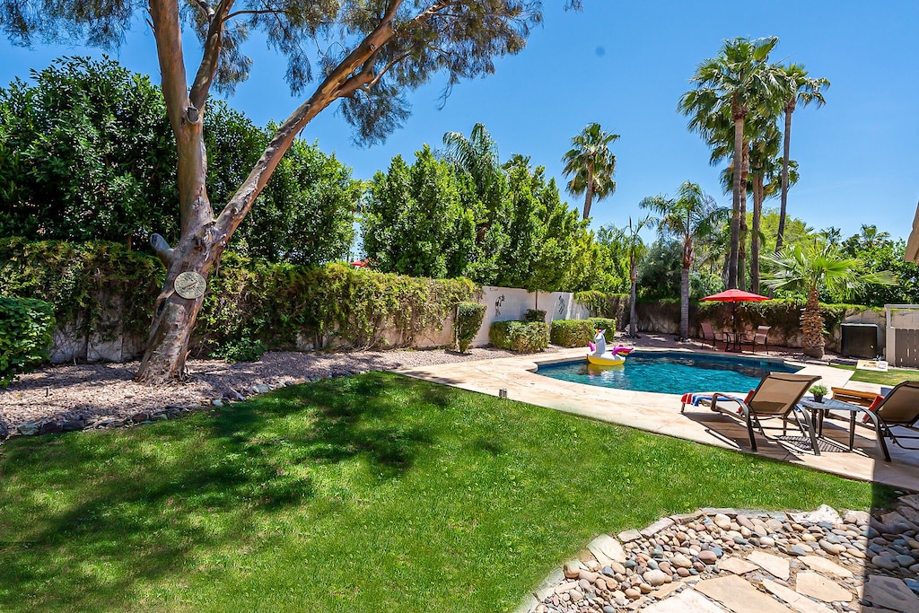 No Rental Tax on 30+ Night Stays! Beautiful Scottsdale Property in an Excellent Central Location near Kierland by seasoned 5-Star owner/hosts who aim to deliver a superior experience. There is a big difference - attention to detail and excellent service is what you'll receive from us. Near all the Popular Hot Spots: Kierland, Scottsdale Quarter, Old Town, Phoenix Open, Spring Training Baseball, World-Class Golf, Hiking, Shopping, Medical (Mayo Clinic, Envita, more). Open Floor Plan, Vaulted Ceilings and beautiful NEW upgrades: Stainless Steel Appliances, Quartz Countertops, Luxurious Master Bath, Designer Finishes, Office and Fast WiFi. Private Oasis Backyard, Heated Diving Pool, 6-person Hot Tub, Fire Table, Extended Covered Patio and Gas BBQ Grill. Soak in the warm AZ Sun on the large hammock or sun loungers. Quality furnishings throughout, 2 King Size Beds, 5 Smart TVs+New Universal EV Charger in the 3-Car Garage. Unwind playing ping pong, corn hole and taking a short stroll to the gated neighborhood park, coffee shops and restaurants.