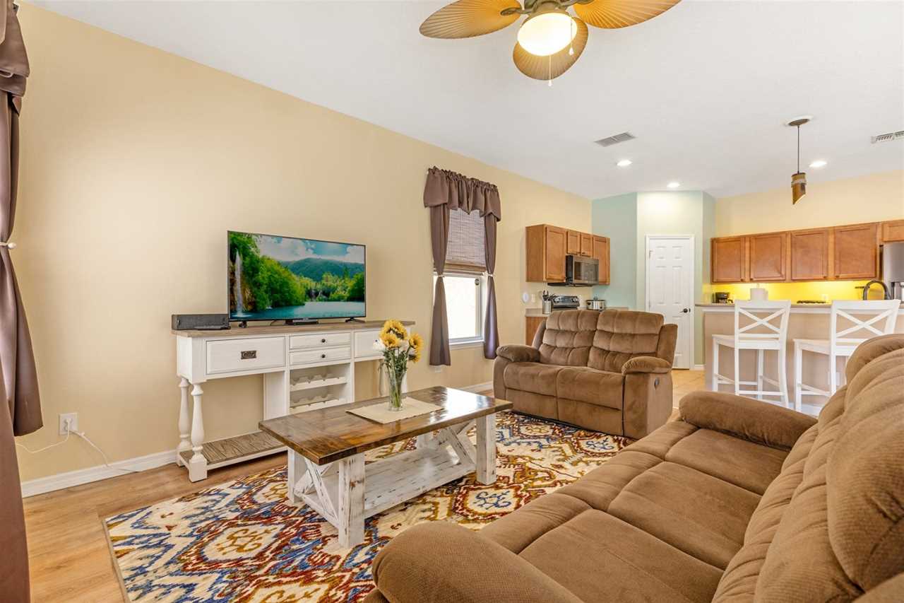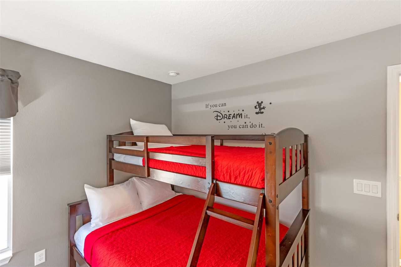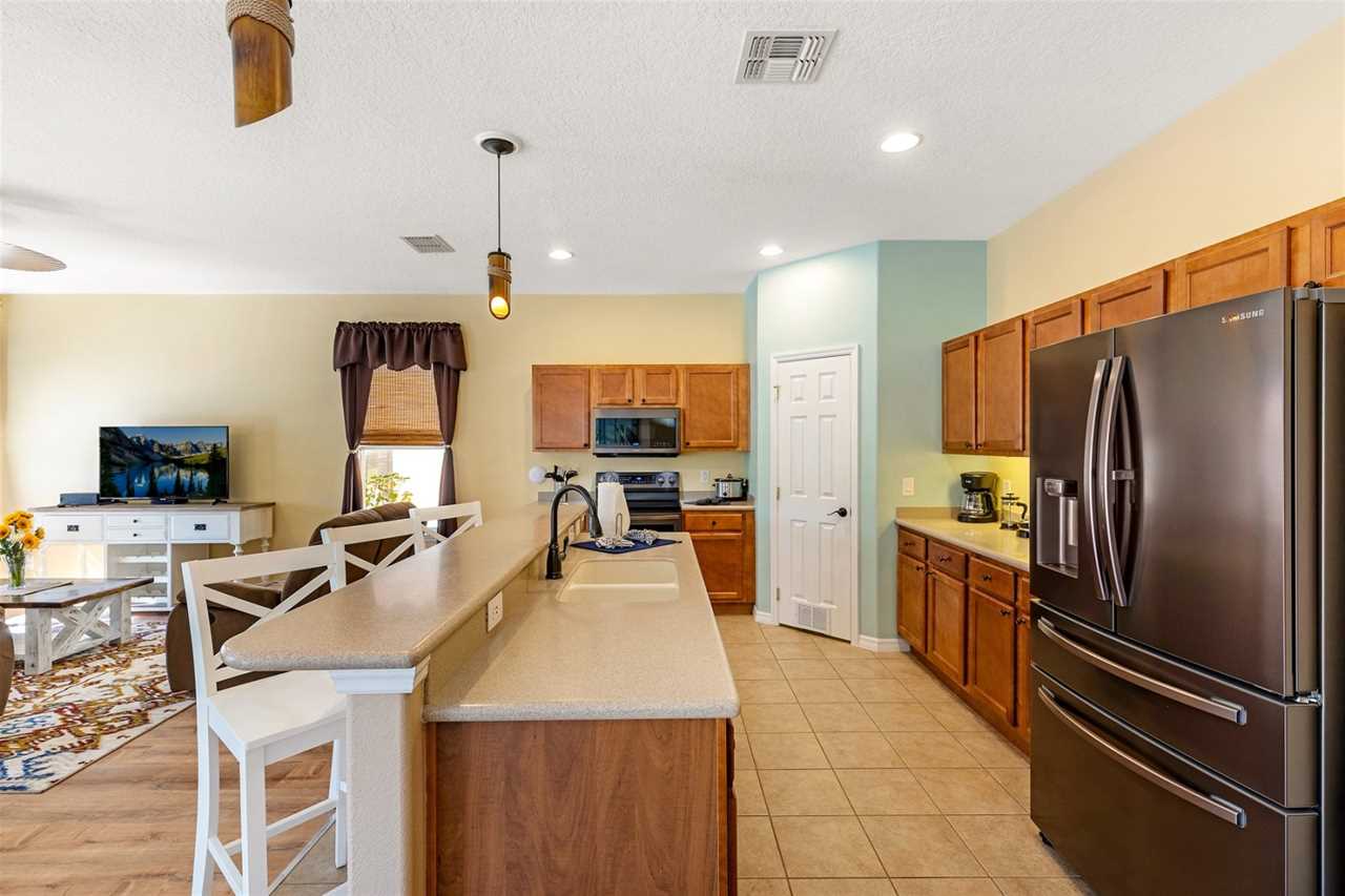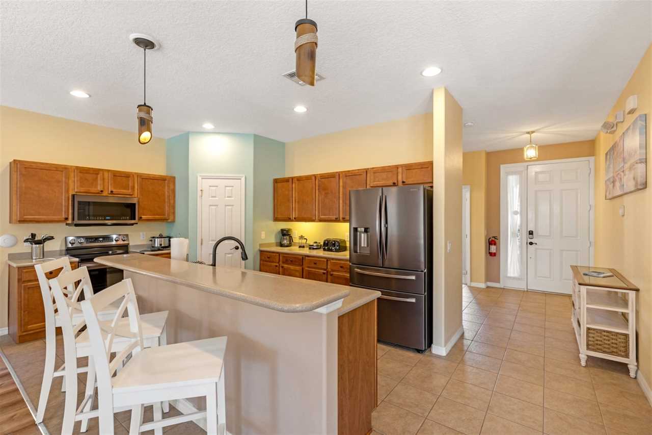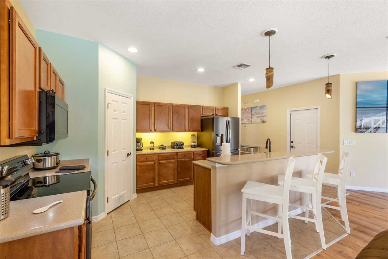 Beautifully maintained family oriented 4 bedroom, 4 bath home located in the fabulous resort style gated community of Watersong. This home away from home is perfect for rest and relaxation. Situated on a corner lot with no rear neighbors, overlooking a conservation area. Beautifully paved lanai with smart tv and enclosed heated pool and spa are just where you want to be! This up to date home features 4 bedrooms with 4 en-suite bathrooms. First floor bedroom features Queen bed and TV. 3 additional bedrooms on 2nd floor: Queen with TV, full and twin with tv , pyramid bunk with full and twin in final bedroom. A loveseat has also been added to the upstairs queen for additional seating. This home features all the luxuries of home to include fully equipped kitchen, washer and dryer. Family board games, air hockey table, Golden Tee golf, pool toys, pack and play, stroller and high chair. Easy highway access and close to Orlando, this property is sure to suit all your needs.