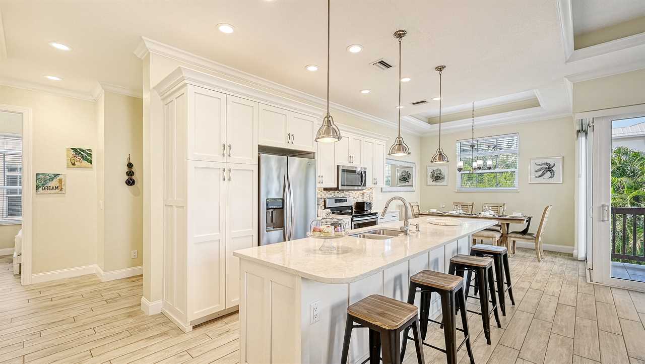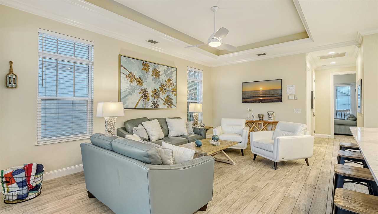 This vacation unit offers four bedrooms and three full bathrooms, offering ample space for up to 12 guests. The sleeping arrangements consist of three king beds, one queen bed, one queen sofa sleeper, and two twin chair sofa sleepers, all with linens provided for your convenience. Casa Junonia is also equipped with a full kitchen and all of the amenities needed to prepare a delicious meal. For added convenience and peace of mind, the property also features a private garage, with a total capacity of two cars. This ensures that guests have ample space to park their vehicles, with added security and protection.
