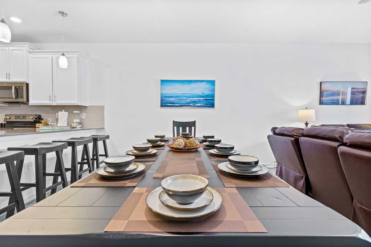 Unwind and socialize in the spacious living area, featuring a 65-inch TV for immersive entertainment. The dining table comfortably seats eight guests, perfect for enjoying delicious meals together. Additional bar seating for five provides a casual and inviting space for enjoying snacks or drinks.