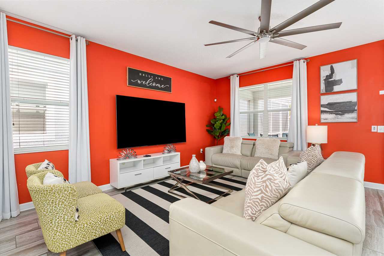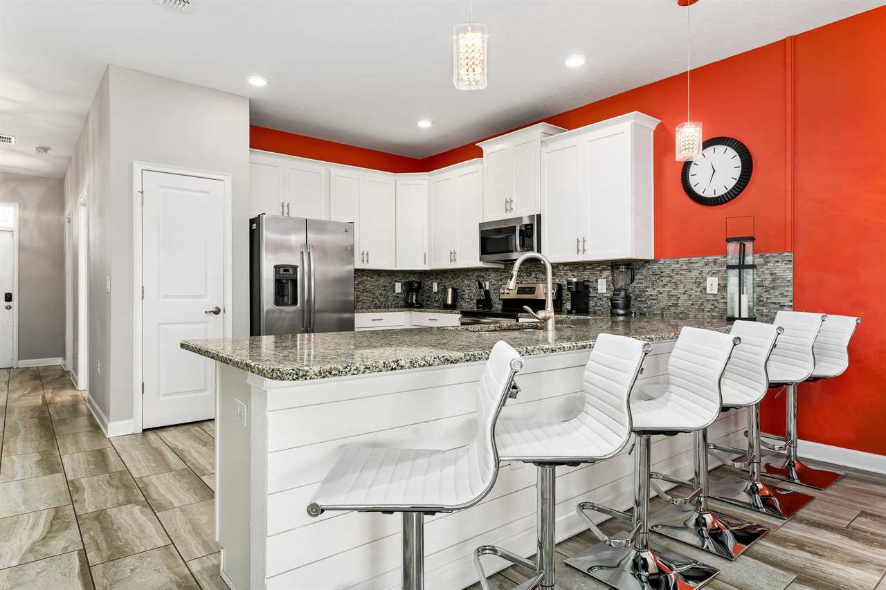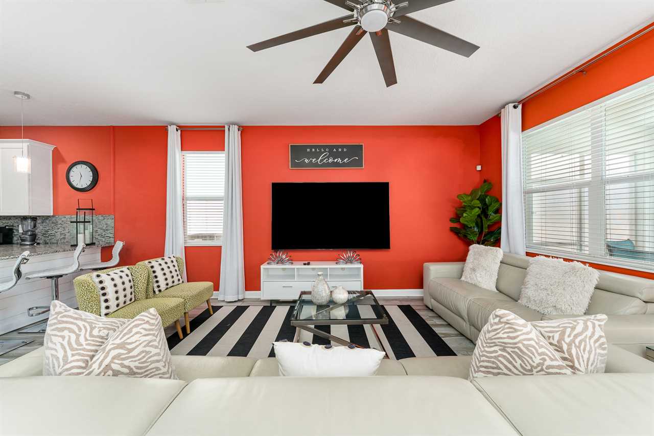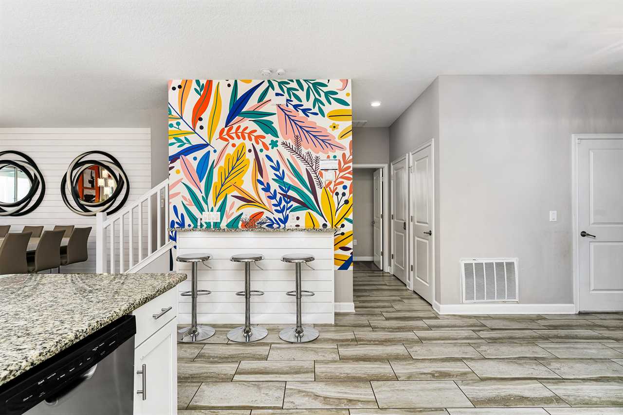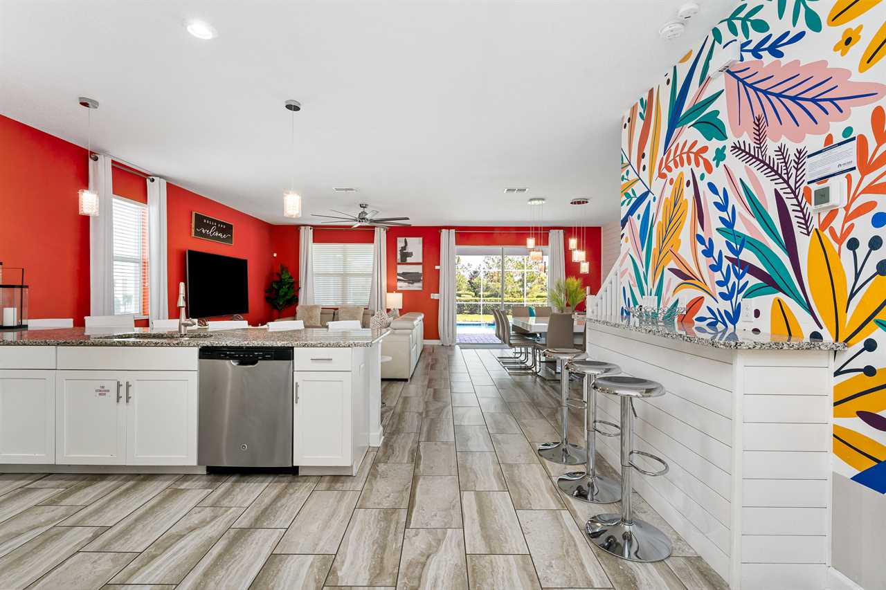 As soon as you enter the home, you are greeted with modern decor that sets you perfectly in vacation mode. The open living area includes a custom-built bar, perfect for getting some work done or extra dining.