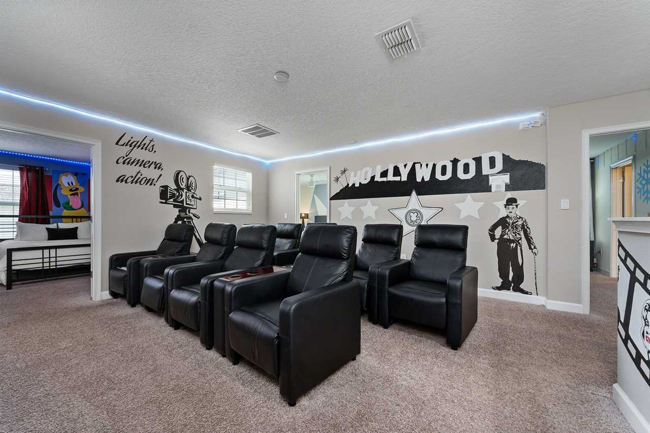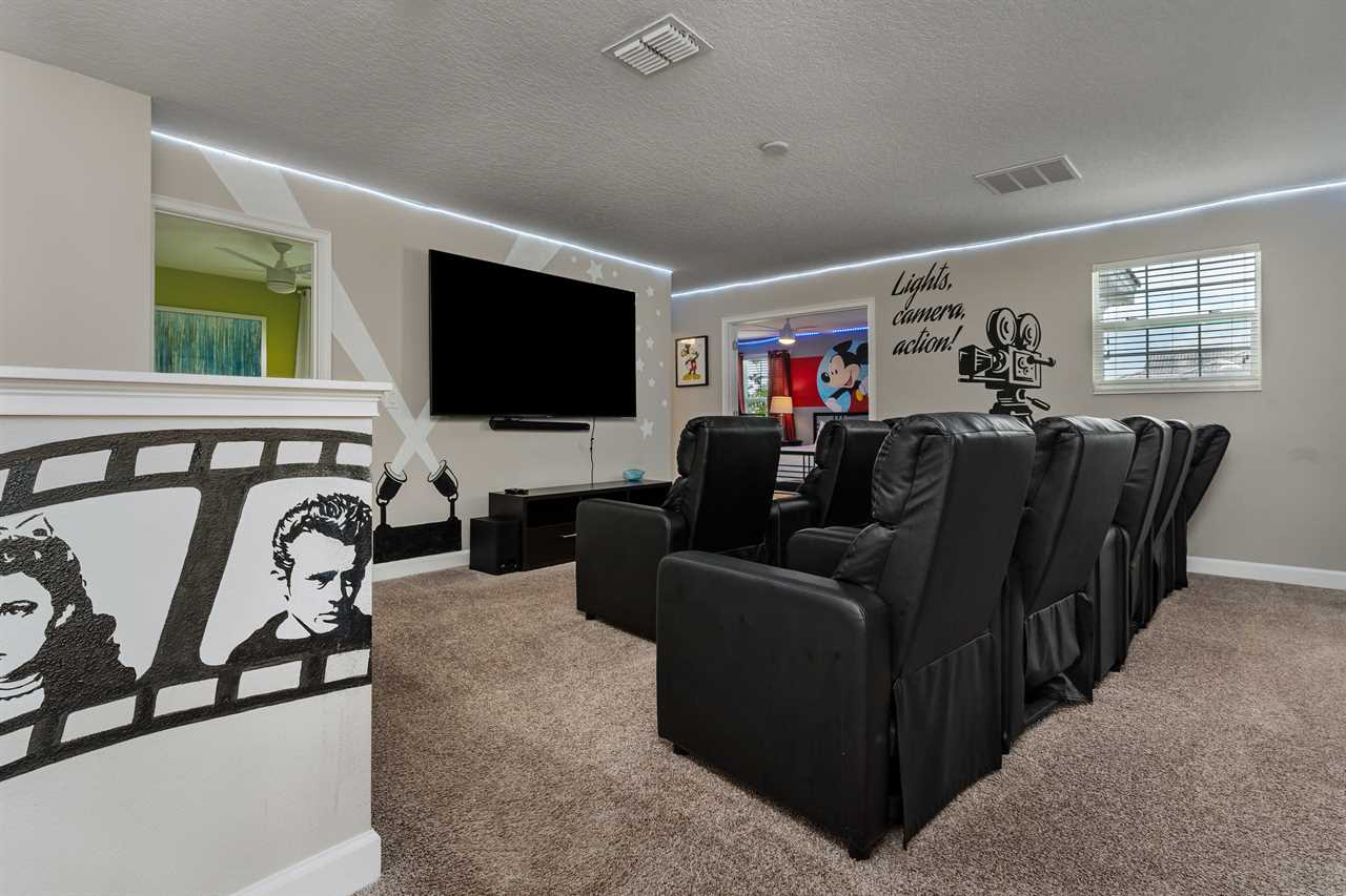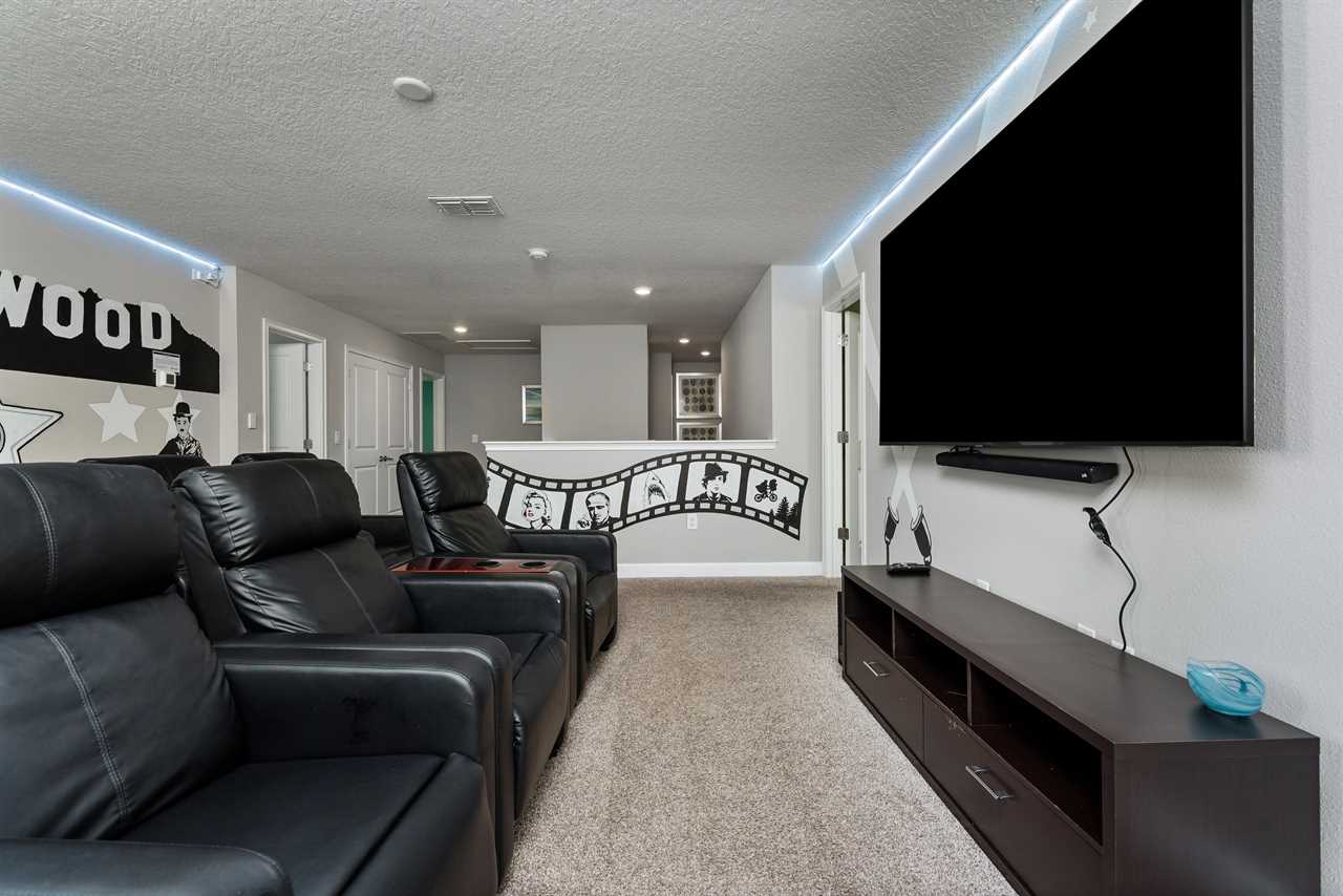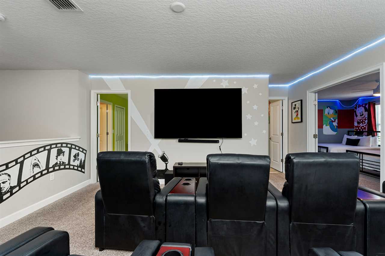 If you thought the entertainment was going to end in the arcade, you were mistaken! Upstairs, the loft has been converted into its own private movie theater offering guests nine movie-style reclining chairs with cupholders to enjoy watching their favorite movie on the 85-inch wall-mounted smart TV with a sound bar. LED lights surrounding the room help give an even more realistic theater feel. A full bathroom located just off the theater has a tub/shower combo.