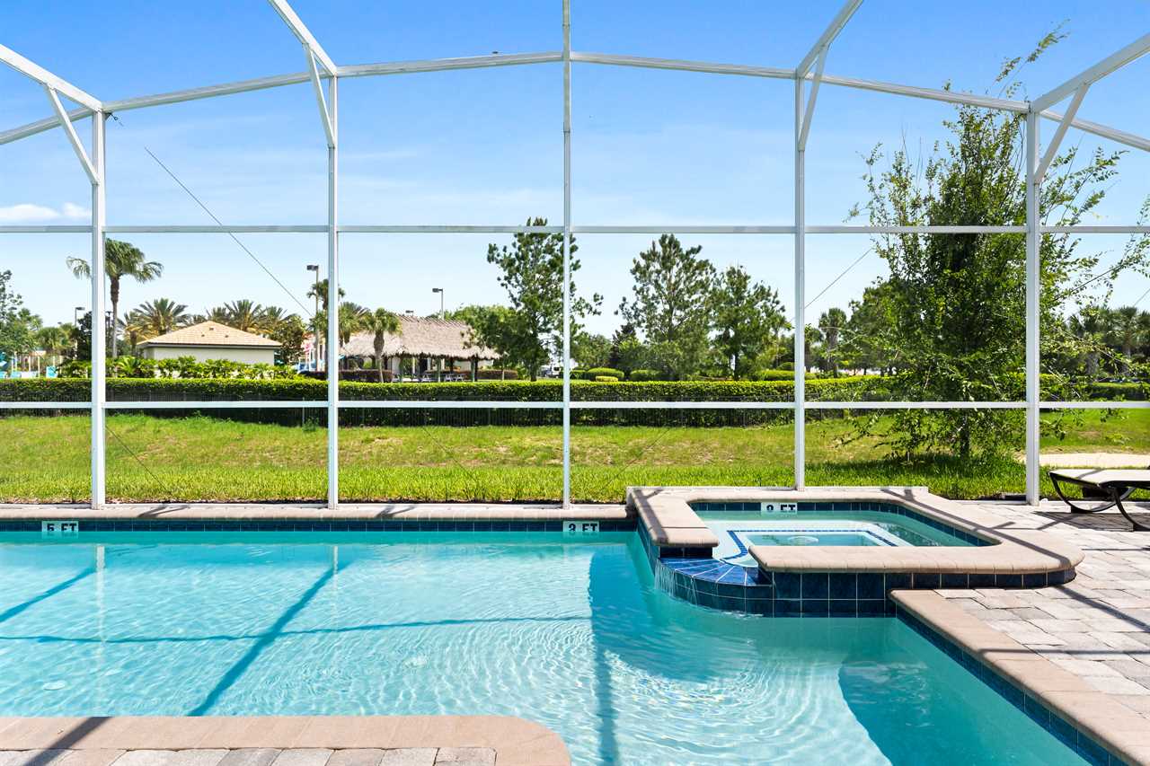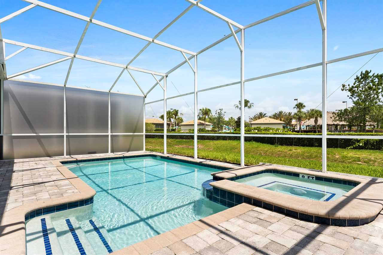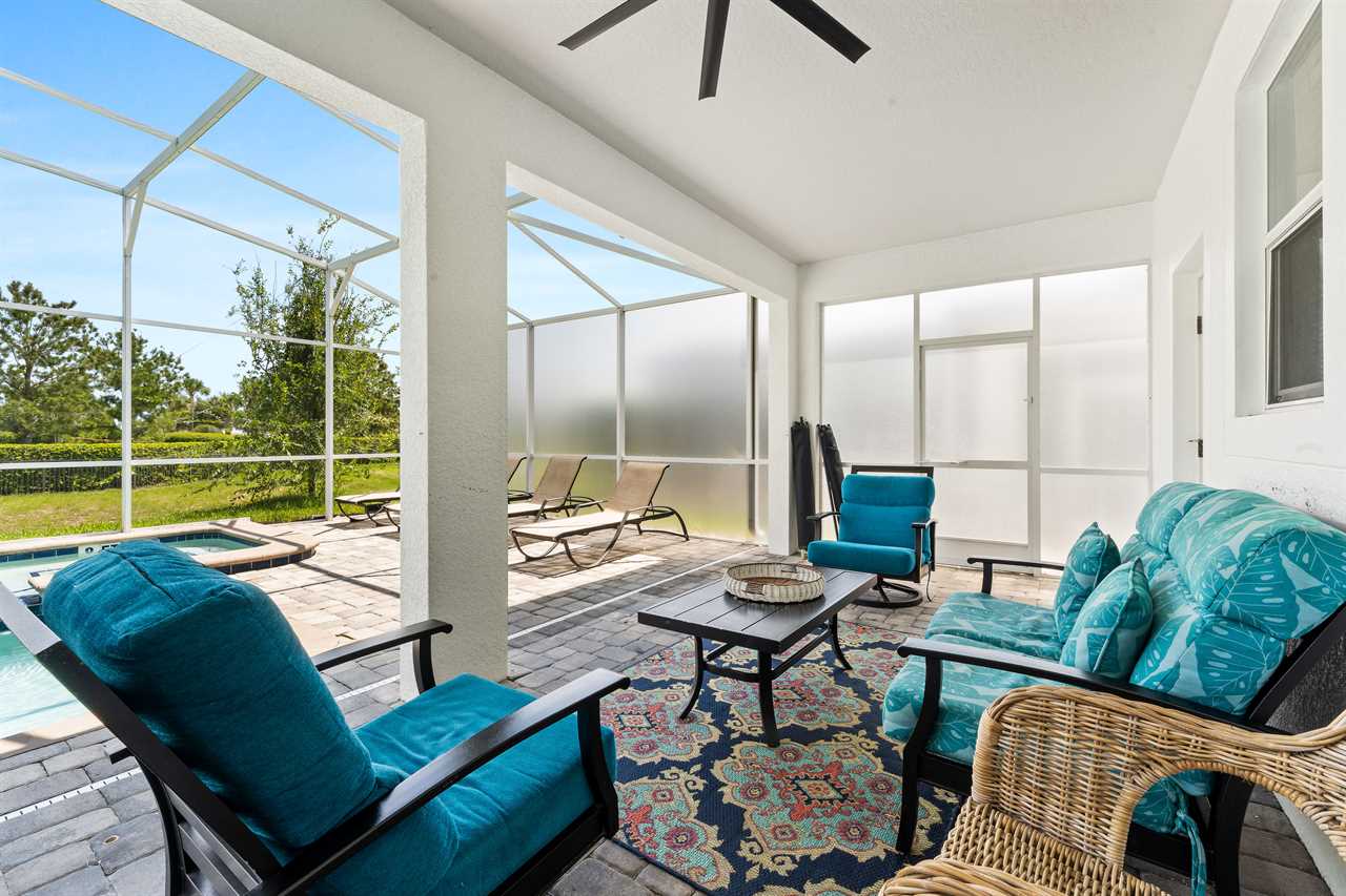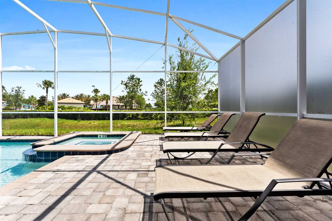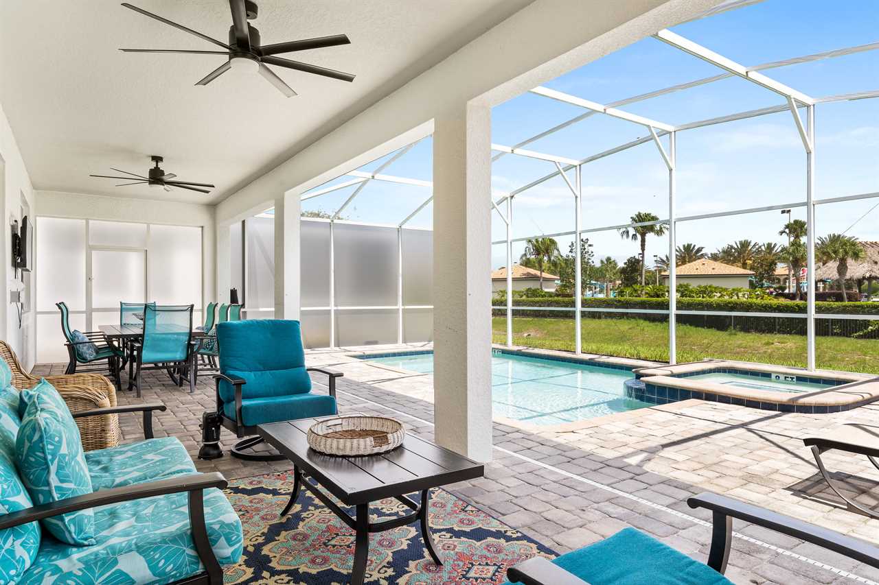 The living area opens up to the private pool area, which provides panoramic views of the Oasis Club, truly transporting you to a resort-like atmosphere. Florida Glass surrounding the patio provides privacy from the neighbors. If you are not soaking in the spillover spa or pool, you may find yourself lounging on one of the four sun loungers. If you prefer the shade, grab a book and grab a seat in the covered living area, or watch a show on the wall-mounted smart tv. Florida provides some excellent weather for outdoor dining, so guests will be delighted to enjoy a meal on the covered outdoor dining table for eight. Two outdoor fans are perfect to keep the warm air flowing on the hot summer days.