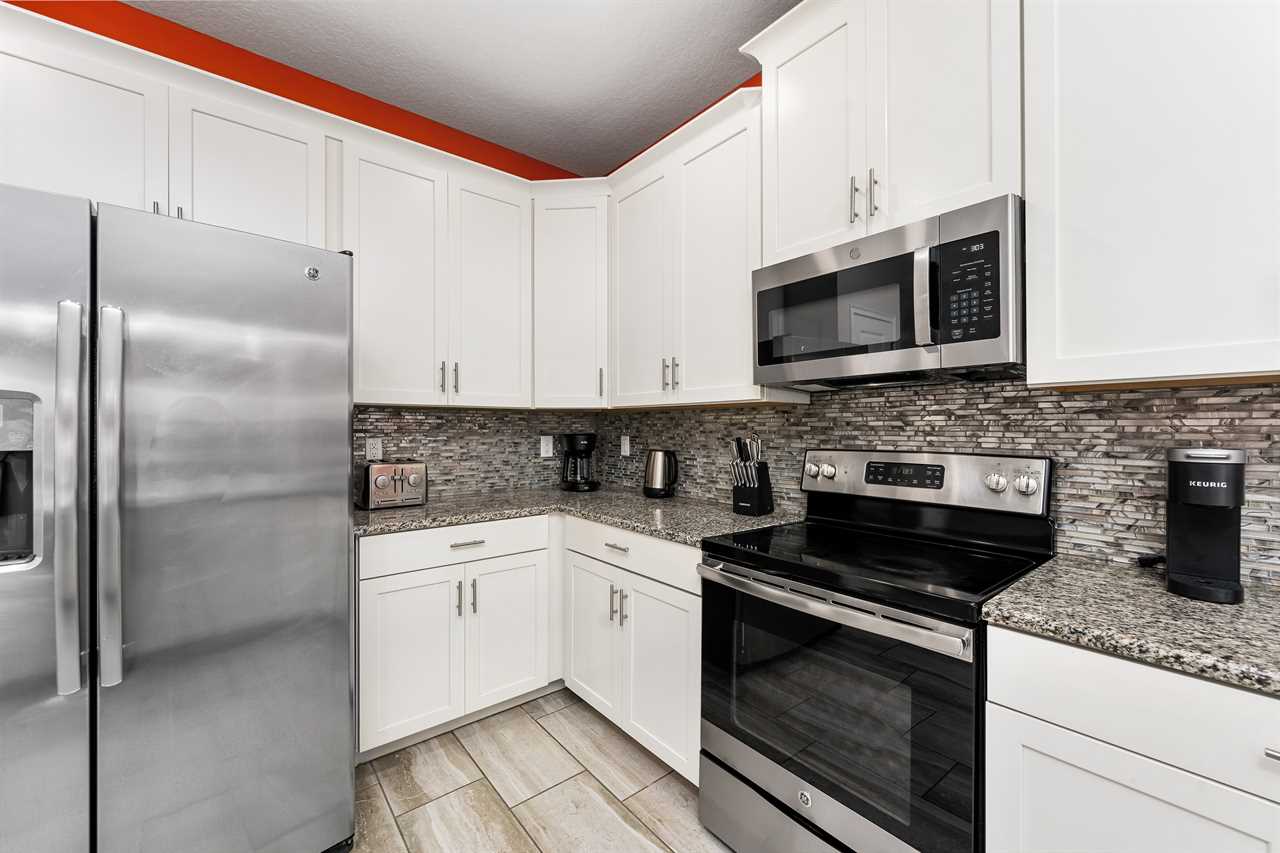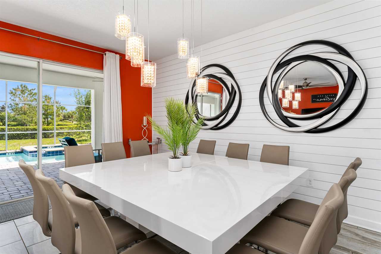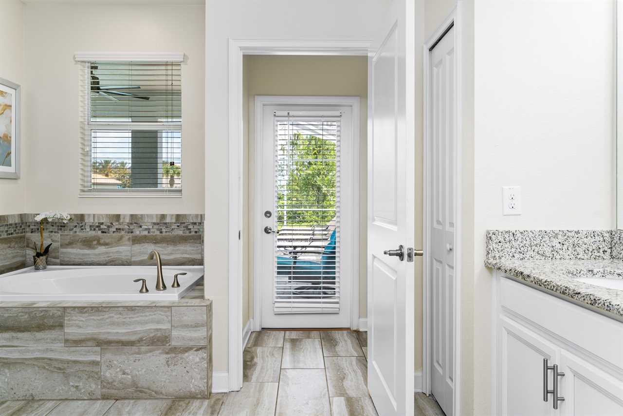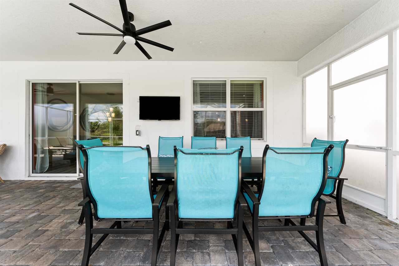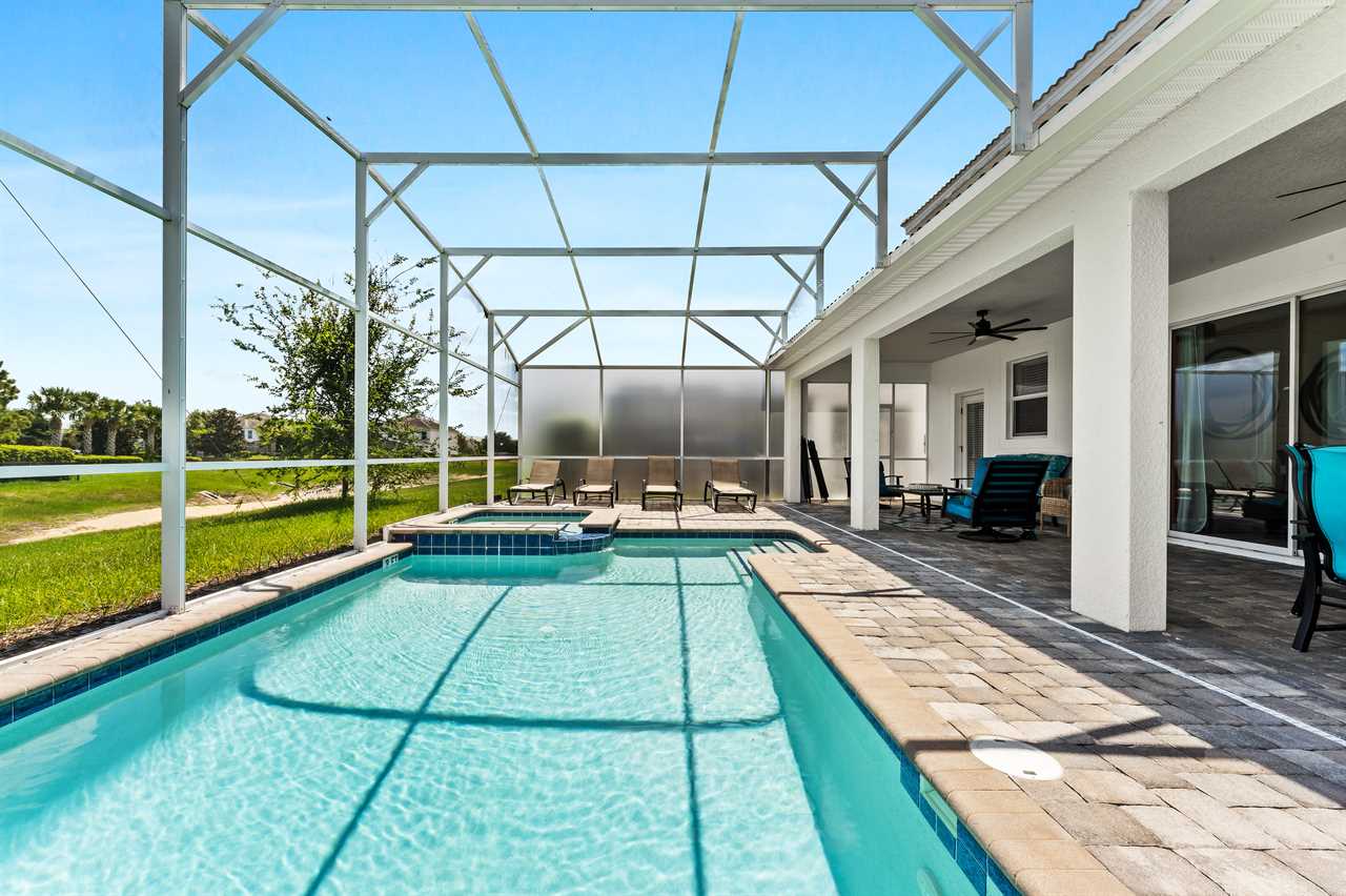 The living area opens up to the private pool area, which provides panoramic views of the Oasis Club, truly transporting you to a resort-like atmosphere. Florida Glass surrounding the patio provides privacy from the neighbors. If you are not soaking in the spillover spa or pool, you may find yourself lounging on one of the four sun loungers. If you prefer the shade, grab a book and grab a seat in the covered living area, or watch a show on the wall-mounted smart tv. Florida provides some excellent weather for outdoor dining, so guests will be delighted to enjoy a meal on the covered outdoor dining table for eight. Two outdoor fans are perfect to keep the warm air flowing on the hot summer days.