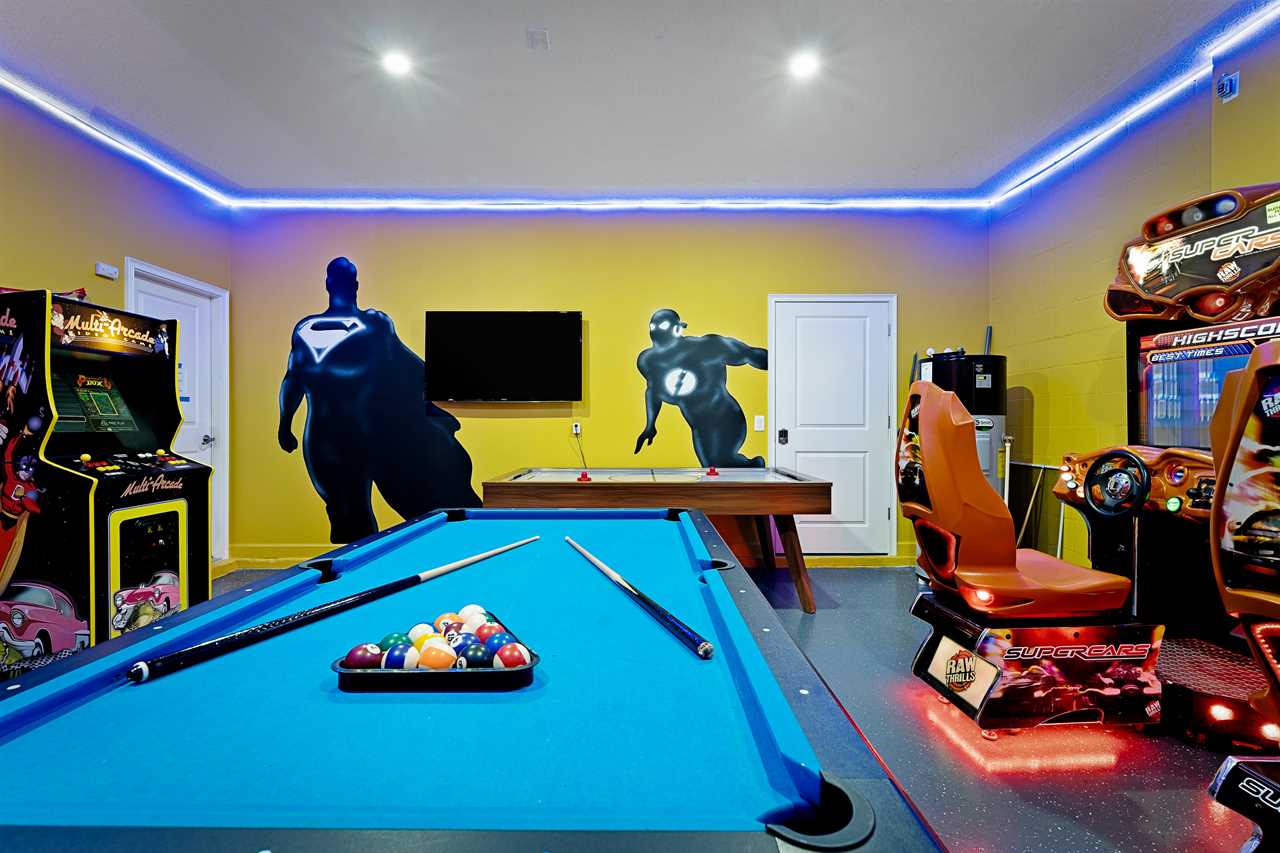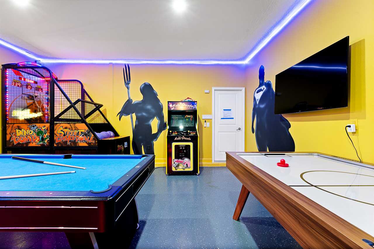Before heading upstairs, enjoy some time in your very own private arcade, no coins are needed! Family rivalries will begin with many options to challenge each other. Strap in and go ahead to head on the Fast & Furious, side-by-side racing arcade. For the hoopsters in the family, plenty of time will be spent trying to get the highest score on the Street Basketball arcade. The true arcade fans will have some nostalgia as they get to play head-to-head on a multi-arcade video game that includes tons of retro games for you to enjoy. Some believe that air hockey and cool should be an Olympic sport, and on your family vacation, it can be, as both of these are also included in your private Arcade! Video game fans will enjoy a custom game station with 55-inch TV matching gaming chairs, and Xbox game station. Everyone will be able to take their favorite show movie or game on the separate 55-inch wall-mounted smart TV. With all of this entertainment in your own vacation home, you will find yourself not having to go out to parks and local attractions as much. The hassle of not dealing with crowds, and paying for all of the extras, will truly add value to this vacation.