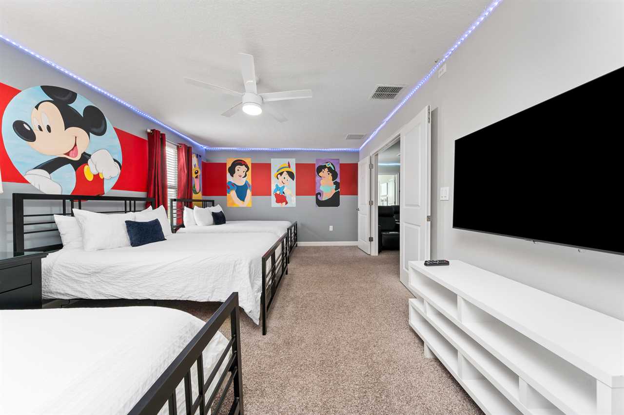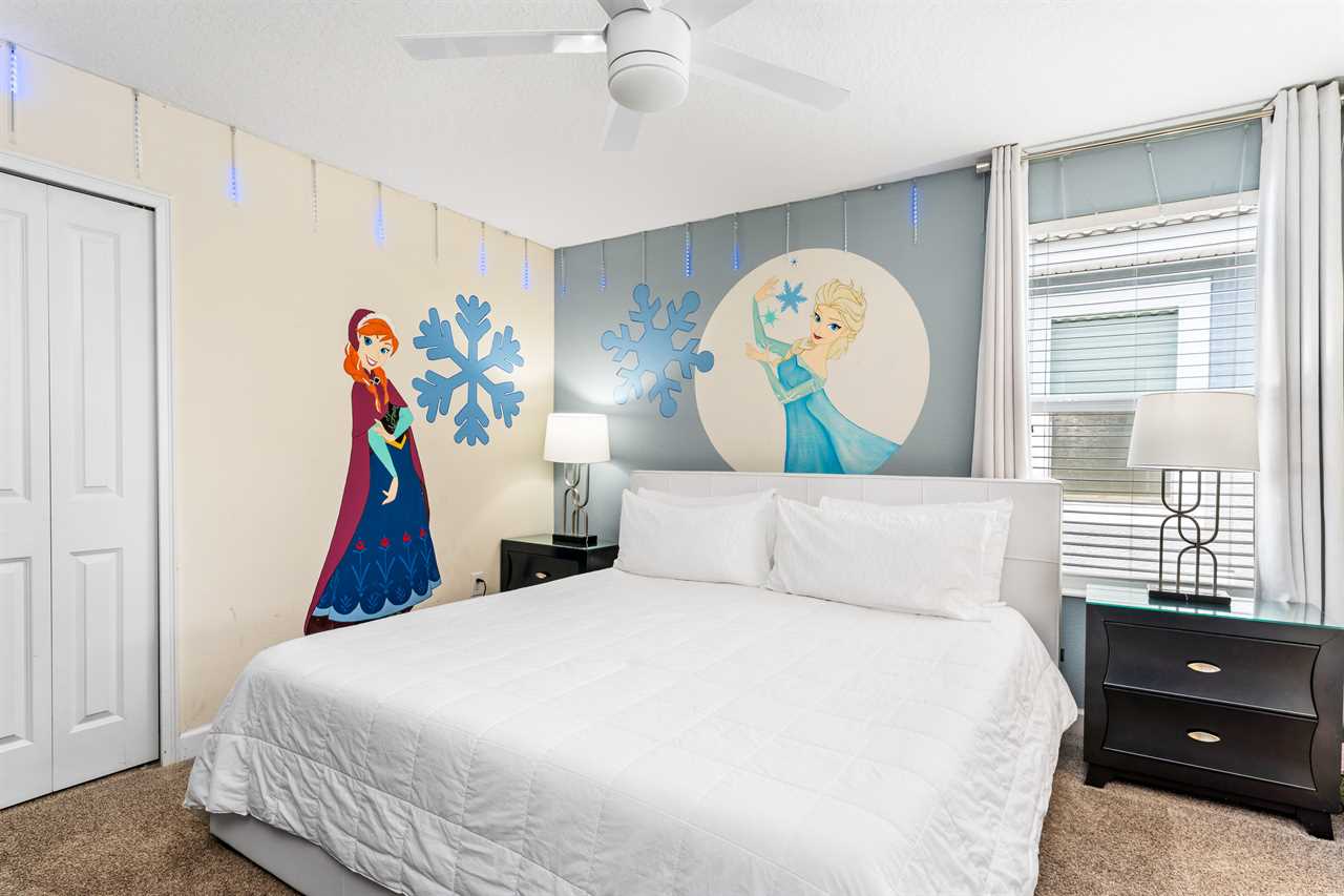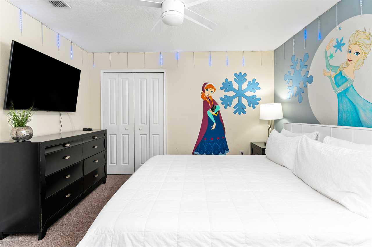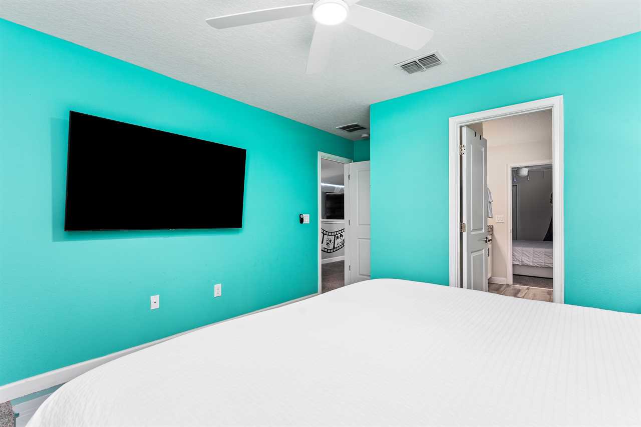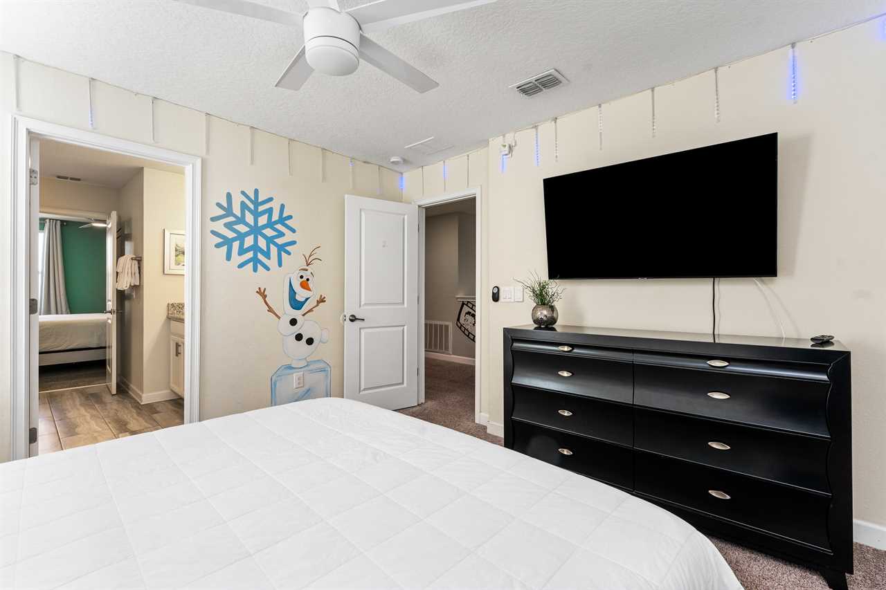Get whisked away to a much colder land in the middle king bedroom. This bedroom, adorned with custom murals of a couple of our favorite princesses, and snowy pals, has custom icicle lights hung all around, giving a nice cool feel! A 55-inch wall-mounted. Smart TV is perfect for catching your favorite movies or shows in this room. Also includes a wall-controlled ceiling fan. This bedroom shares a bathroom that has a double vanity and shower, with the back king-corner bedroom. This King Bedroom also gives a nice Key West feel with teal walls all around and flamingo artwork on the walls. This room features a 65-inch wall-mounted smart TV, as well as a wall-controlled ceiling fan. Lastly, guests will tuck in at night in the upstairs king blue bedroom, which sits next door to the twin bunk room. This room has a 55-inch wall-mounted smart TV and wall-controlled ceiling fan for added comfort.