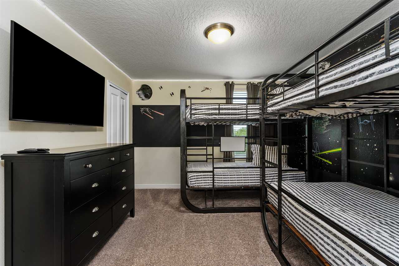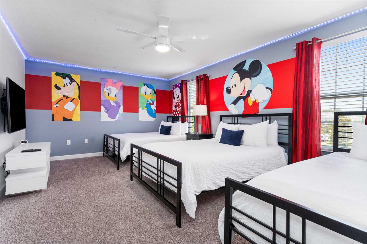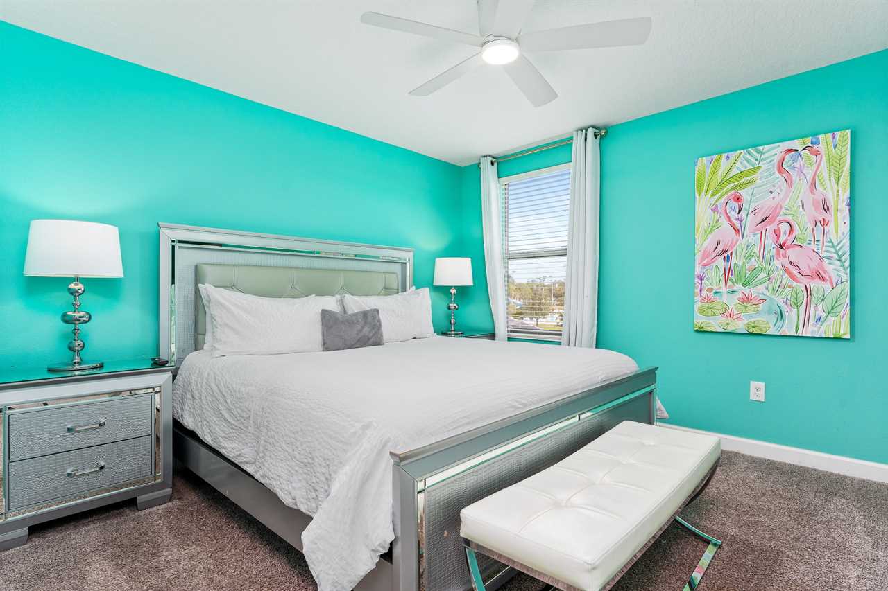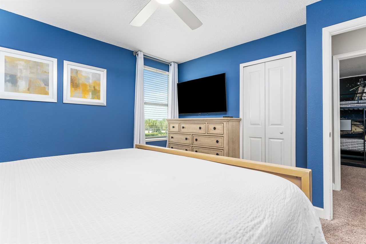 Get whisked away to a much colder land in the middle king bedroom. This bedroom, adorned with custom murals of a couple of our favorite princesses, and snowy pals, has custom icicle lights hung all around, giving a nice cool feel! A 55-inch wall-mounted. Smart TV is perfect for catching your favorite movies or shows in this room. Also includes a wall-controlled ceiling fan. This bedroom shares a bathroom that has a double vanity and shower, with the back king-corner bedroom. This King Bedroom also gives a nice Key West feel with teal walls all around and flamingo artwork on the walls. This room features a 65-inch wall-mounted smart TV, as well as a wall-controlled ceiling fan. Lastly, guests will tuck in at night in the upstairs king blue bedroom, which sits next door to the twin bunk room. This room has a 55-inch wall-mounted smart TV and wall-controlled ceiling fan for added comfort.