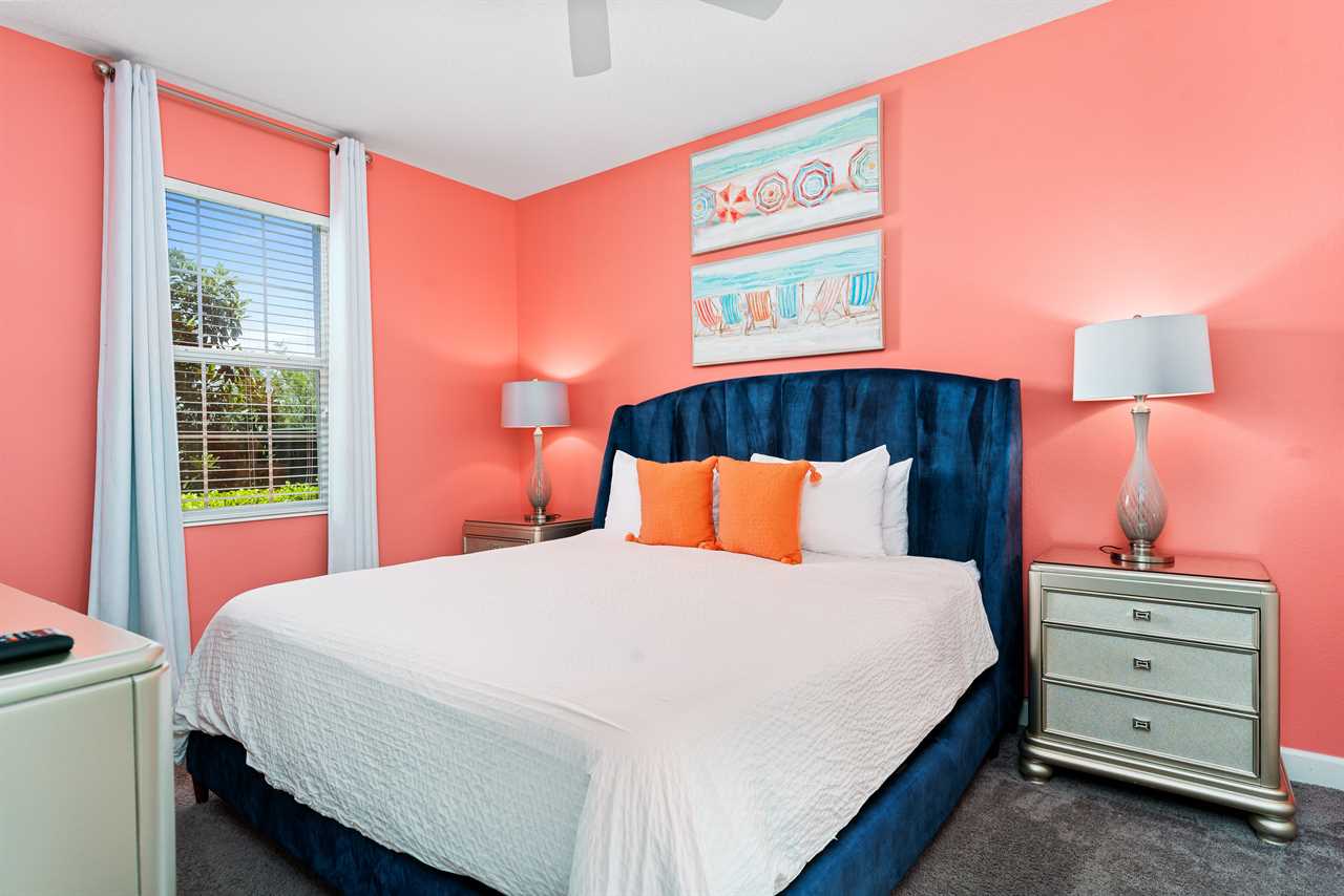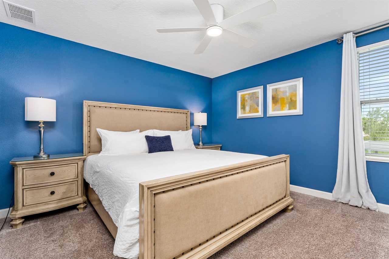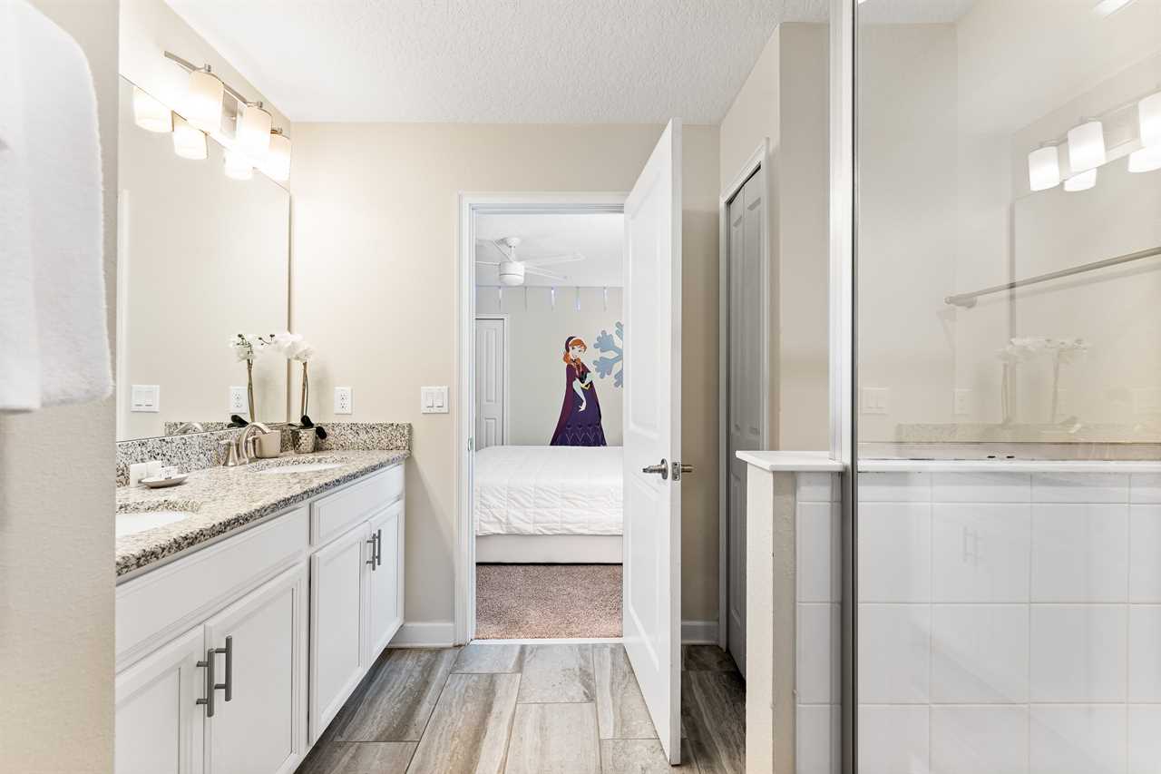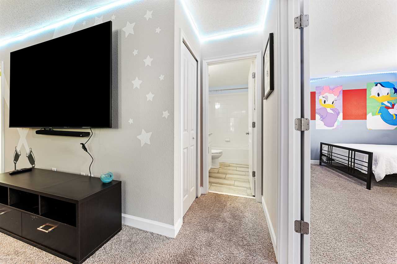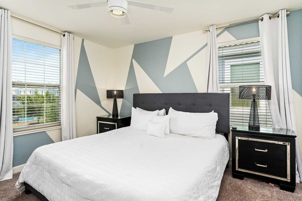 Get whisked away to a much colder land in the middle king bedroom. This bedroom, adorned with custom murals of a couple of our favorite princesses, and snowy pals, has custom icicle lights hung all around, giving a nice cool feel! A 55-inch wall-mounted. Smart TV is perfect for catching your favorite movies or shows in this room. Also includes a wall-controlled ceiling fan. This bedroom shares a bathroom that has a double vanity and shower, with the back king-corner bedroom. This King Bedroom also gives a nice Key West feel with teal walls all around and flamingo artwork on the walls. This room features a 65-inch wall-mounted smart TV, as well as a wall-controlled ceiling fan. Lastly, guests will tuck in at night in the upstairs king blue bedroom, which sits next door to the twin bunk room. This room has a 55-inch wall-mounted smart TV and wall-controlled ceiling fan for added comfort.
