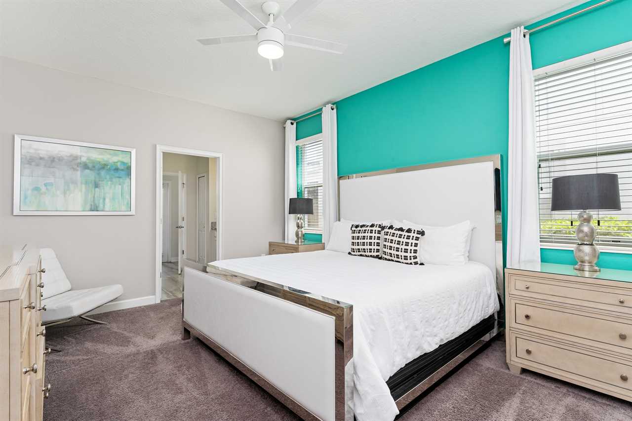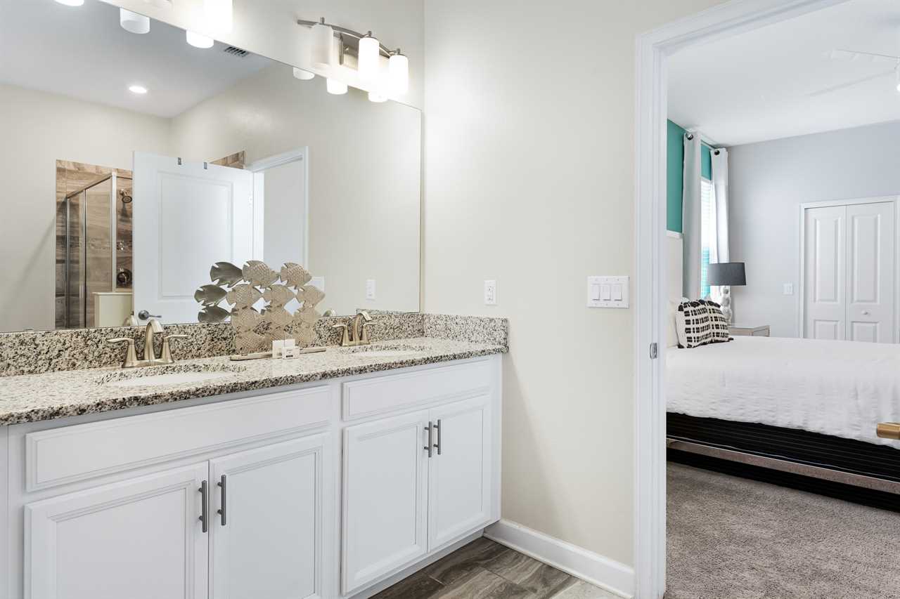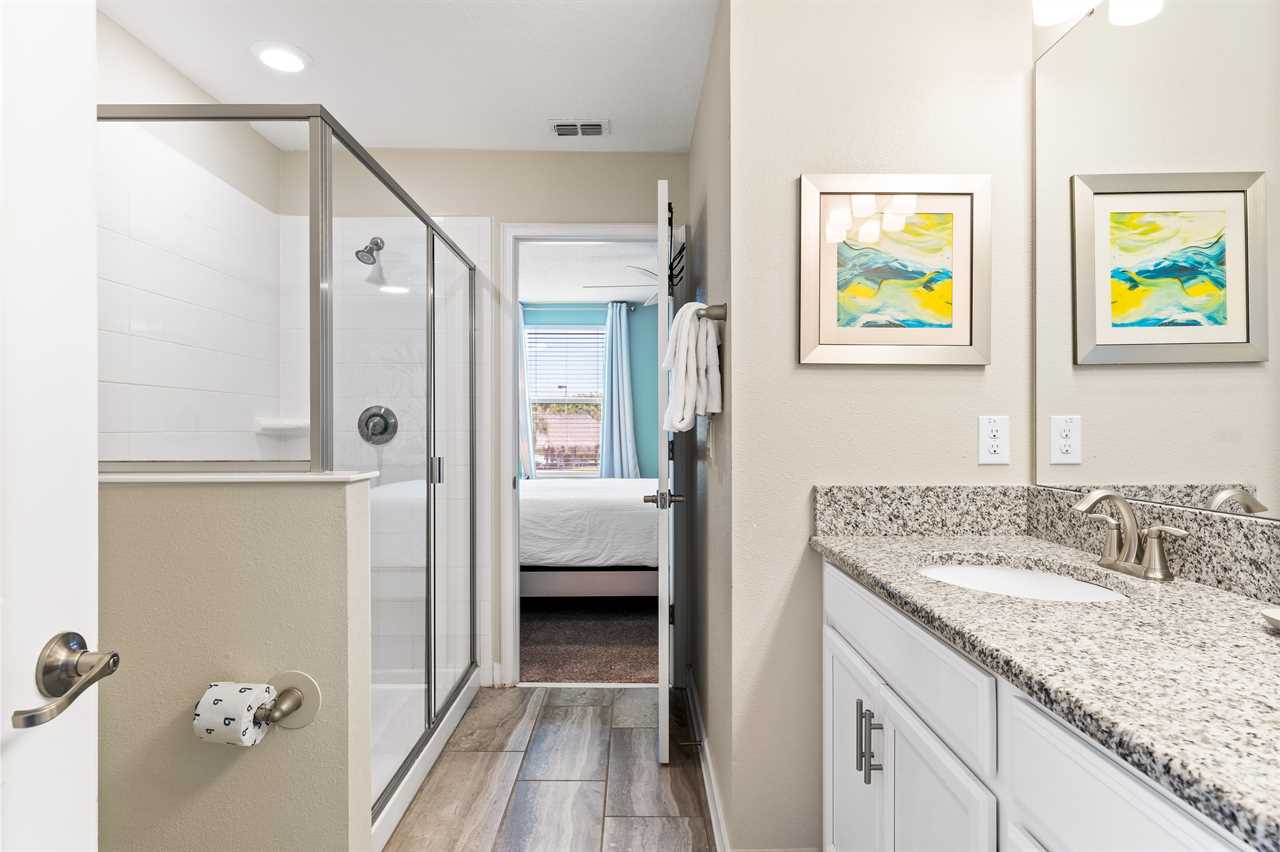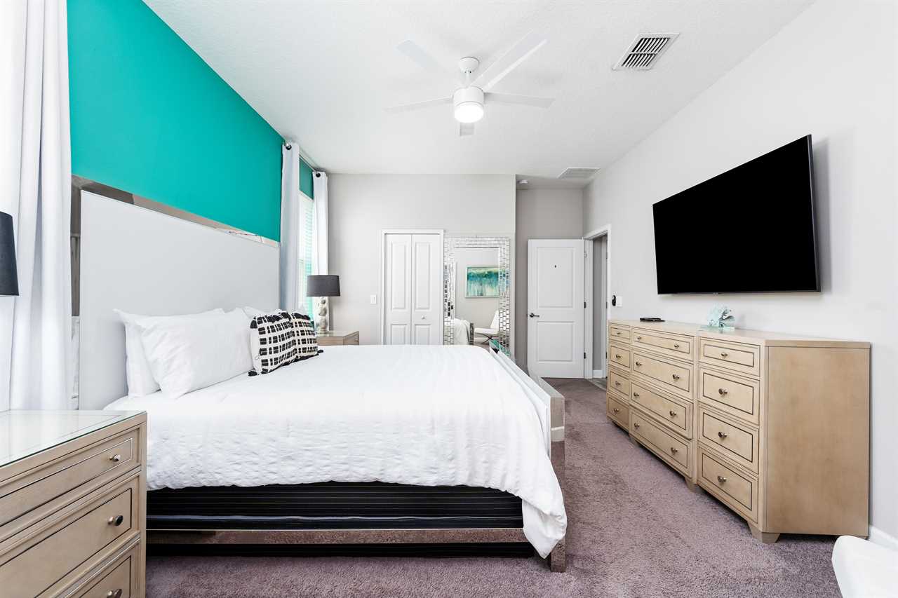 Downstairs, guests will find two of the nine bedrooms. The front king bedroom gives a nice beach vibe with its pink flamingo walls. Guests will enjoy the 70” wall-mounted smart tv with cable, and have access to a shared bathroom that has a double vanity and shower. In the back of the home, the downstairs king master has a bright and airy feel with a teal accent wall. Guests will enjoy a 70” wall-mounted smart tv and have added comfort or a wall-controlled ceiling fan. The master bathroom offers a double vanity, a large soaking tub, and a separate shower. The water closet is closed off and can also provide access to the pool area.