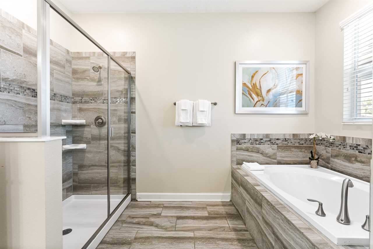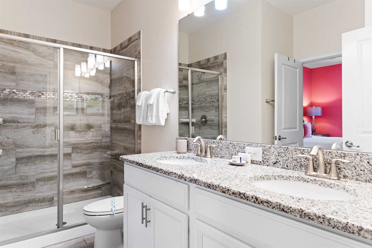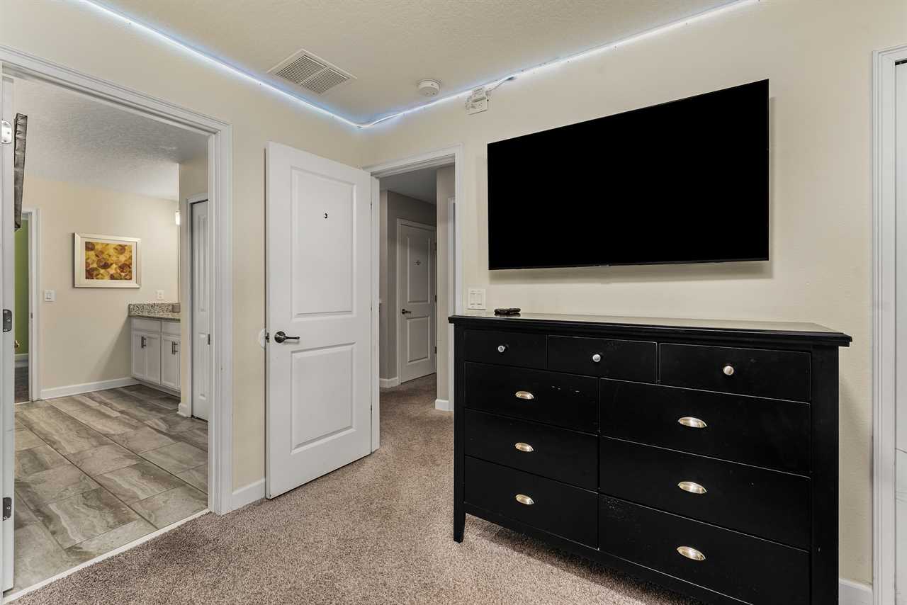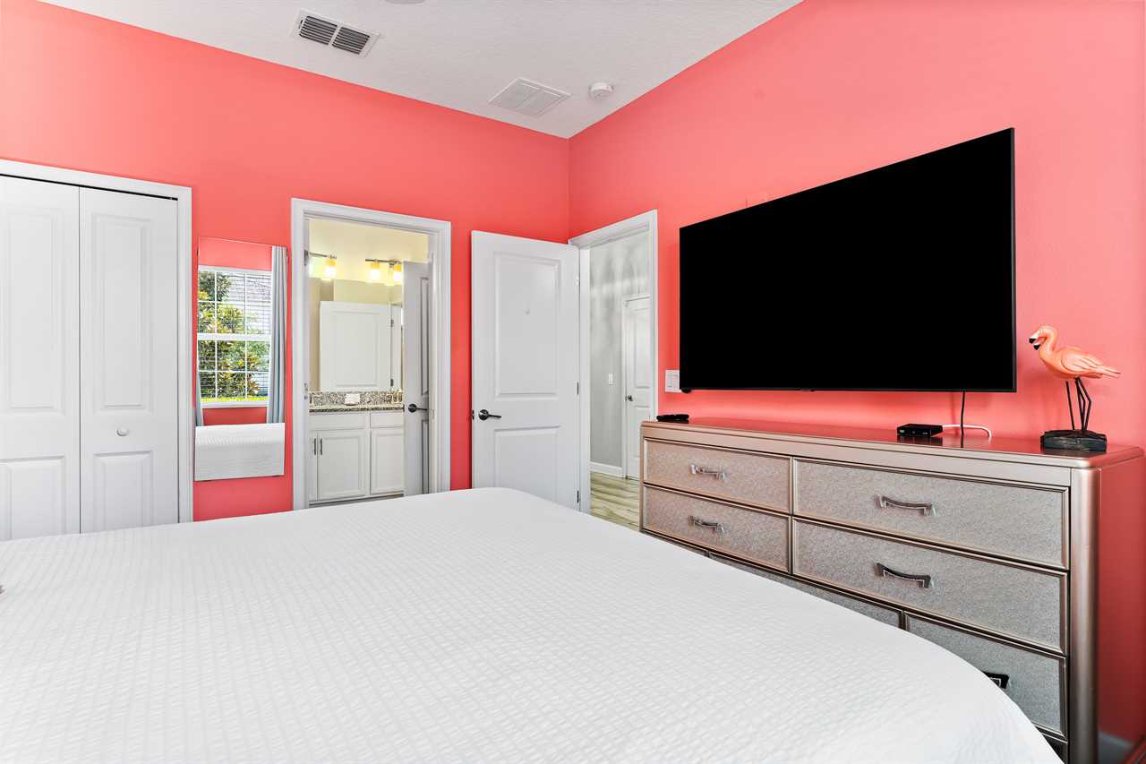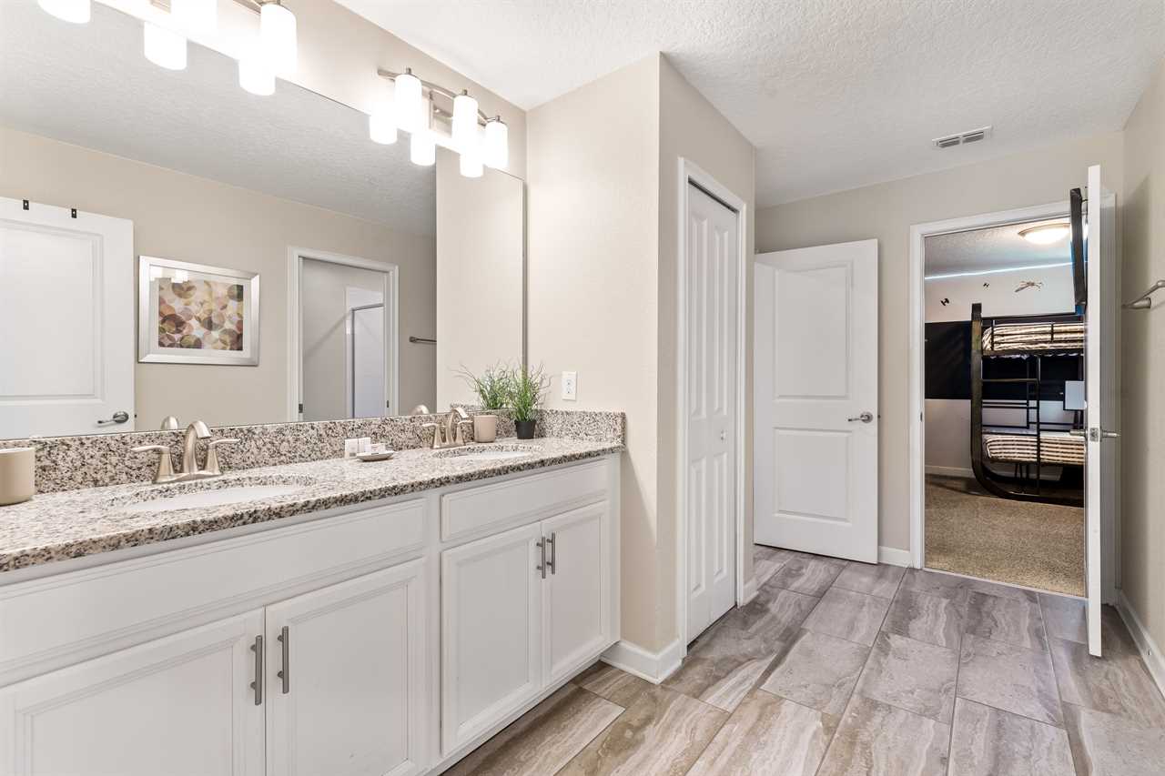 Downstairs, guests will find two of the nine bedrooms. The front king bedroom gives a nice beach vibe with its pink flamingo walls. Guests will enjoy the 70” wall-mounted smart tv with cable, and have access to a shared bathroom that has a double vanity and shower. In the back of the home, the downstairs king master has a bright and airy feel with a teal accent wall. Guests will enjoy a 70” wall-mounted smart tv and have added comfort or a wall-controlled ceiling fan. The master bathroom offers a double vanity, a large soaking tub, and a separate shower. The water closet is closed off and can also provide access to the pool area.