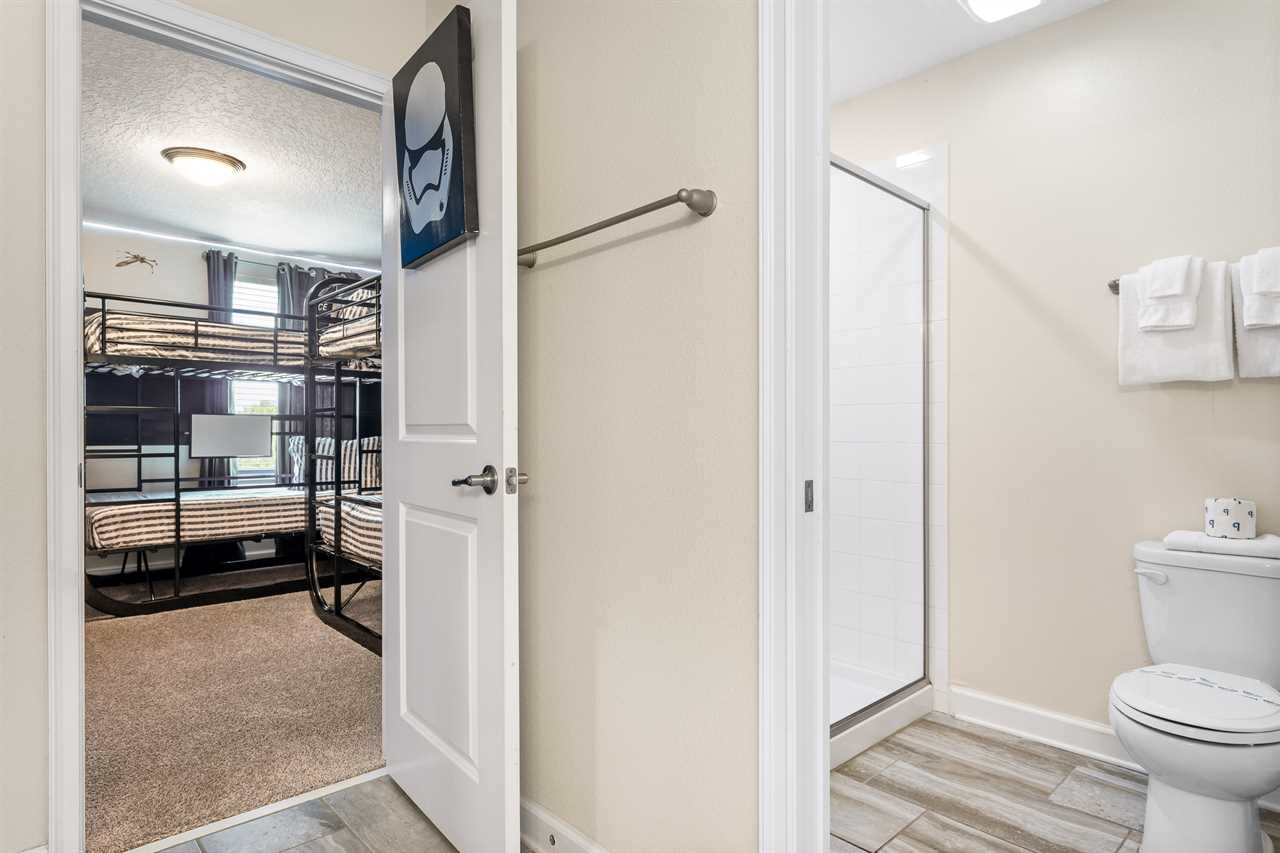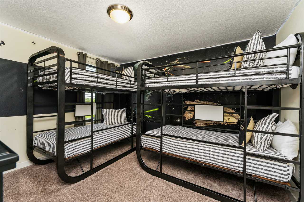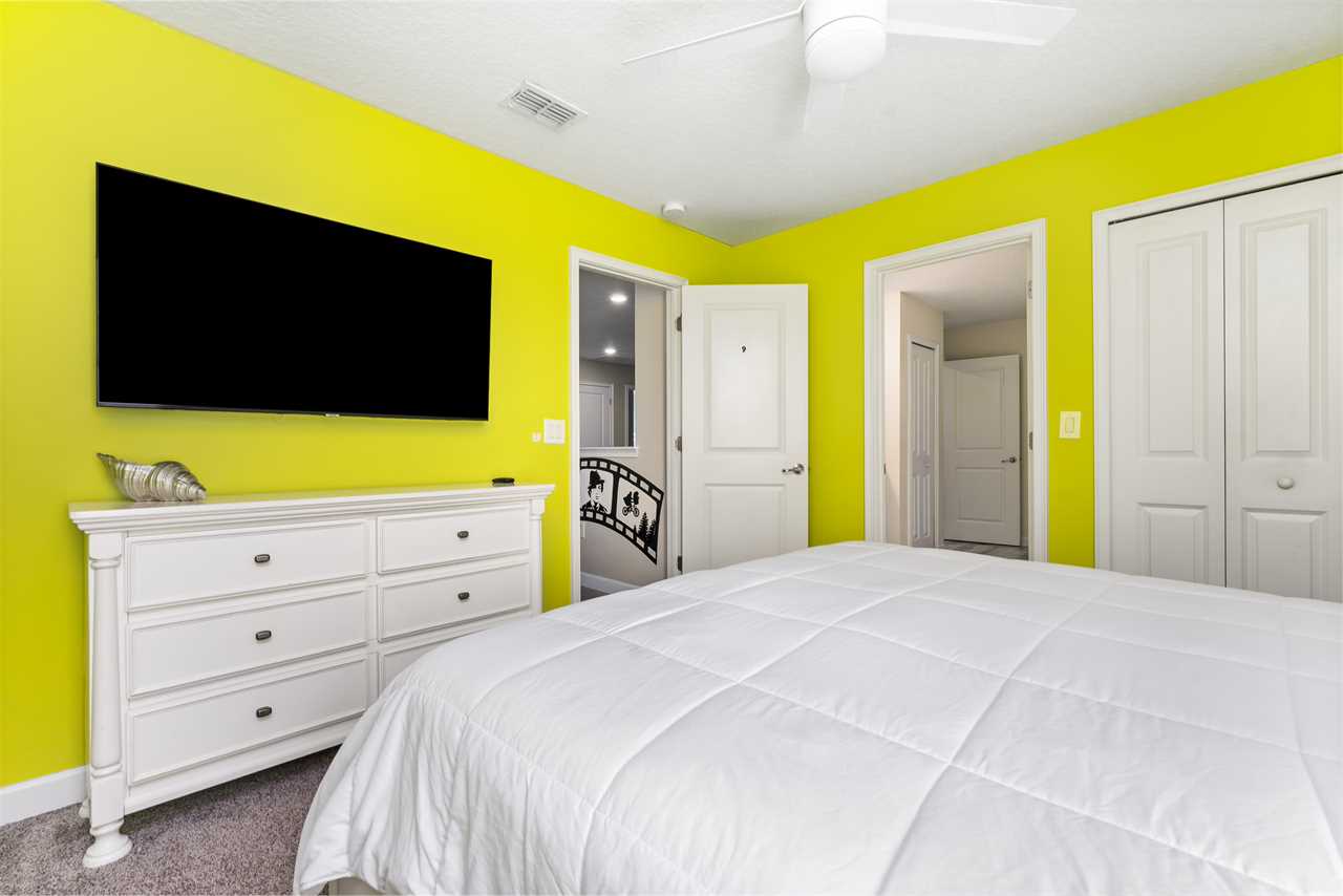 The rest of the remaining bedrooms are also on the second floor. At the top of the stairs, the little galaxy, Travelers will find the resting space in the twin bunk bedroom, which features two twins over twin bunk beds and sleeps for kids. They were winded down with her favorite show or movie on the 55-inch wall-mounted smart TV. This bedroom shares a Jack and Jill bathroom with double vanity and shower, with the upstairs yellow king bedroom this stylish bedroom offers guests, a 55-inch wall-mounted, smart TV and wall-controlled ceiling fan for attic comfort.